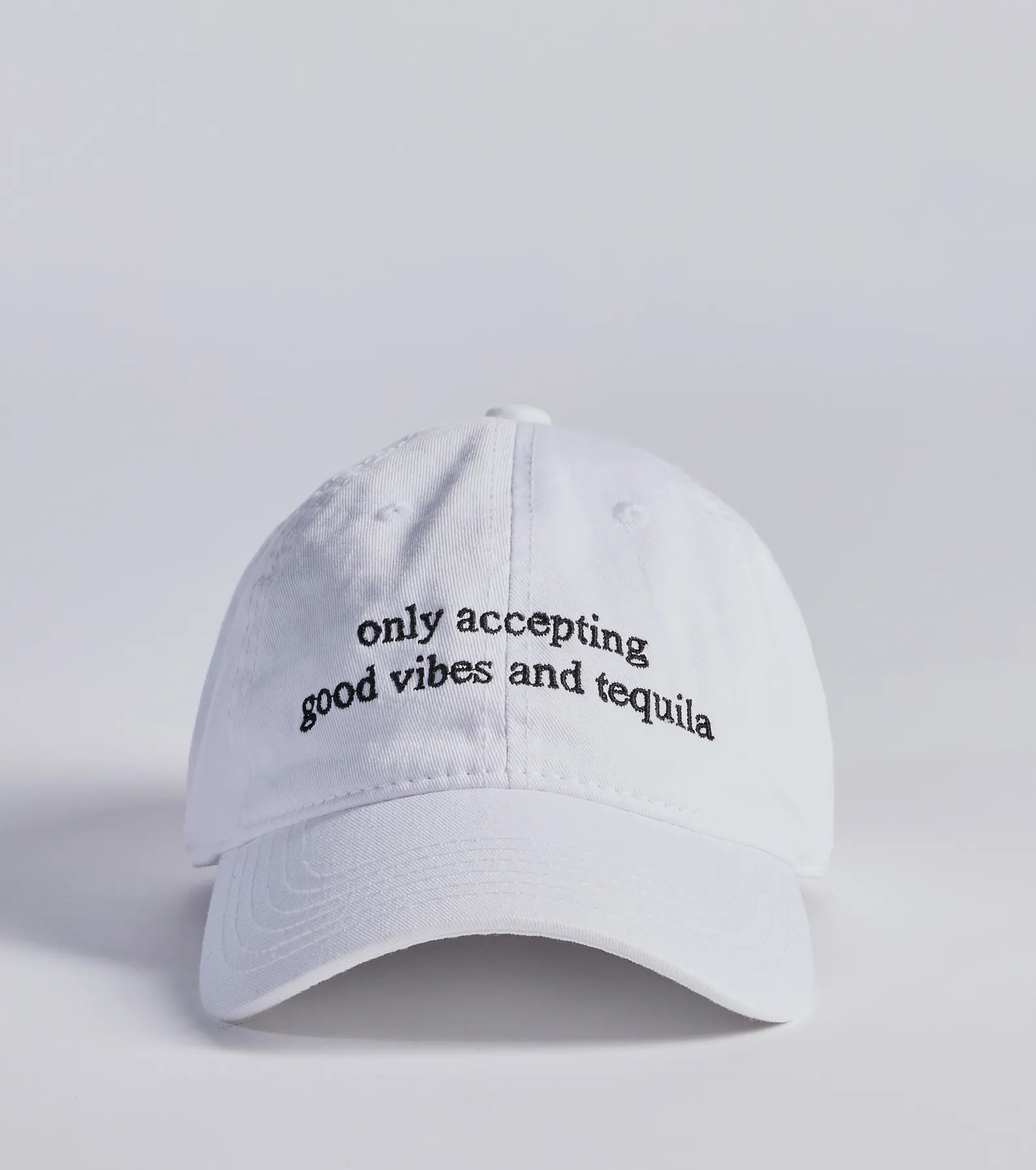 This cute baseball cap captures the motto to live by! It features a traditional baseball cap design with a round top. a curved brim. a back adjustable strap. and a fun embroidered script that reads. only accepting good vibes and tequila. Style with for happy hour with the girls!