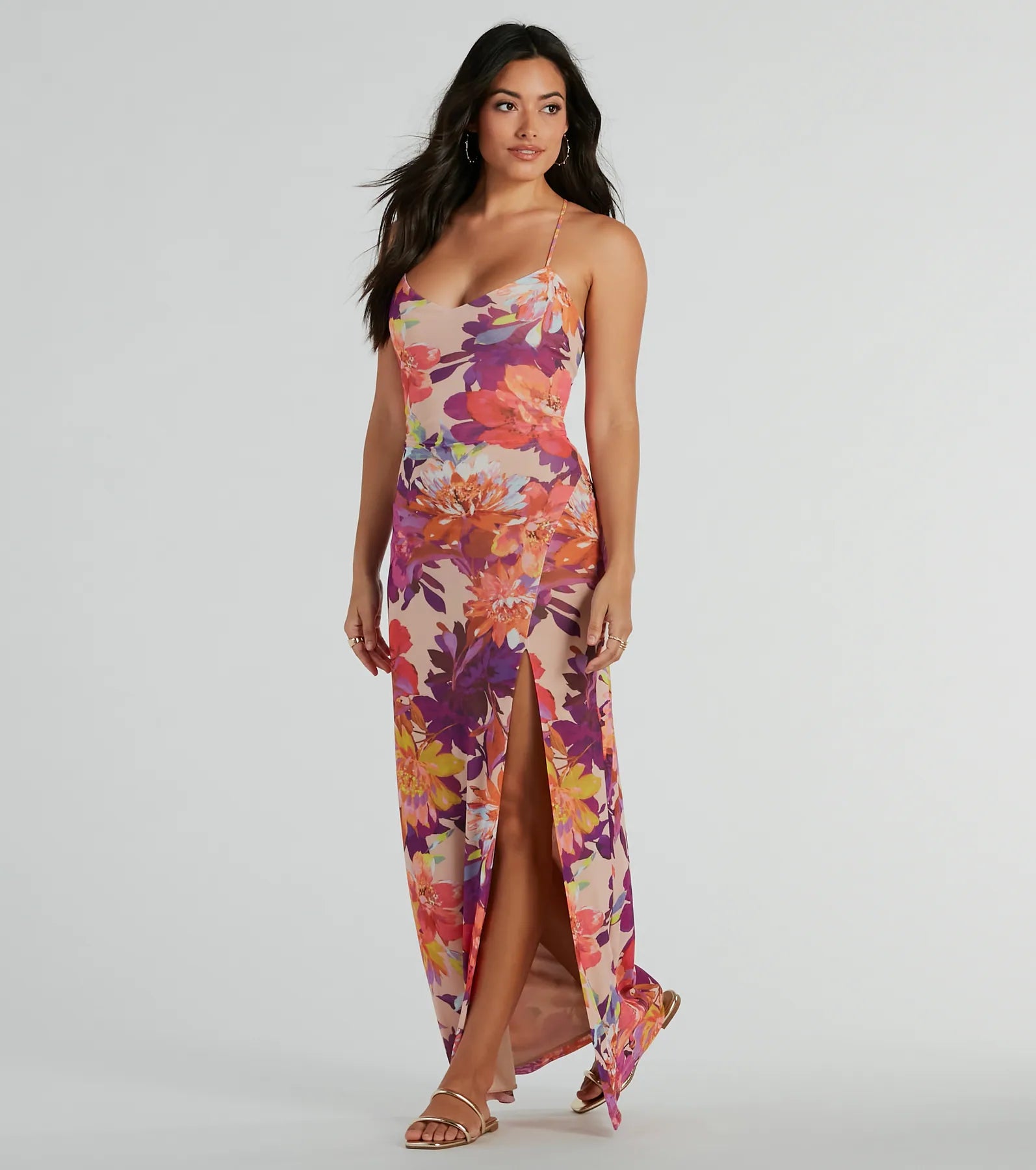 Look like a babe in paradise in this tropical floral maxi dress perfect for your next getaway or beach day! Embrace the warm. tropical vibes in this maxi-length hem dress on an airy mesh fabric bursting with a tropical floral print.? With its flowy silhouette and high slit. you’ll feel like you’re walking on clouds. The V-neckline and spaghetti straps add a trendy vibe while the lace-up detail adds a touch of playfulness. Complete the look in and sunnies!