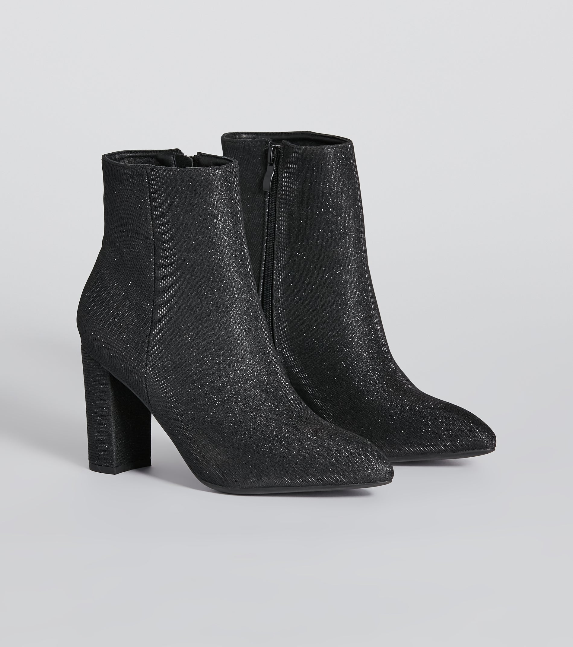 Get the party popping in these glitter mesh booties for the ultimate sparkle! They feature a pointed toe. a block heel. inner zipper closure. and an ankle-length fit. Complete the look in a sultry for a holiday party!