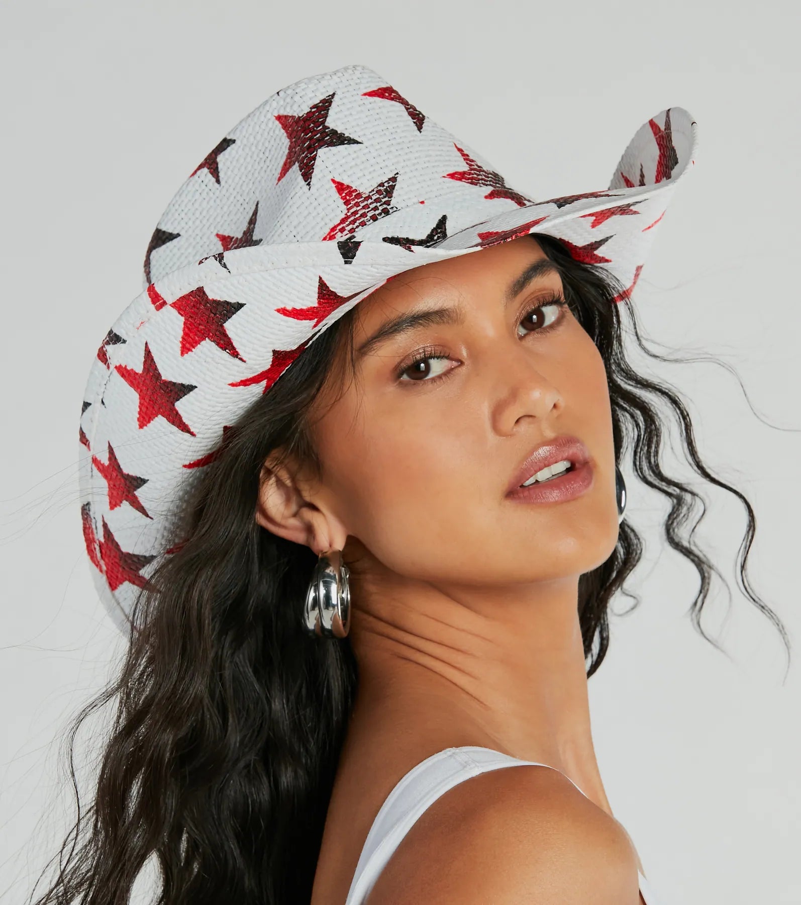 Flaunt the red. white. and blue in this Americana star cowboy hat featuring classic curved wide brim and inner adjustable strings to get the perfect fit! Complete the look in a hot and denim shorts for a festival. concert. or backyard party!