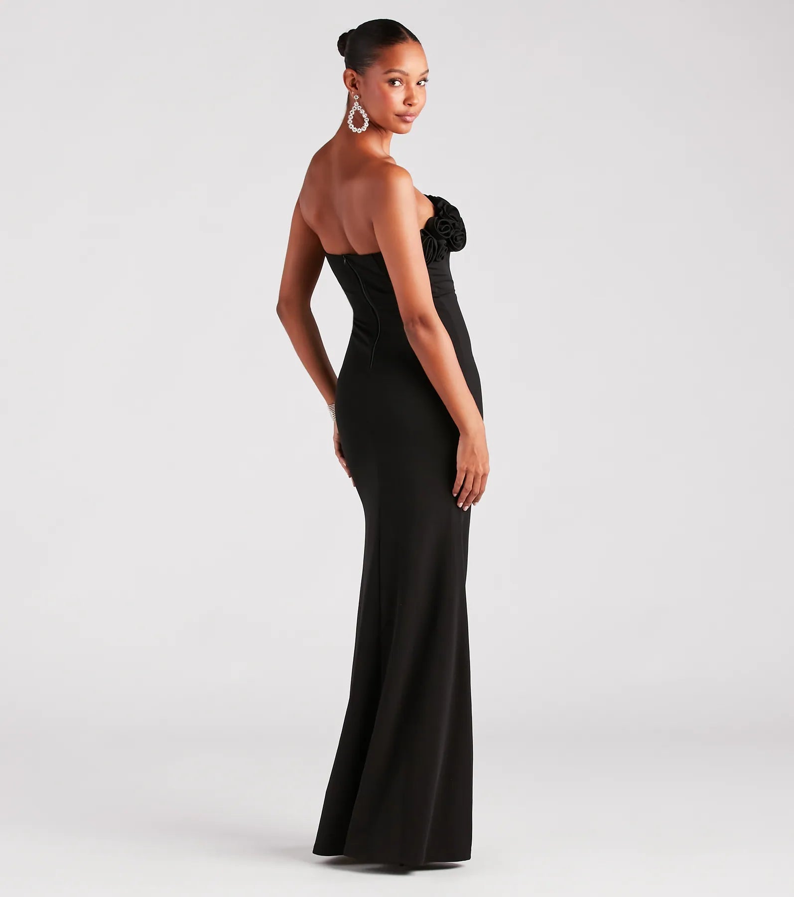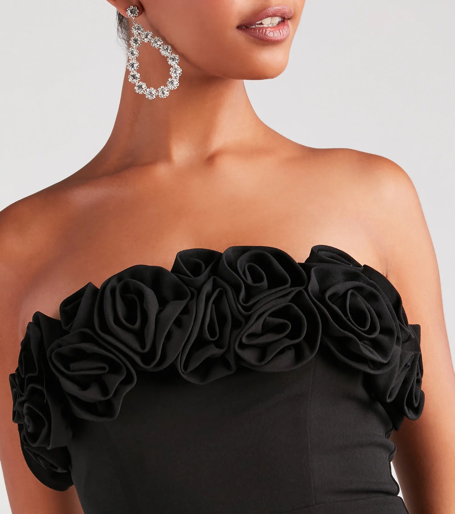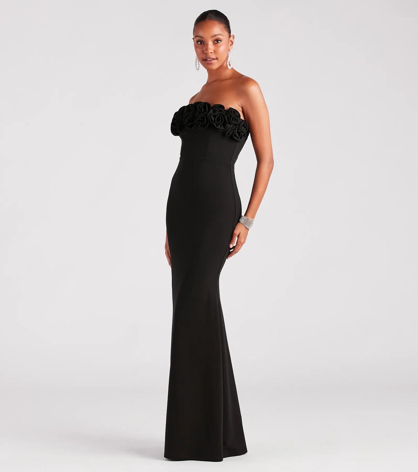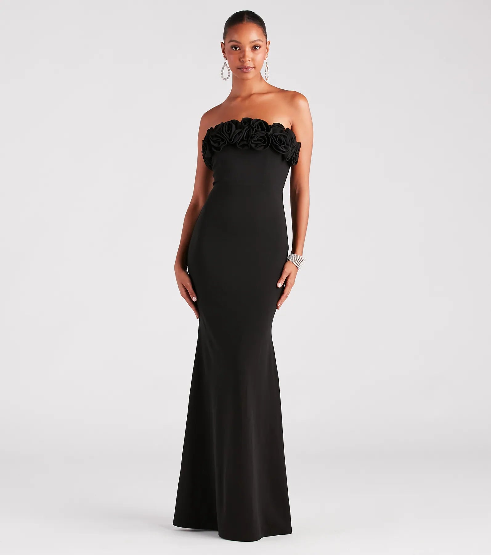 Pretty 3D rose flowers create a romantic allure on the Paulina formal dress – perfect for all of your upcoming fancy soirees! She features a strapless neckline with a gorgeous array of rose flowers along the front. a non-slip grip lining. and a flattering mermaid silhouette that drapes gracefully into her floor-length hem. The formal dress is composed of a sleek crepe fabric with a stretchy knit lining. Complete the look in and a clutch!