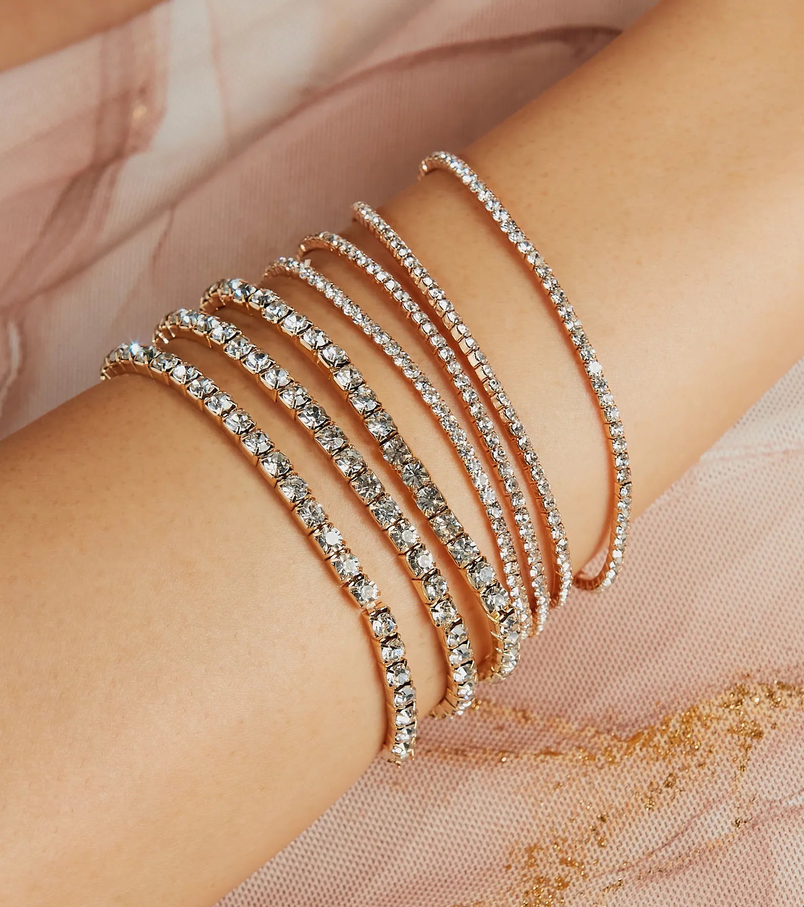 Unveil the perfect shine with this sleek rhinestone stretch bracelet set. The multi-pack features seven stretch bracelets with a single-row design and varying-sized rhinestone embellishments for a glitzy sparkle. Stack them all together and style with !