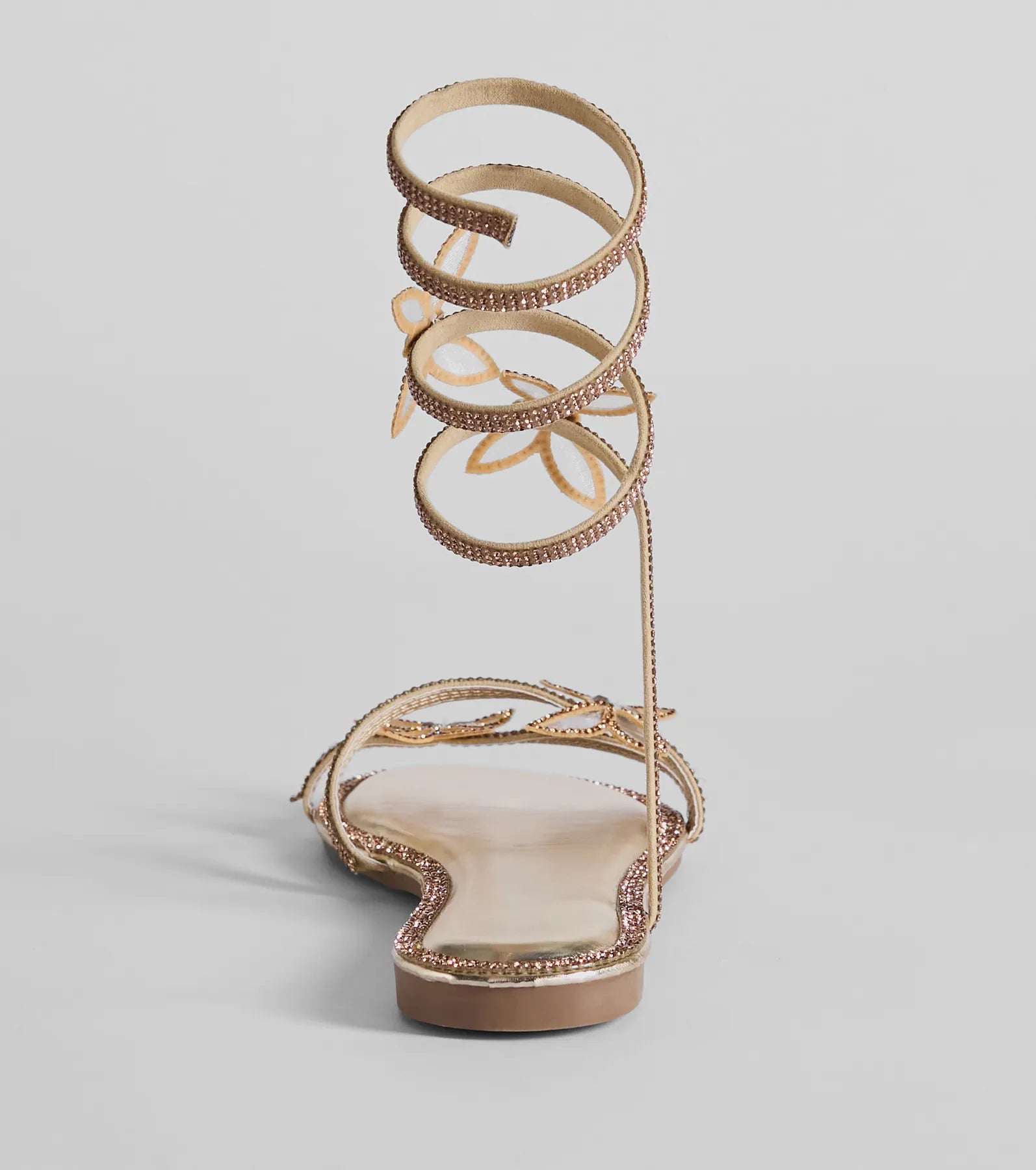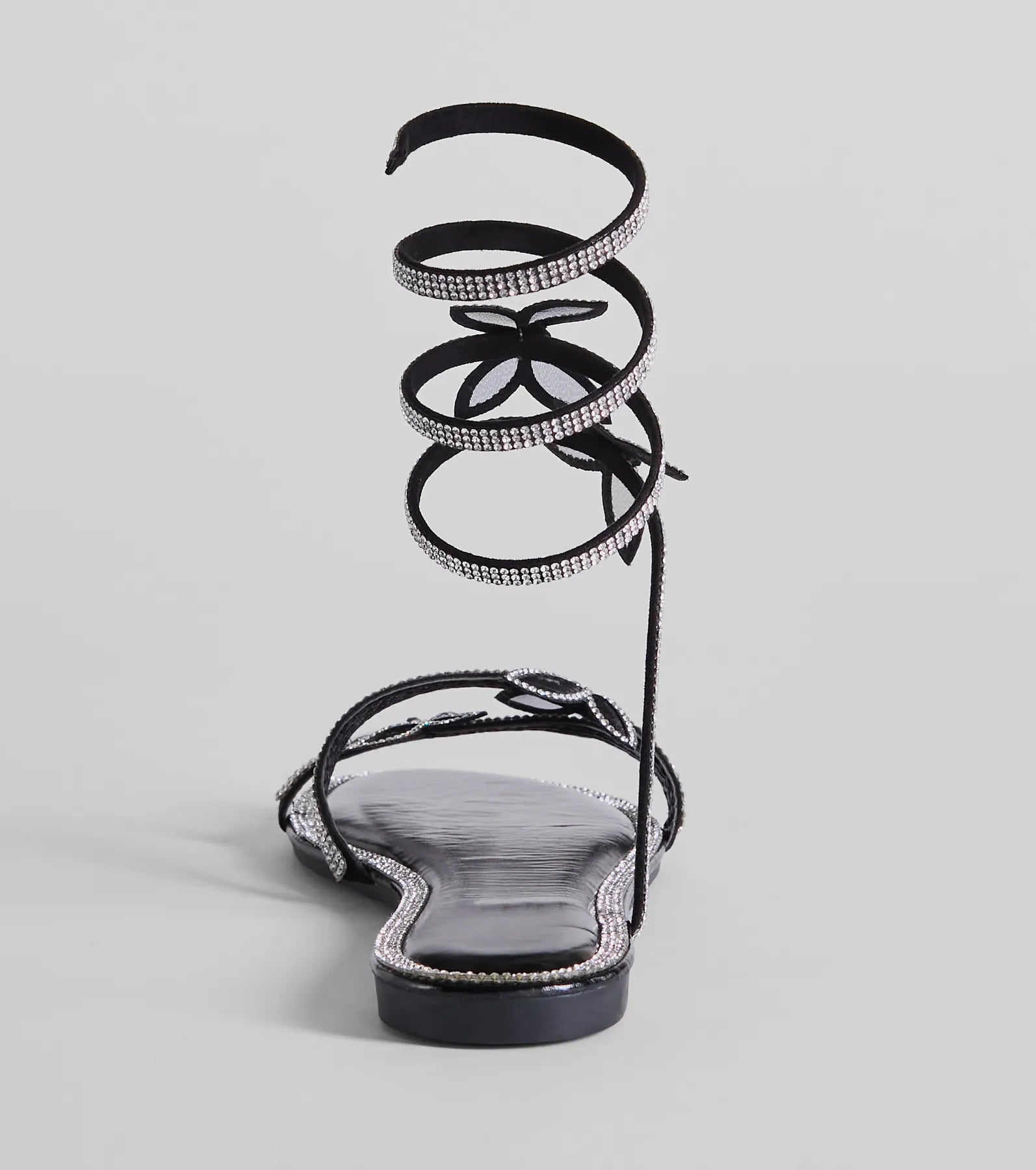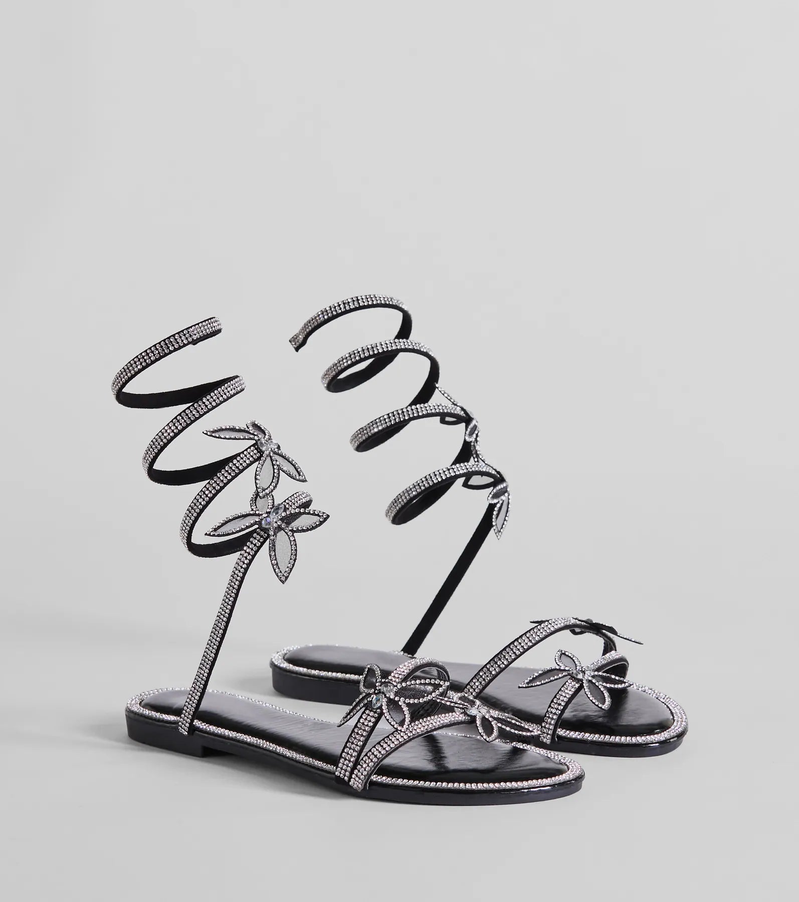 Create a perfectly glam vibe with these rhinestone butterfly strappy sandals! Designed with sleek faux leather. they feature an almond-shaped toe. a dual toe strap and trendy spiral strap design. mini rhinestone embellishments for that glitzy shine. and organza butterfly accents with rhinestone detailing. They include a flat sole with a padded insole for comfortable wear. Style with a !