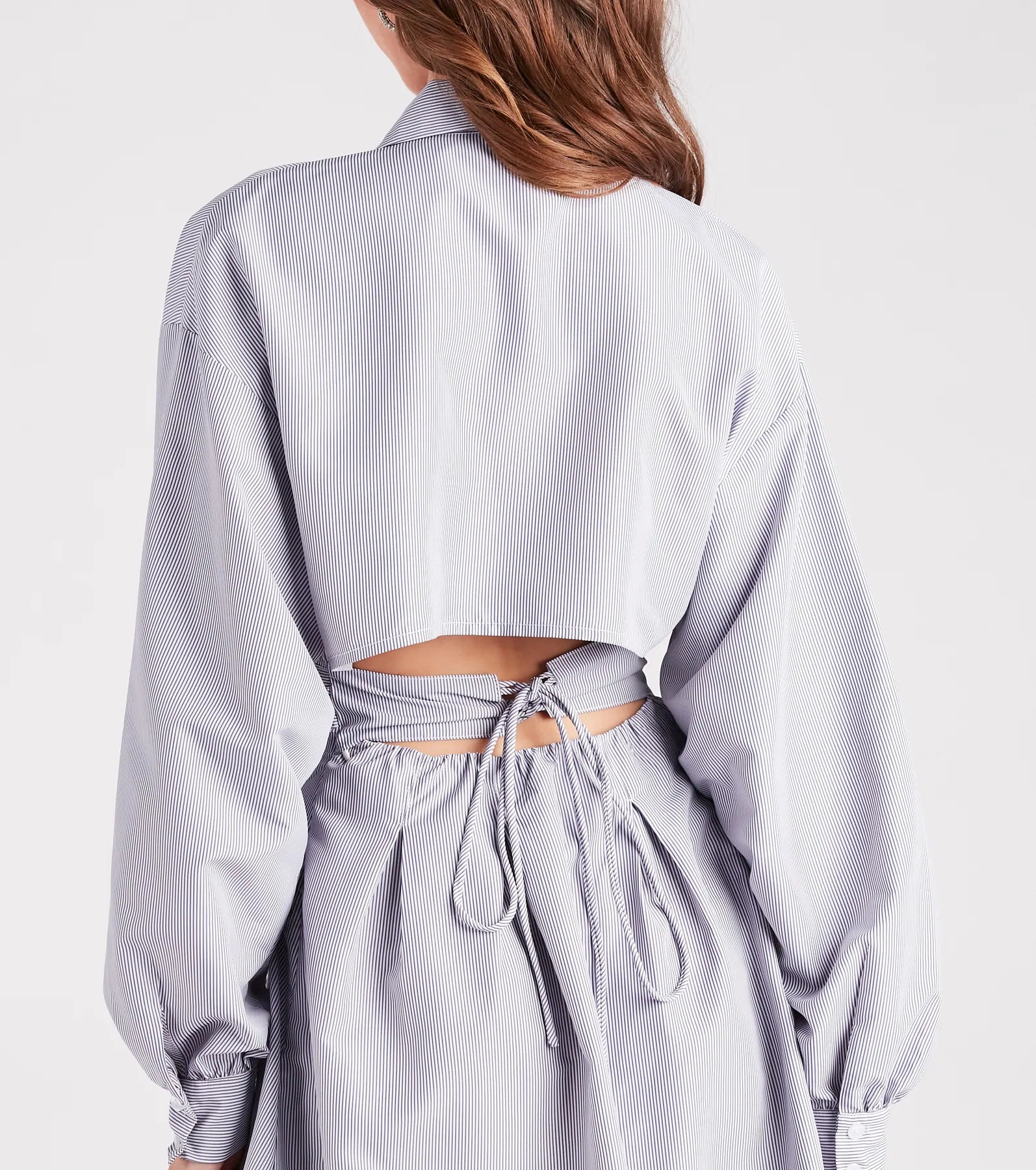 Step out in this perfectly striped shirt dress to look cute for picnics in the park. family gatherings. or graduations! It features long sleeves with buttoned cuffs. a collar v-neckline. a corset-seam illusion waist. a cutout lace-up back design. and a short skater silhouette. Complete the look with .