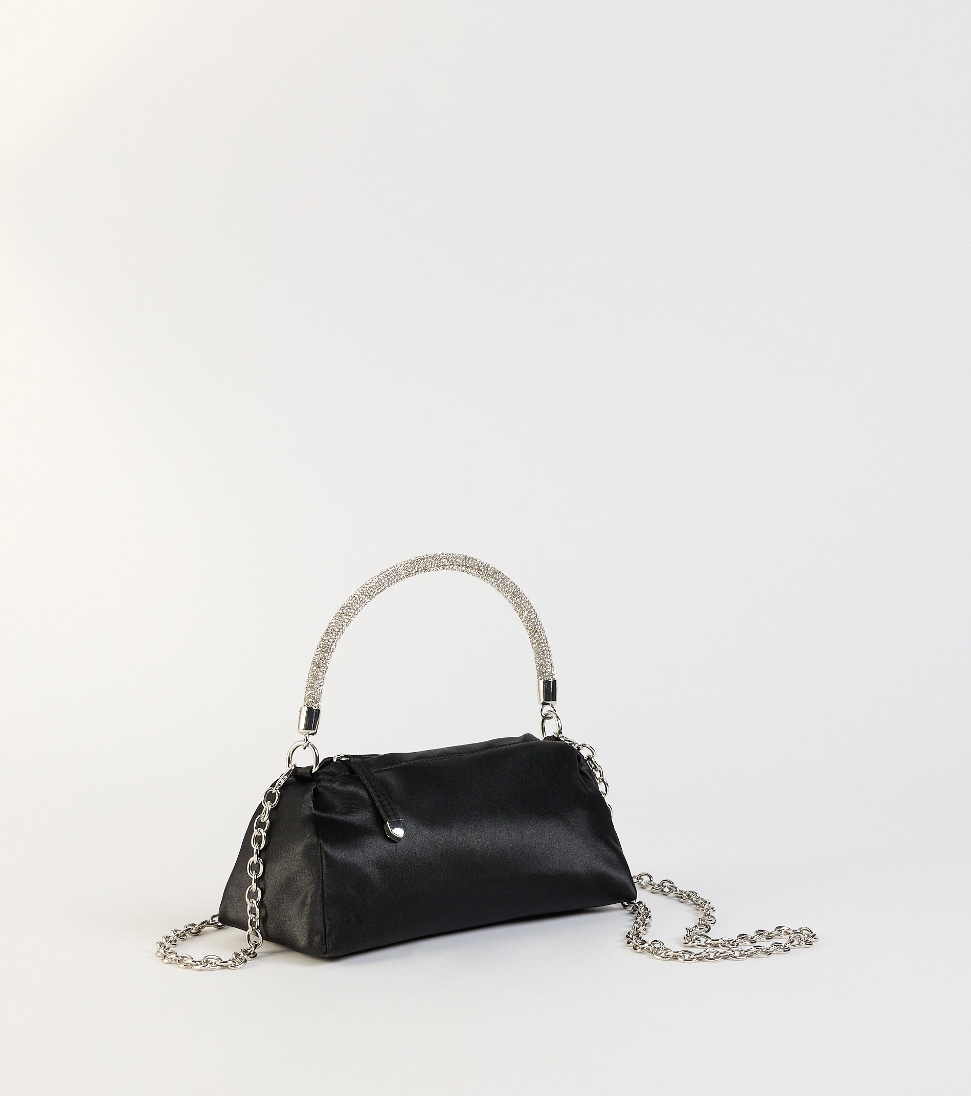 A mini satin bag that adds luxury to your look with a rhinestone embellished handle perfect for dressy soirees!
