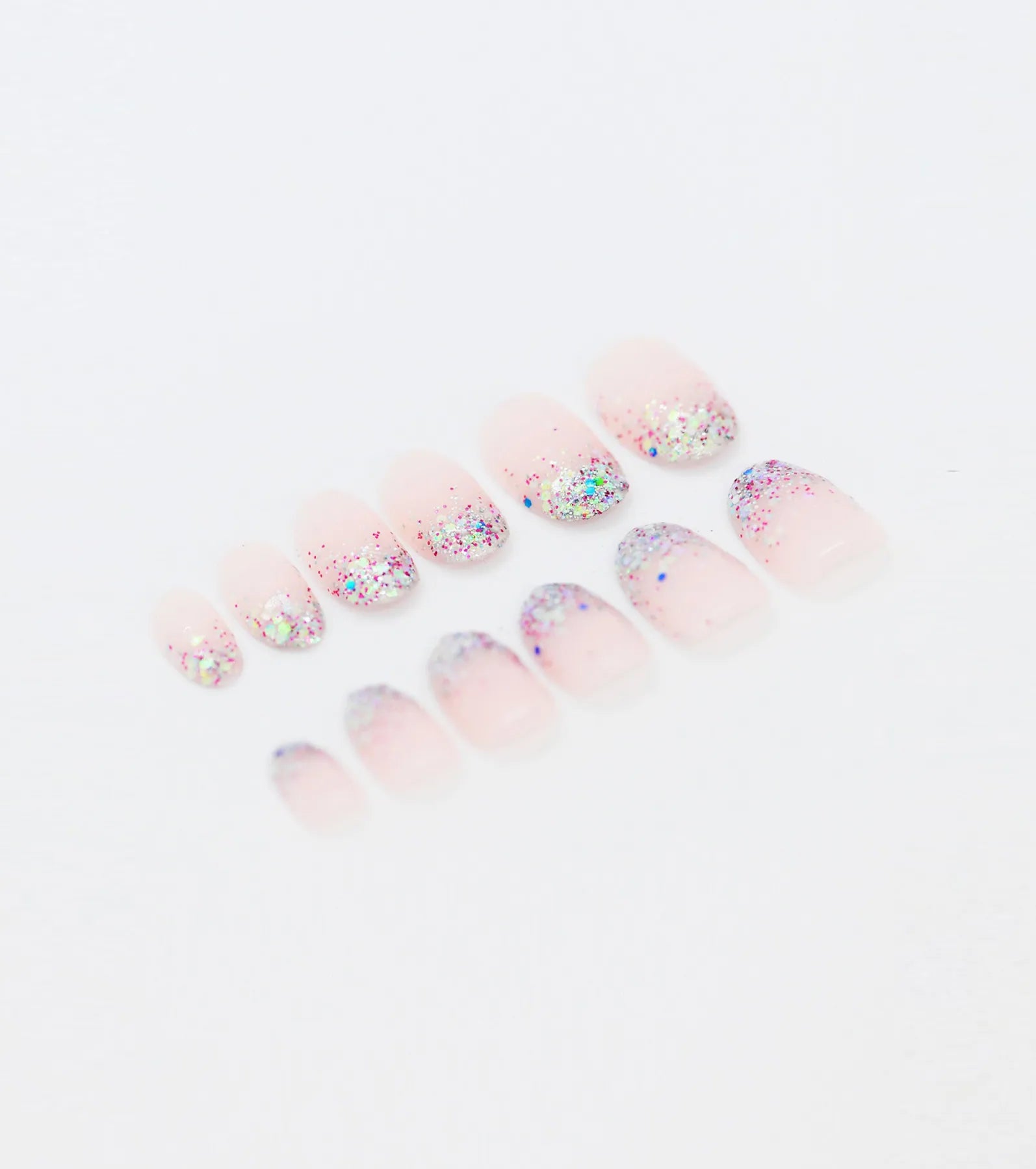 Sparkle from your fingertips with this pixie dust press-on nail kit including everything you need to achieve a glittering look! The exclusive kit offers two sets of glitter press-on nails with pixie dust for extra shimmer. one mini nail file. a prep pad. and glue. Follow the easy instructions on the prep pad for the best results. Complete the look with a sassy for a party!