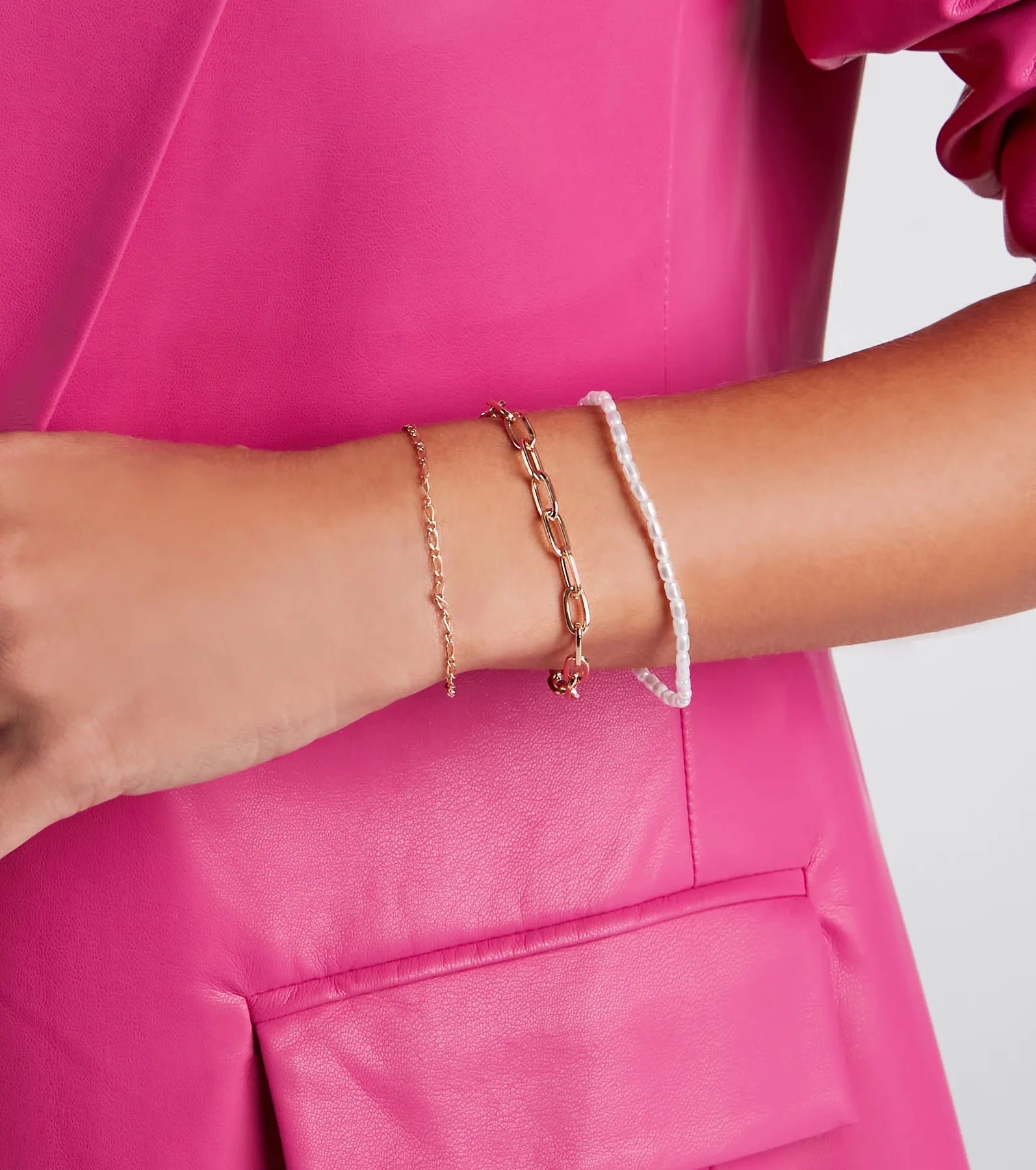 You’ll love the pretty details of this dainty assorted bracelet set! The multipack features three bracelets with varying designs including a thin chain. a thicker chain. and a faux pearl-beaded design. Wear them all together styled with .