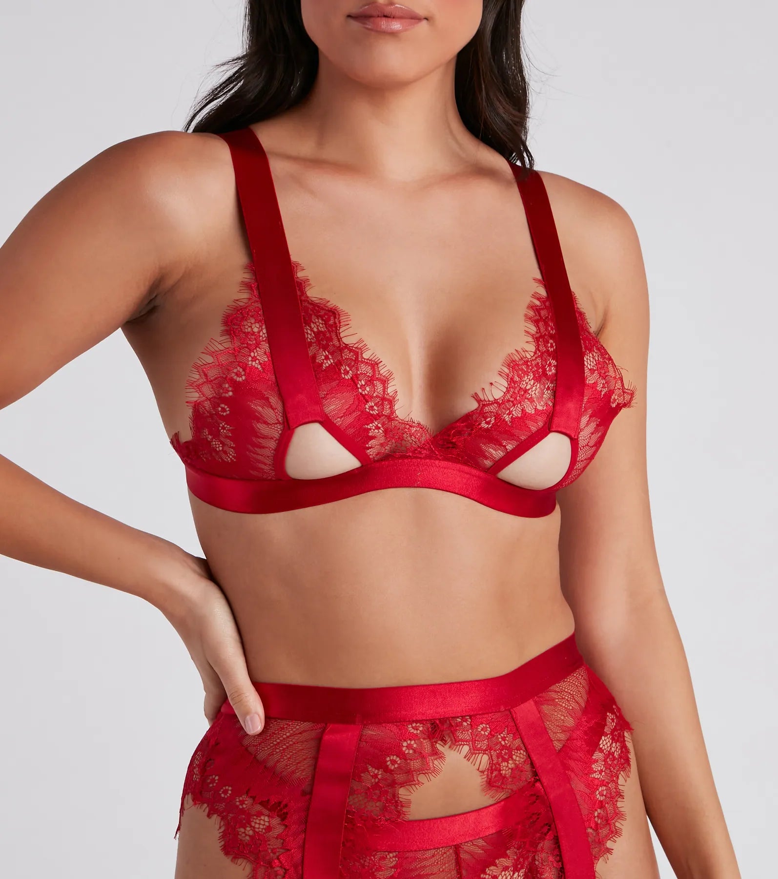 The best-kept secret to surprise your boo! Give them a show in this sultry lingerie set perfect for a romantic night. The bra features sheer eyelash lace. a v-neckline. wide adjustable straps. and cutout accents along the cups with matching high-rise thong panties. The garter belt features a wide elastic band with sheer eyelash lace. back hook closure. and attached elastic straps with leg bands and hook closures. Complete the look with simple