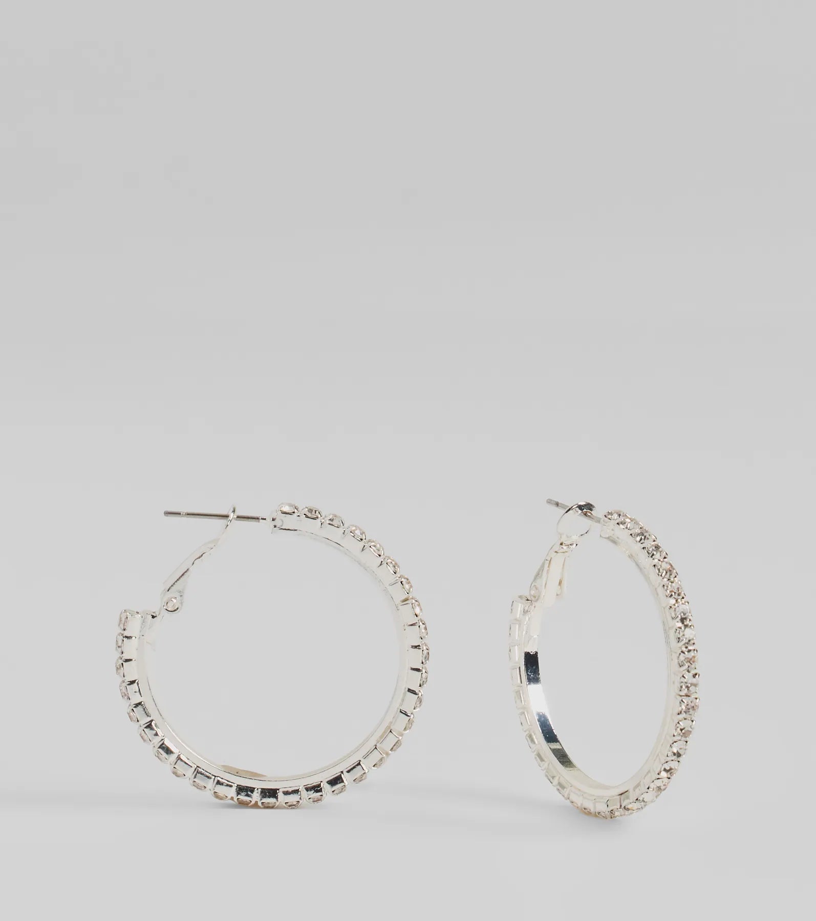 Add a pretty sparkle to all of your ‘fits with these gorg rhinestone hoop earrings! They feature a medium metal hoop design with all-around rhinestone embellishments. Include an omega closure. Style these hoop earrings with a for everyday glamour!