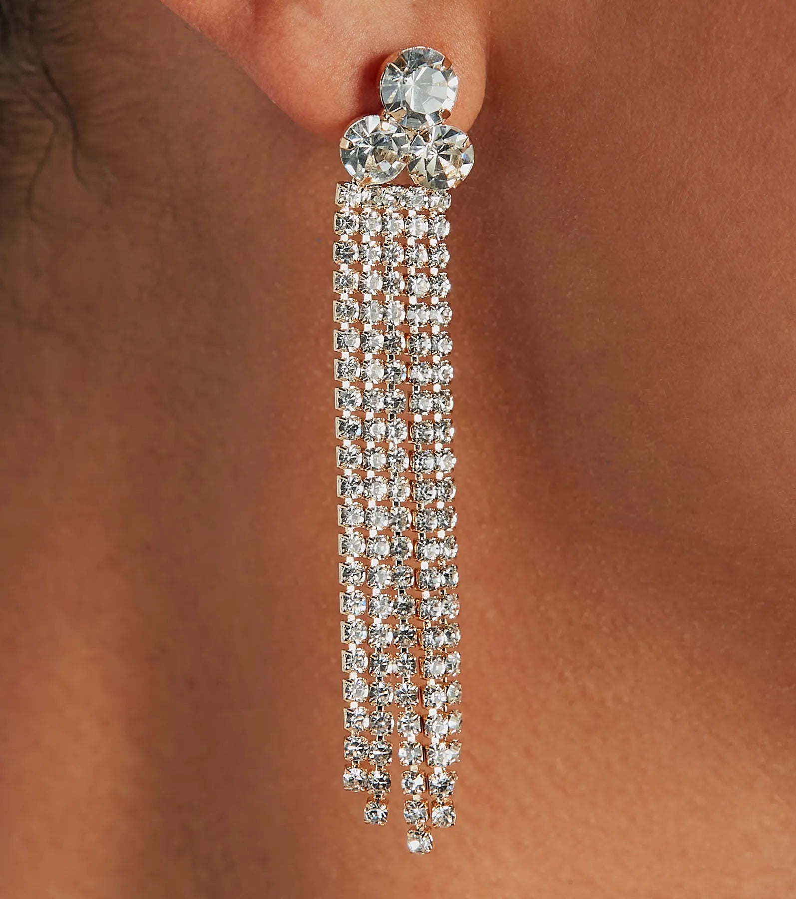 Raise the bar in these statement rhinestone earrings to adorn your formal dress! The earrings are designed with three rhinestone cluster posts with cascading rhinestone fringe in a linear style. Complete the look in a for a special event!