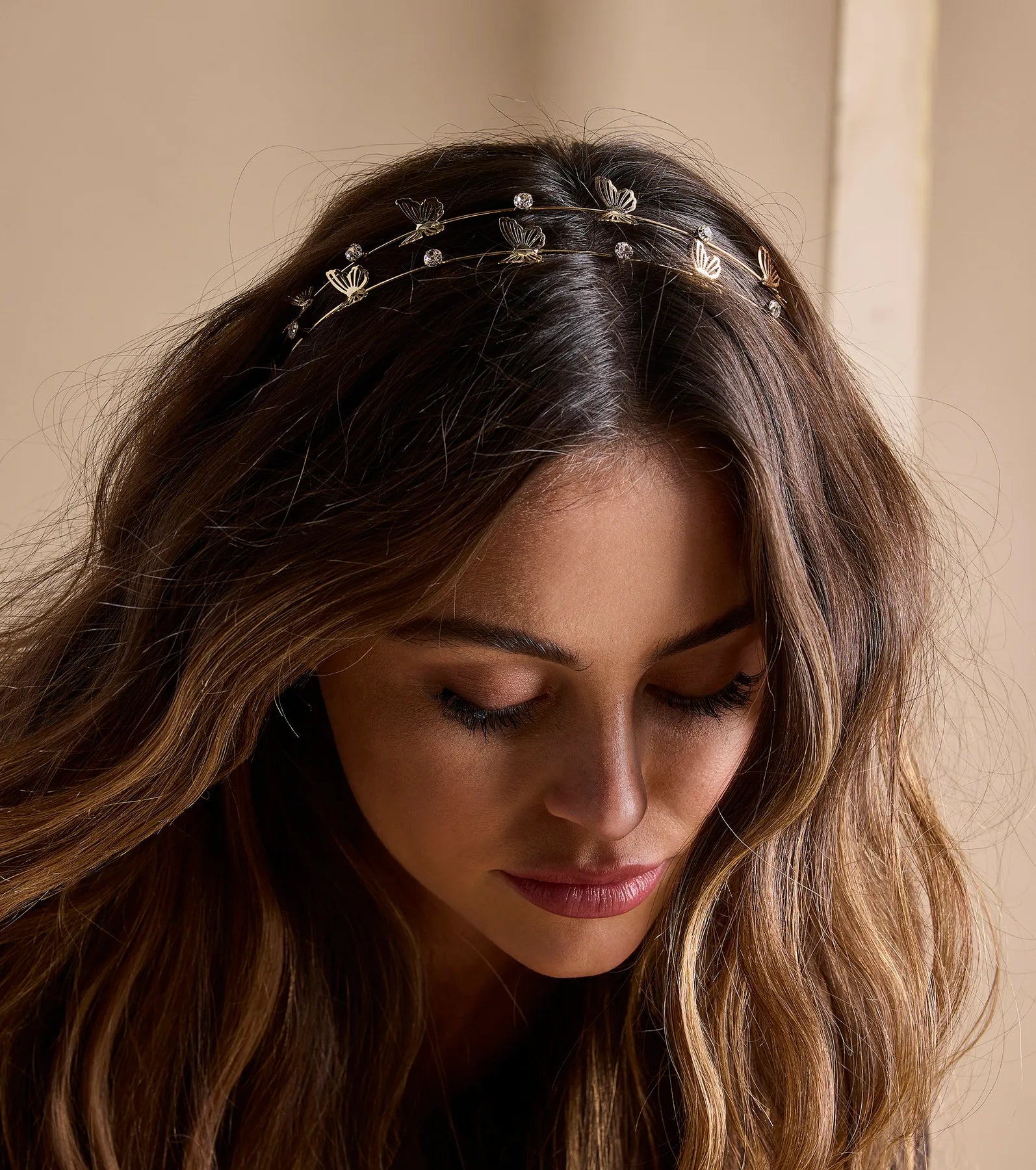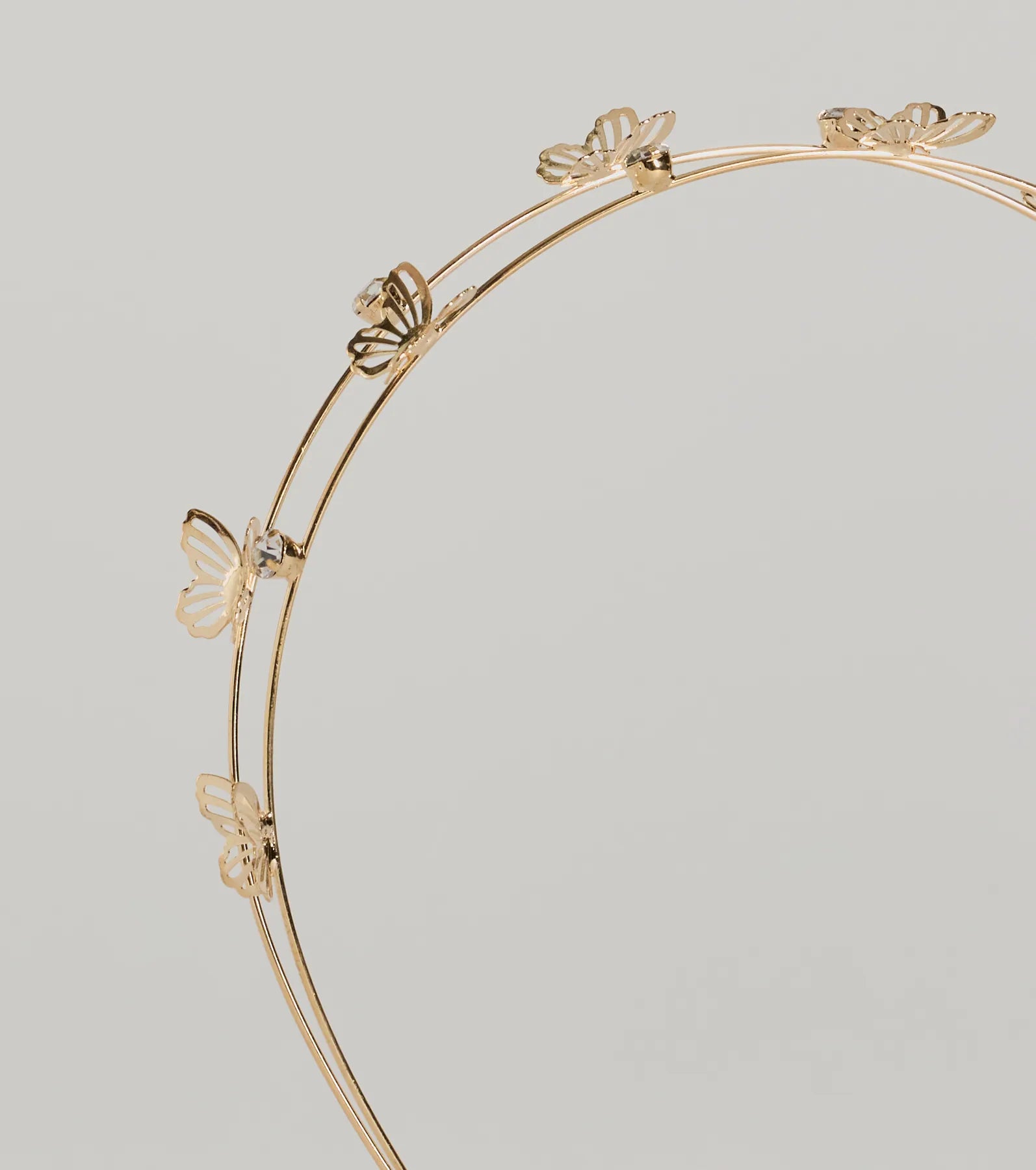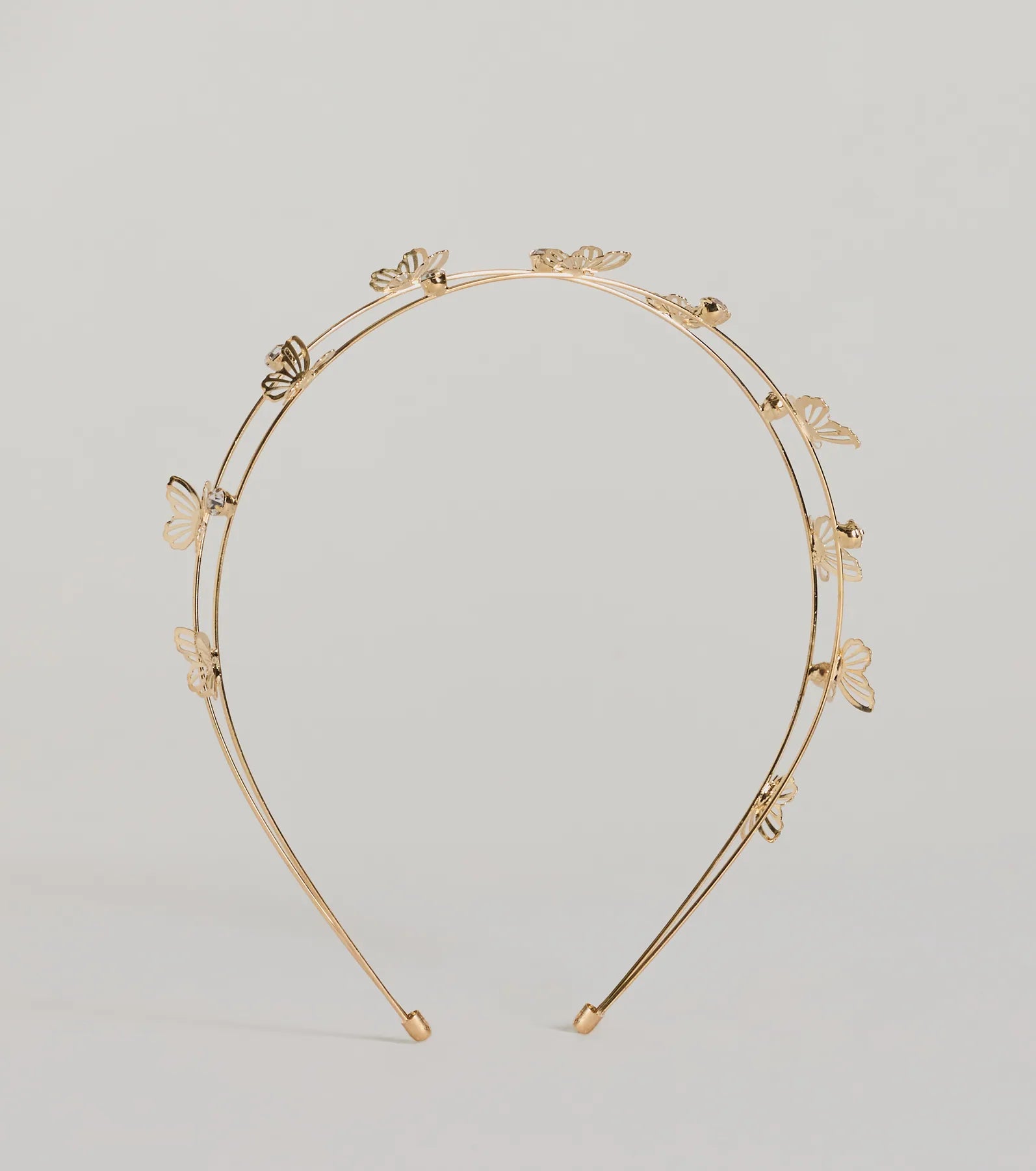 A statement headband features rhinestone embellishments and butterflies on dual sleek bands. Perfect for styling with heels.
