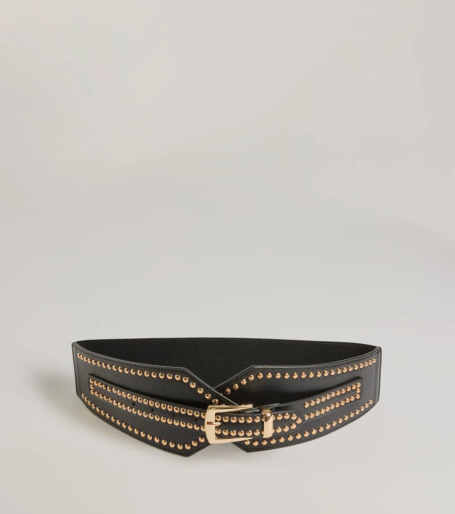 A faux leather studded stretchy belt that adds a rebel edge to your outfit. Pair with a sleeveless halter dress.
