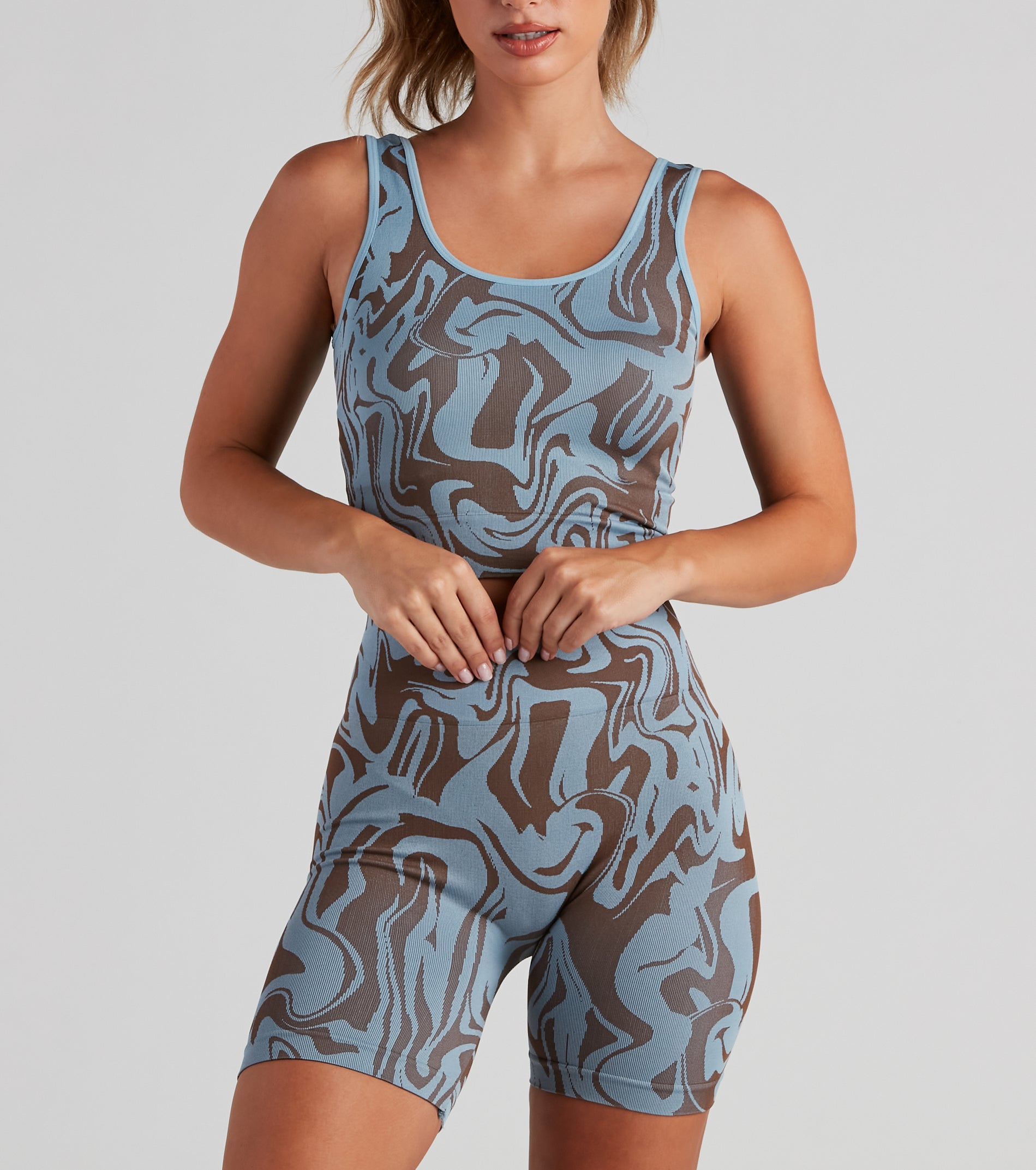 Go retro in?sleek seamless shorts that are perfect for lounging in or running errands! The shorts feature a high-rise waist. a chic swirl pattern. a mid-thigh length. and a seamless fit throughout. The shorts are composed of a smooth knit fabric that offers a form-hugging fit with a moderate stretch. Complete the look with the matching bralette.
