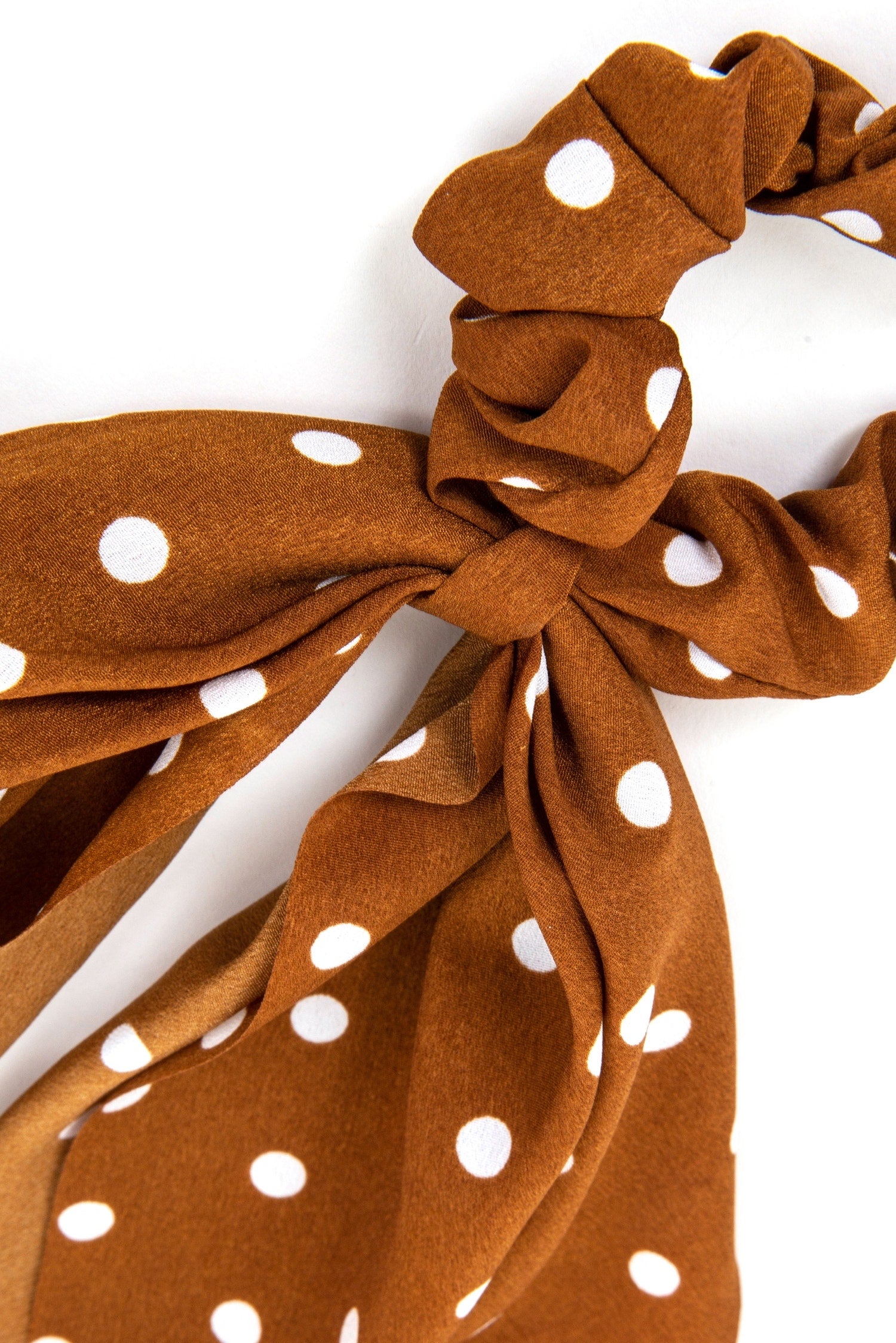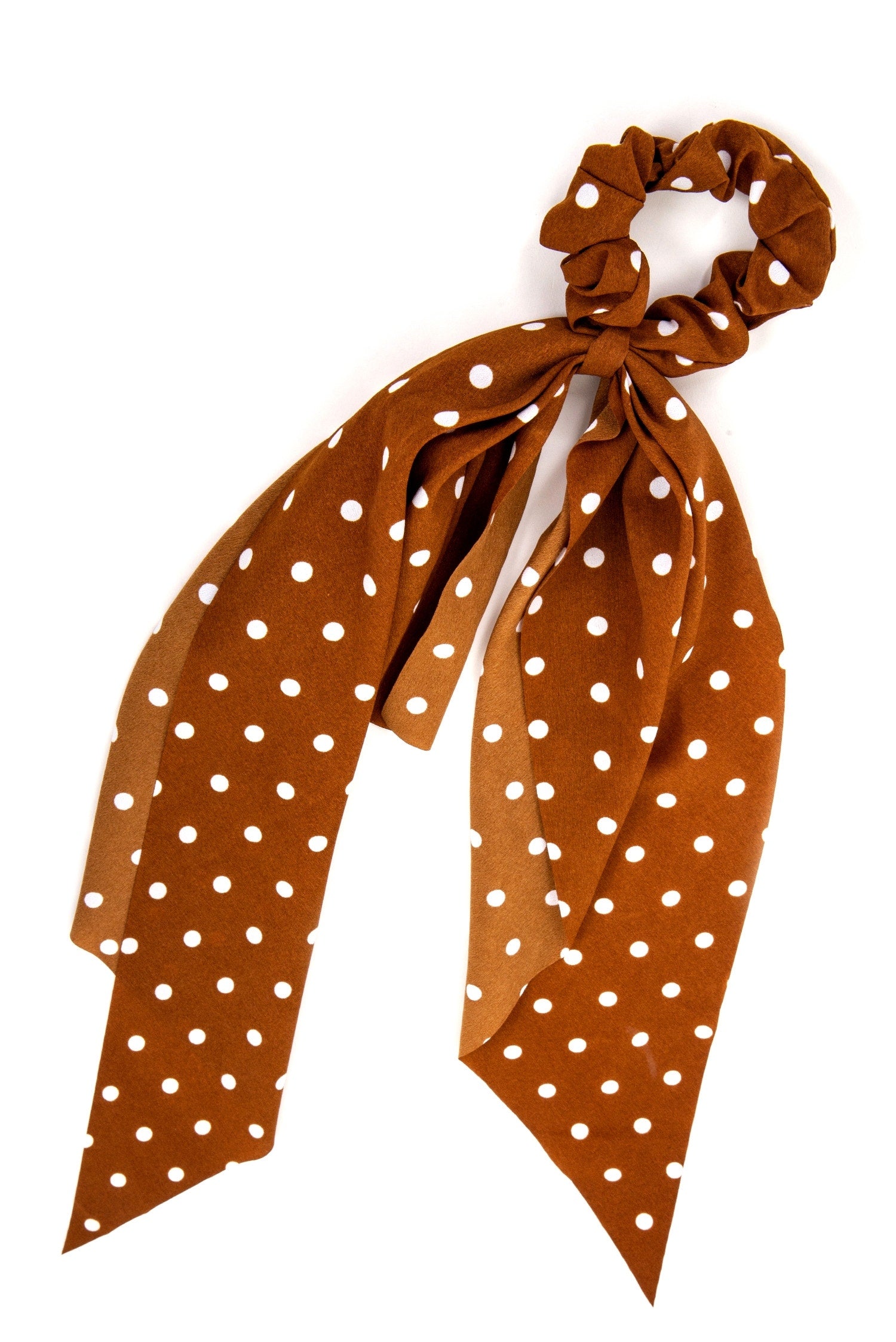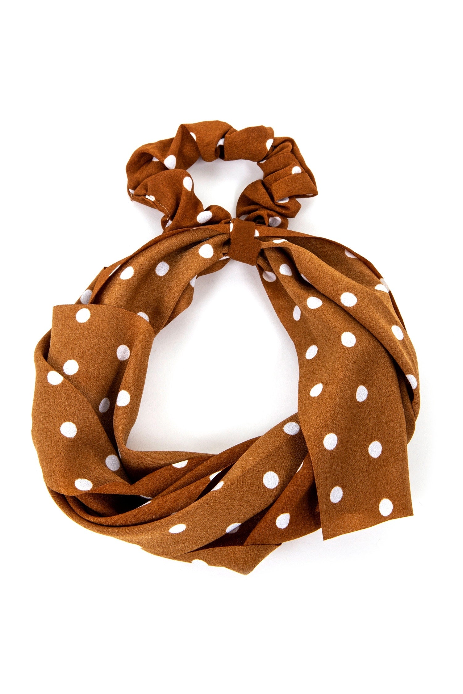 Play up your pretty tresses and get those retro vibes with this adorable scarf scrunchie! It features a classic scrunchie design with a long scarf attached for a cute wrap look. The accessory features a brown hued bunched fabric with an elastic that flows out and is detailed with a white polka dot print .