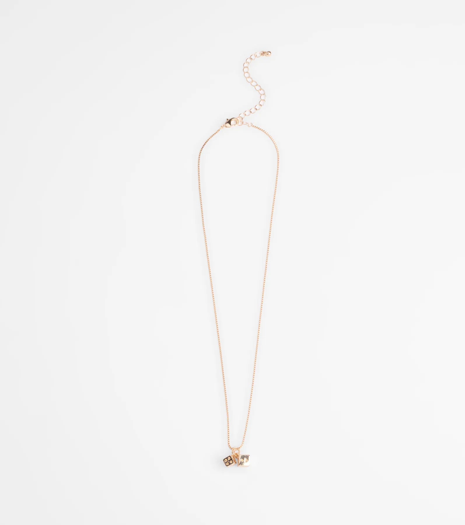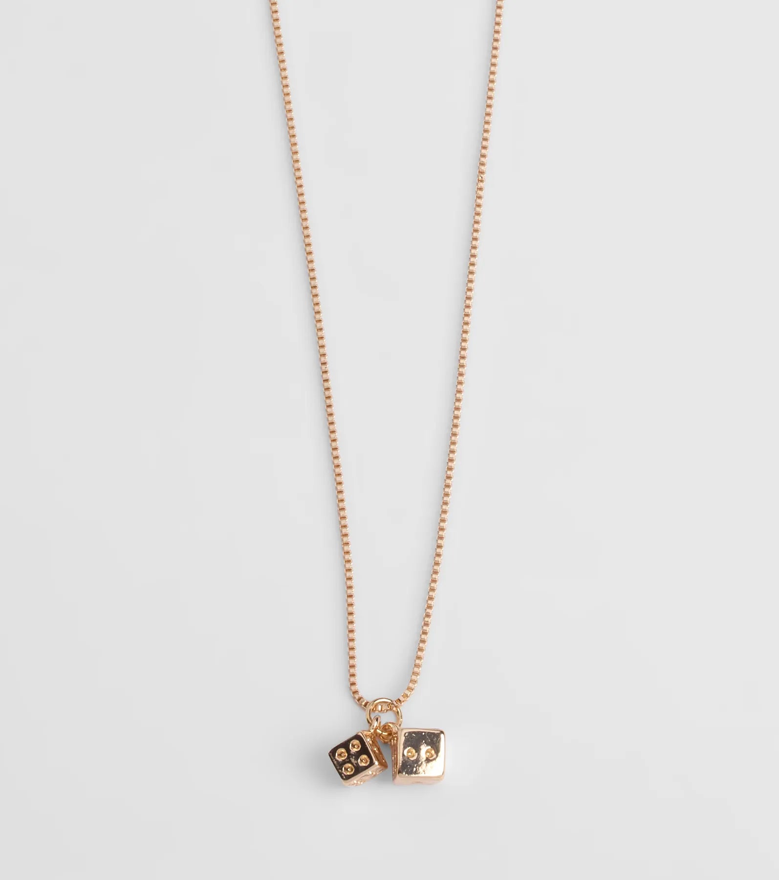 Lucky you to have found this necklace with two dice charms on a dainty snake chain. Pair with a denim jacket.