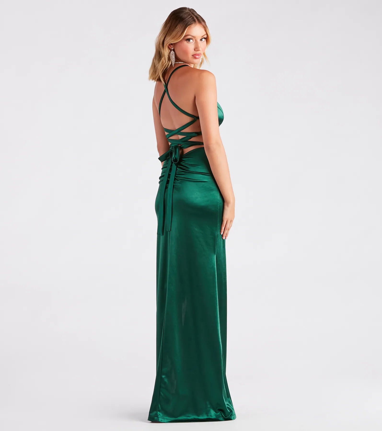 Radiate effortless glamour in the Rose formal satin dress for a black tie wedding or gala this season! She features a sexy sleeveless sweetheart neckline with a wired insert. wide shoulder straps that lace up along her open back. and a curve-flaunting mermaid silhouette showcasing a high side slit and floor-length hem perfect for showing off your heels of the night. The formal dress is composed of luminous silky satin fabric with bust lining and minimal stretch. Complete the look in a lovely .