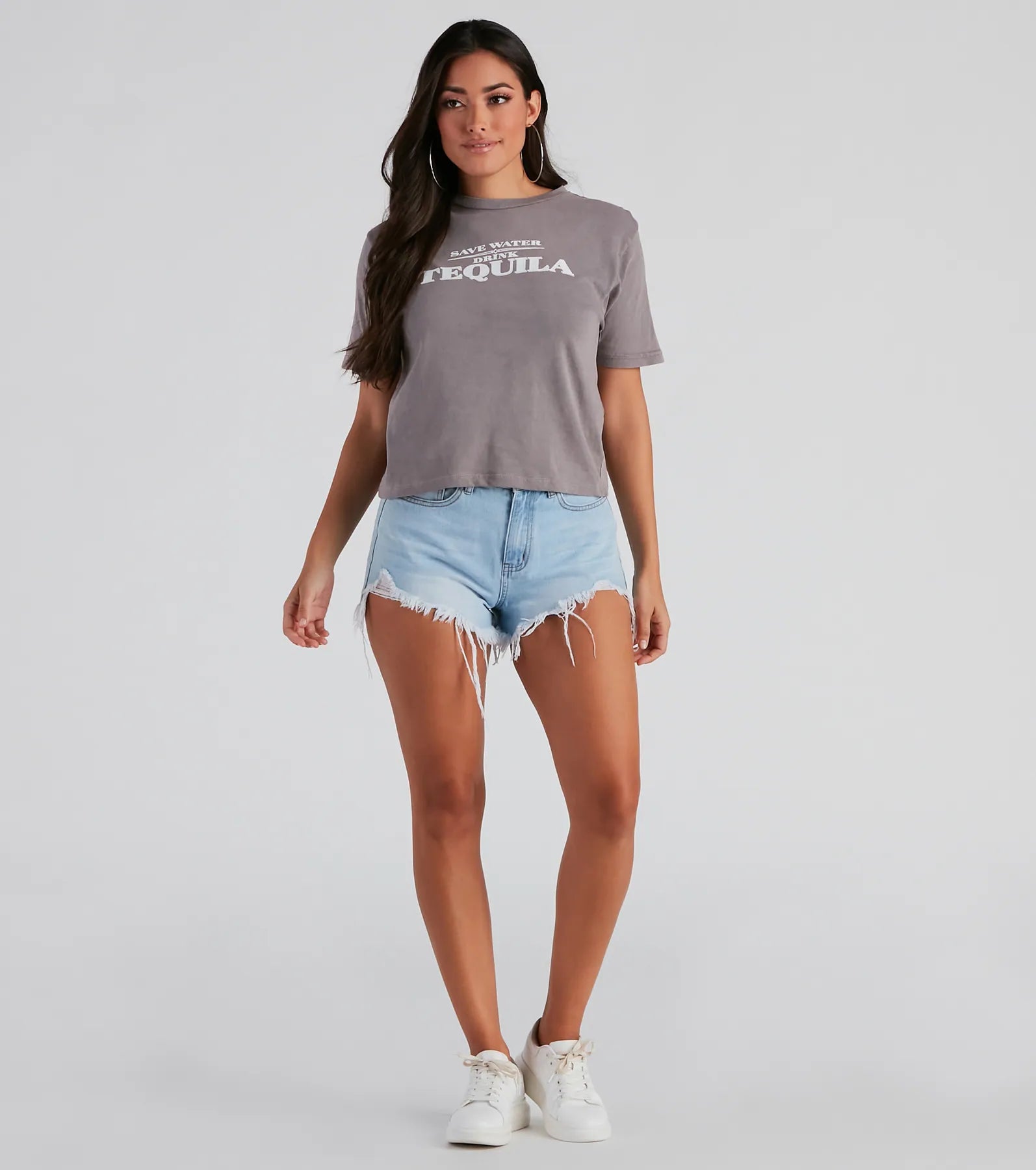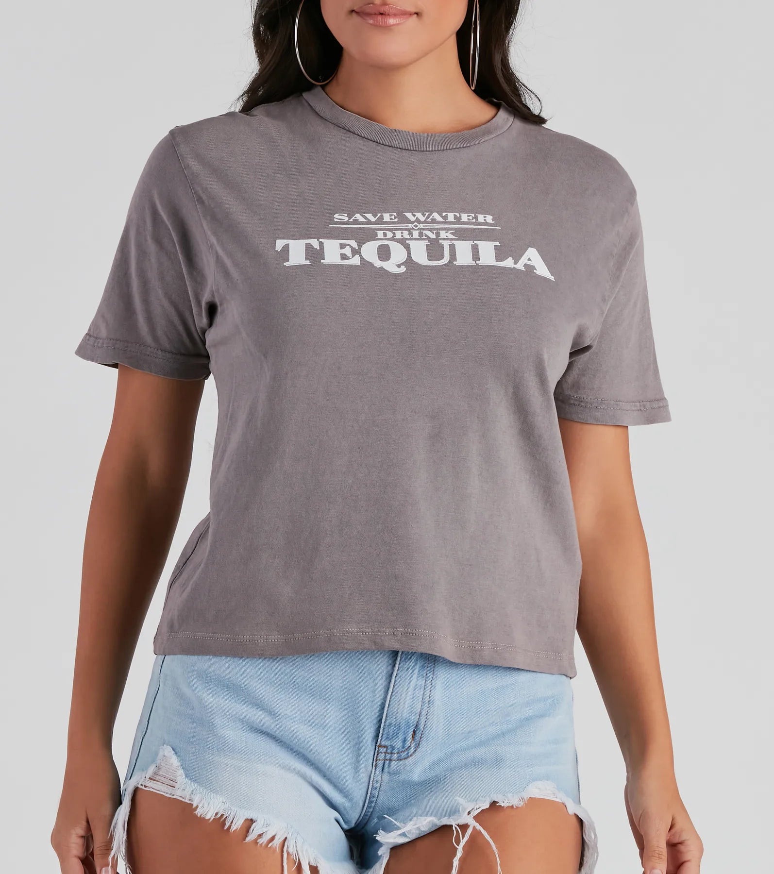 Conserve water. and drink up your fave beverage! This graphic tee features a beloved relaxed fit. short sleeves. a crew neck. and a front script that reads. Save Water/Drink Tequila on vintage wash fabric that creates the perfect comfy fit and feel. Complete the look in distressed denim