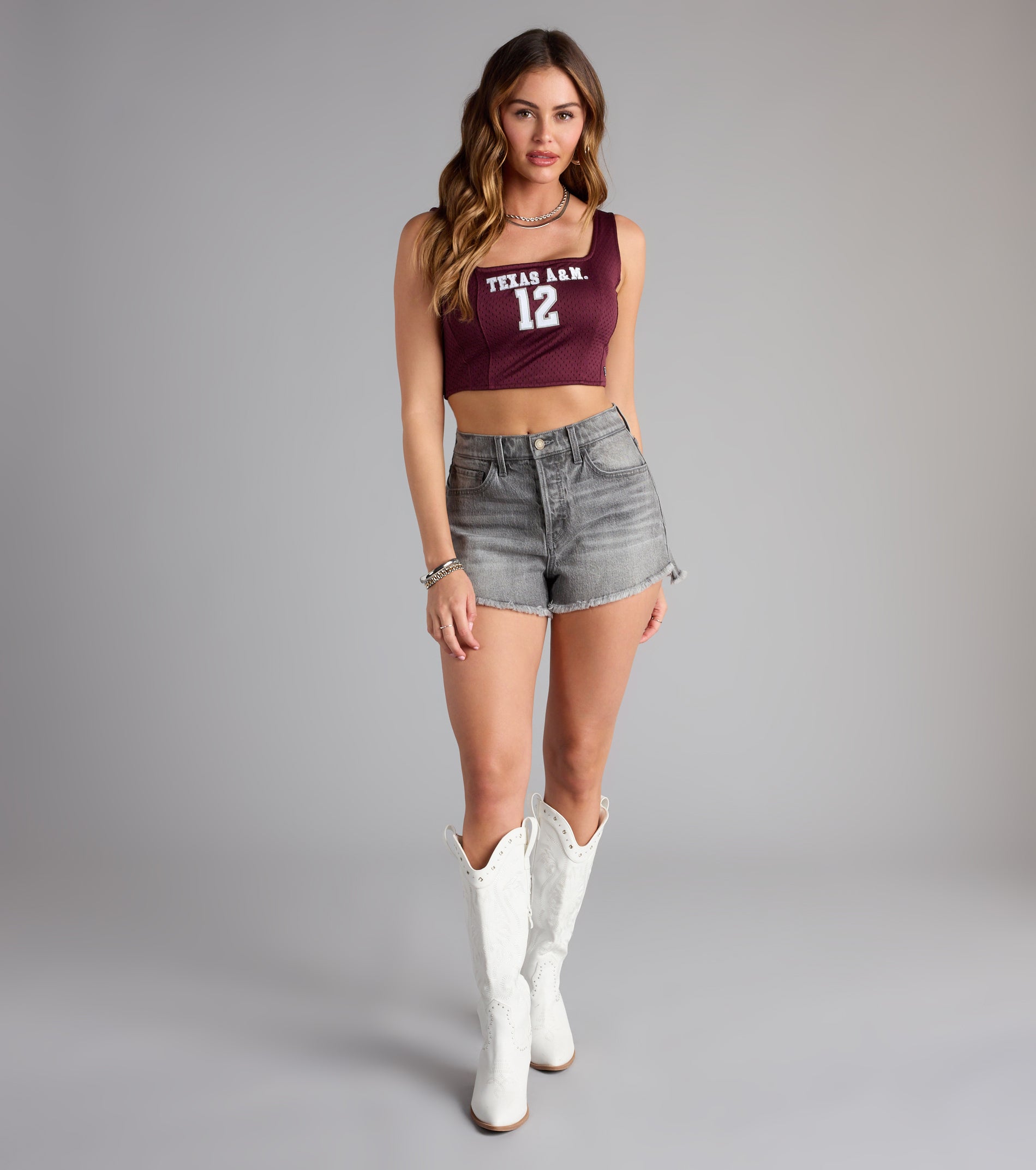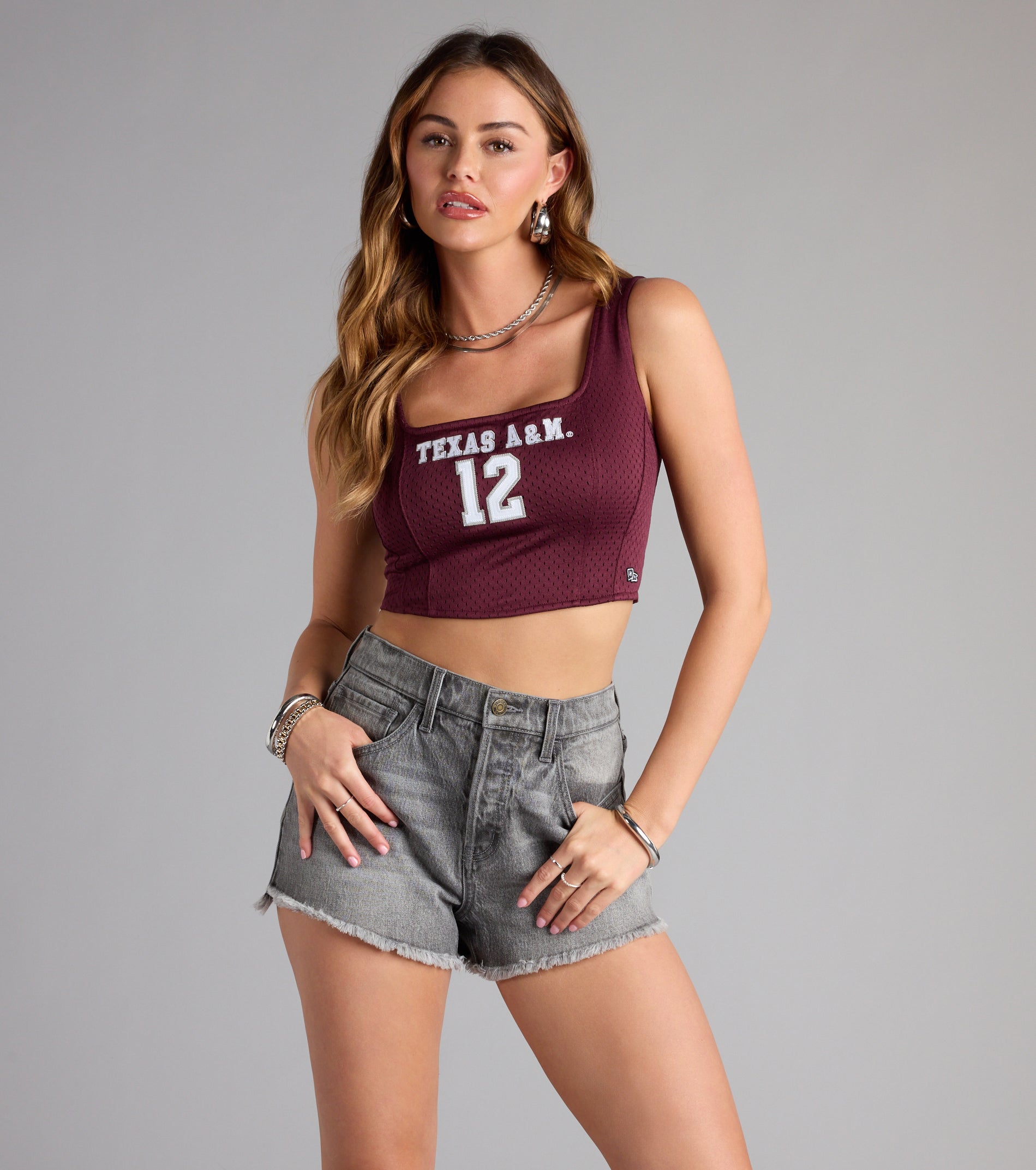 Serving school spirit with a snatched twist. This mesh corset crop top brings jersey vibes and a bold front embroidery—perfect for game day glam or post-win pics.