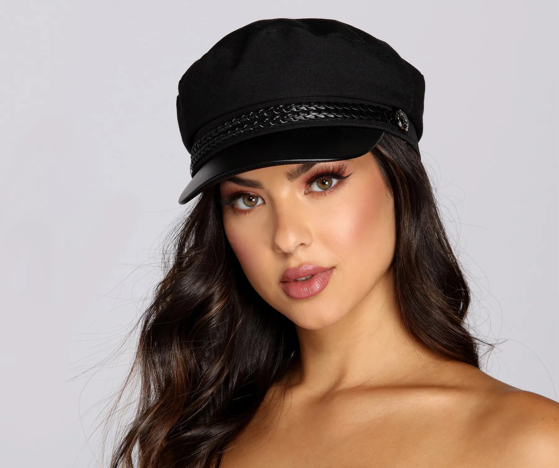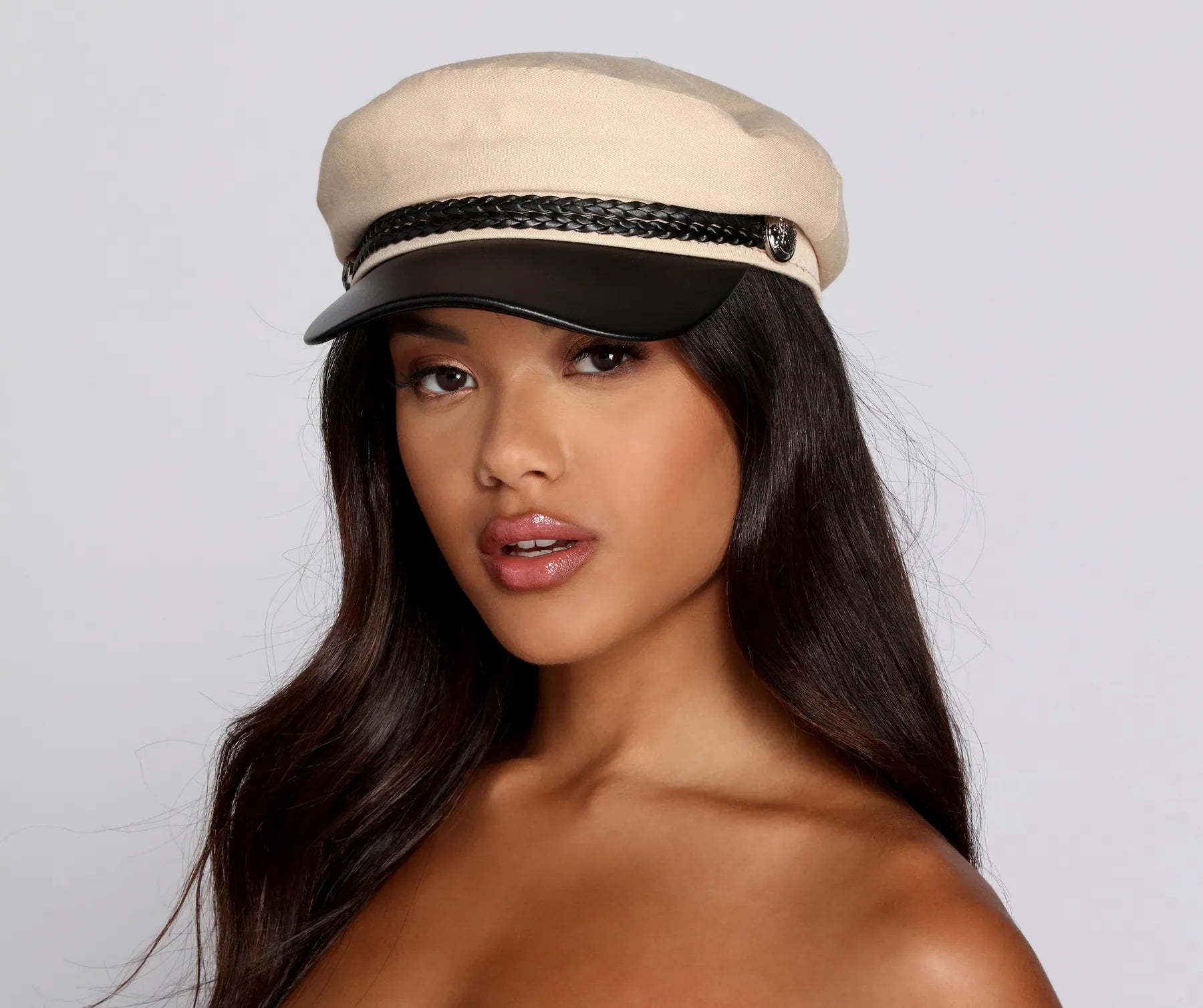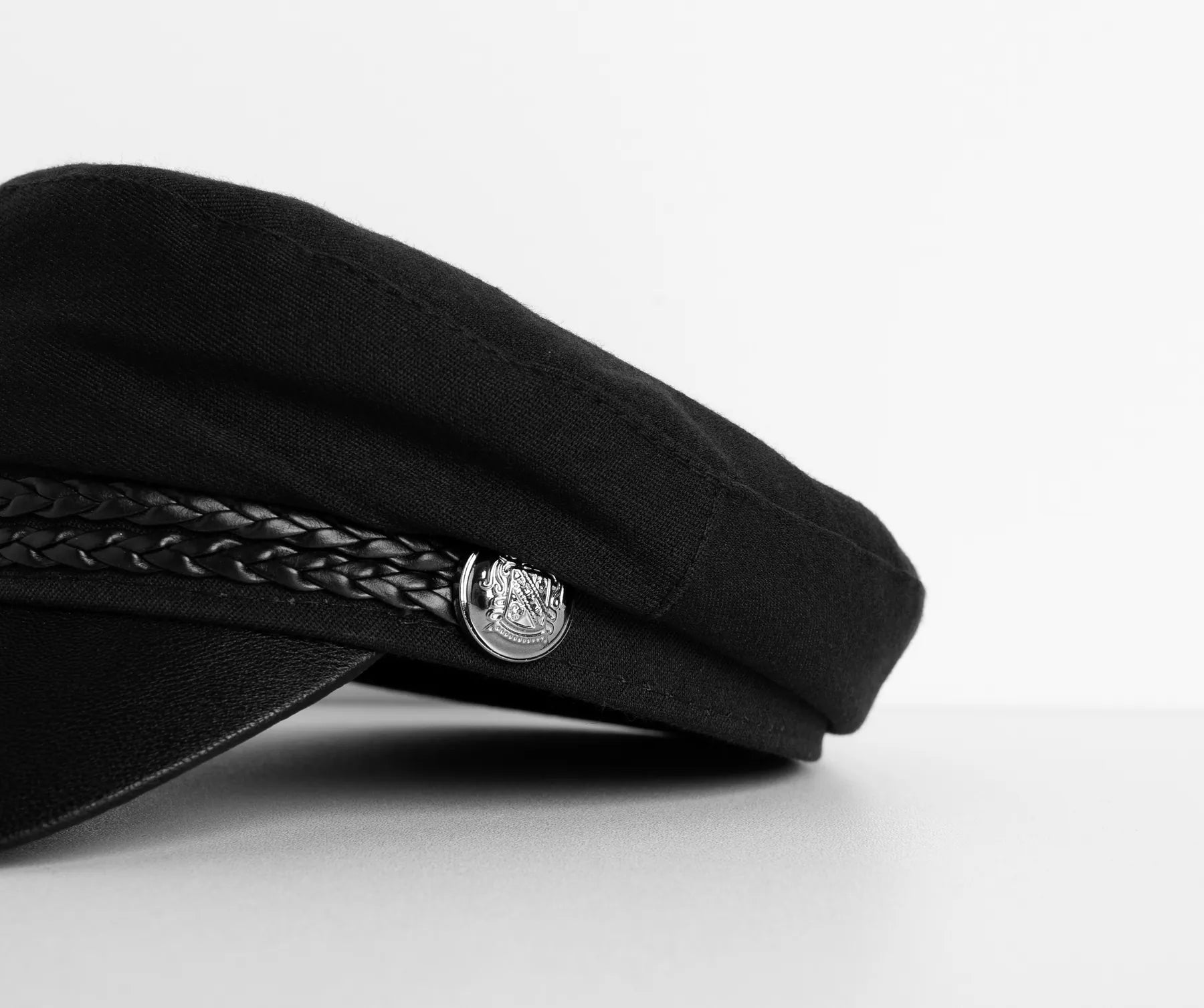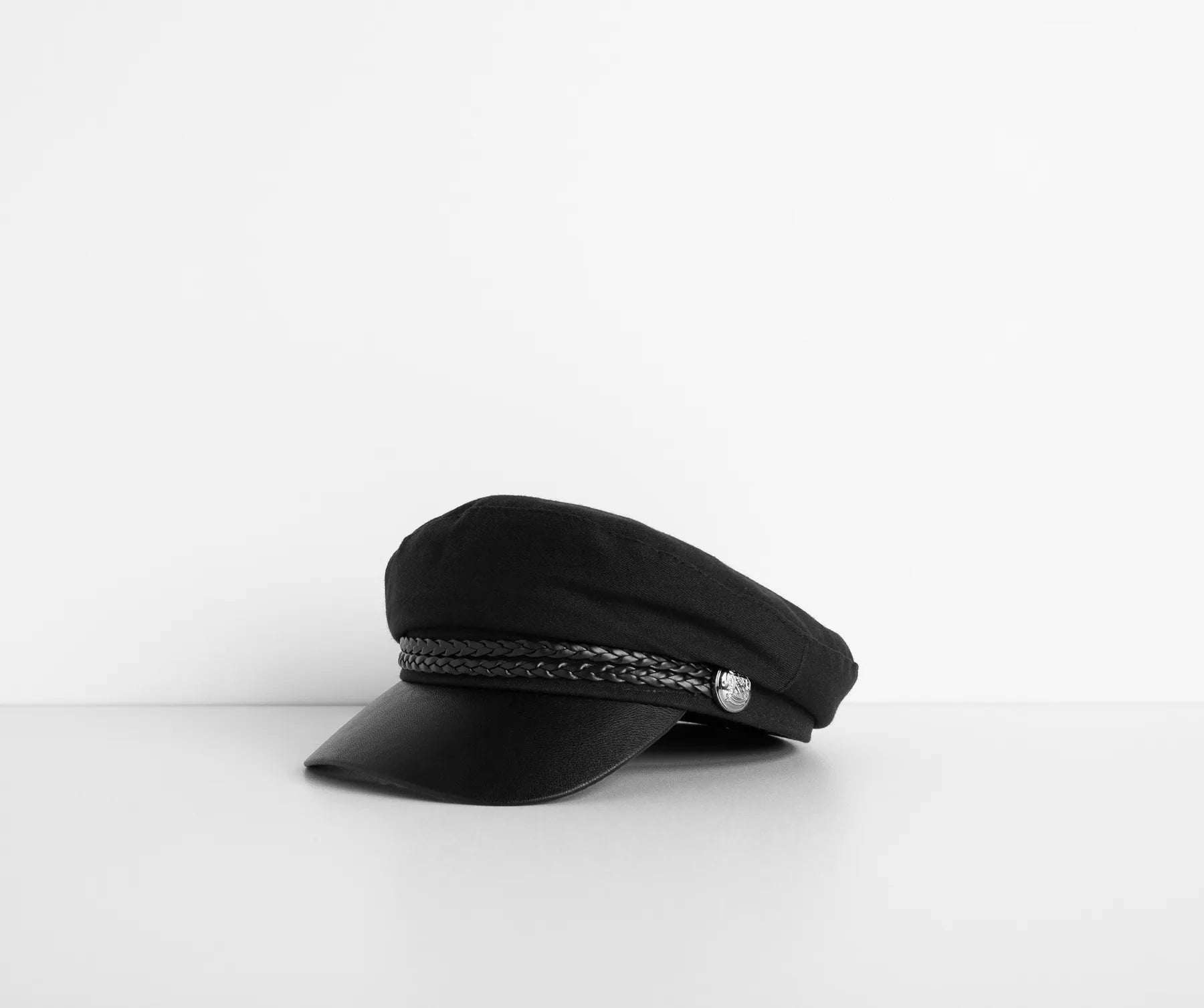 You keep slayin’ in this high-seas inspired hat. This cap features a faux leather contrast. a braided detail with button detail. and has a textile main.