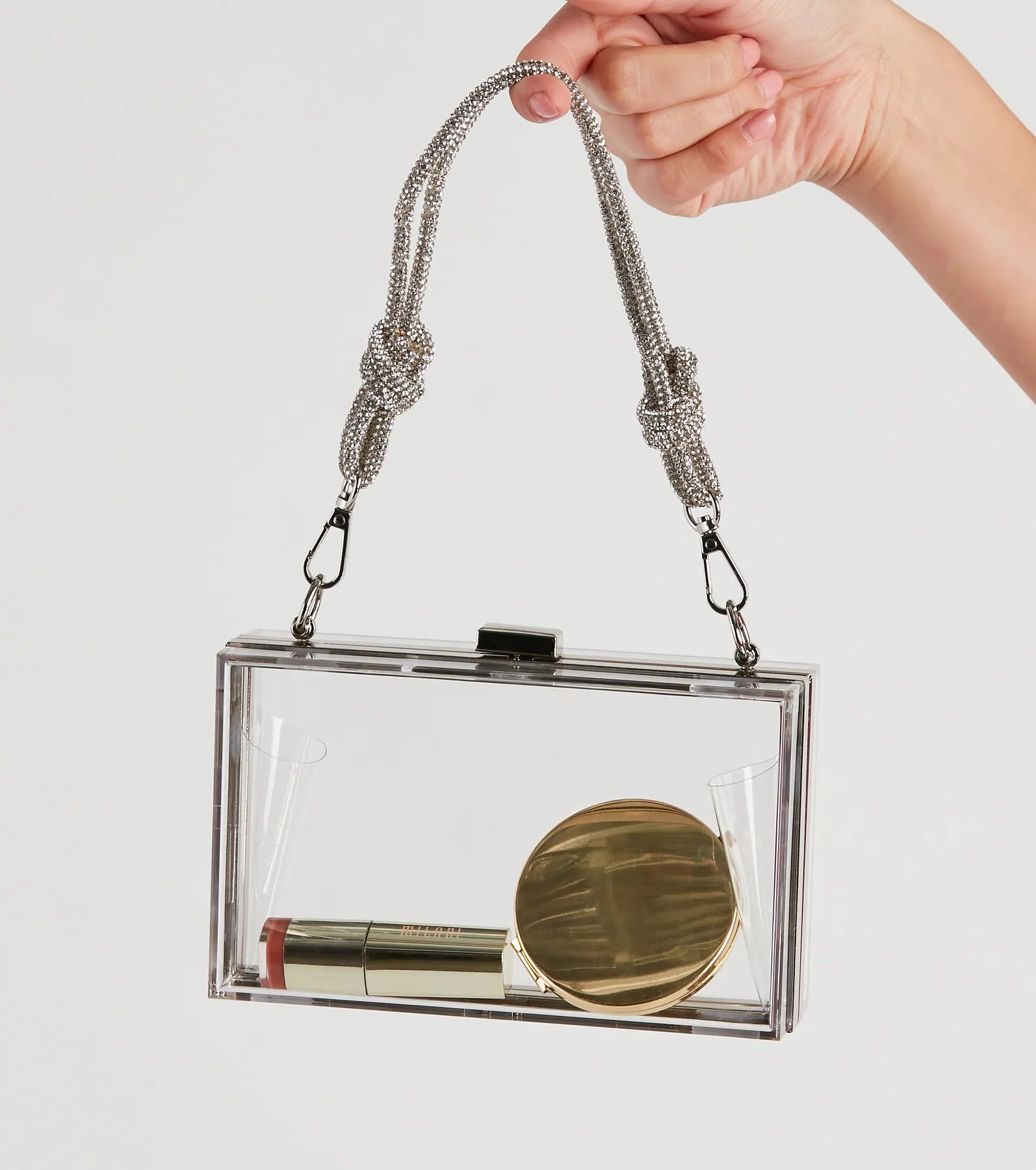 Show everyone your new favorite handbag! It features a clear box-shape design. a rhinestone handle. push-lock closure. and a detachable chain link strap. Complete the look in for a social occasion!