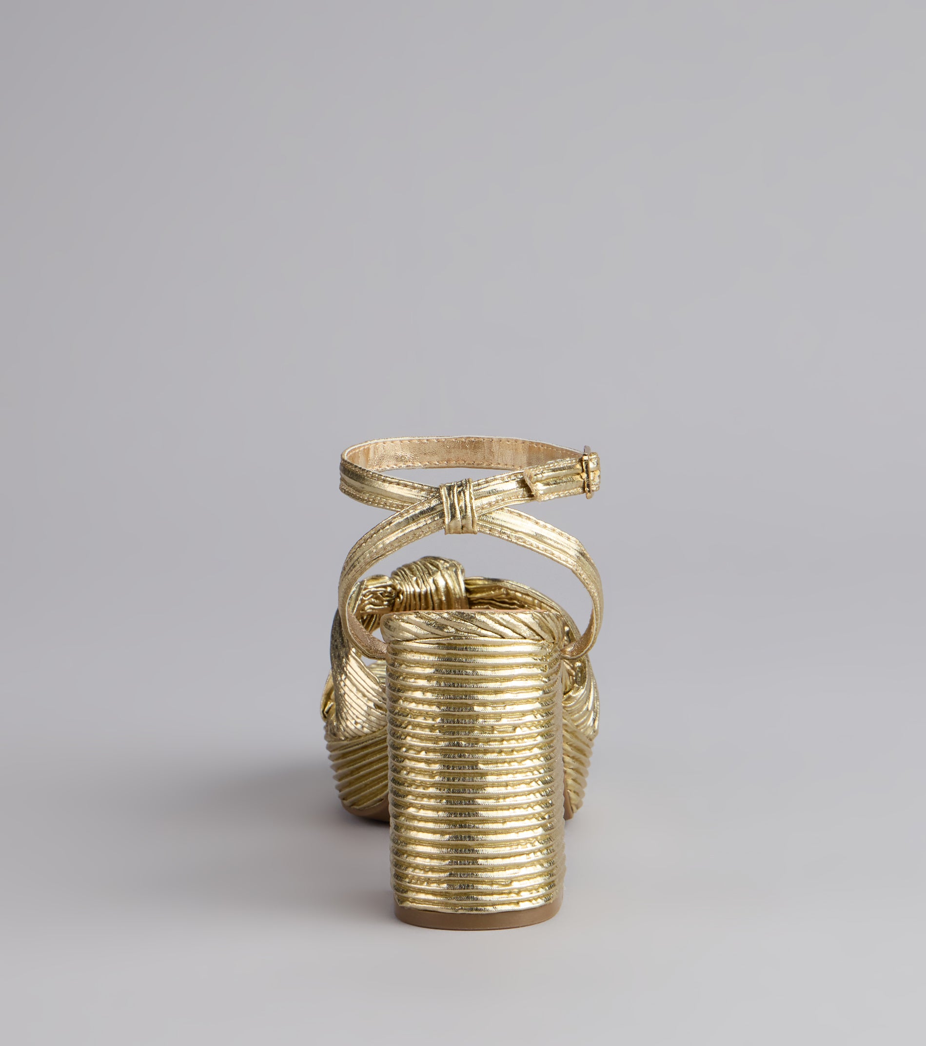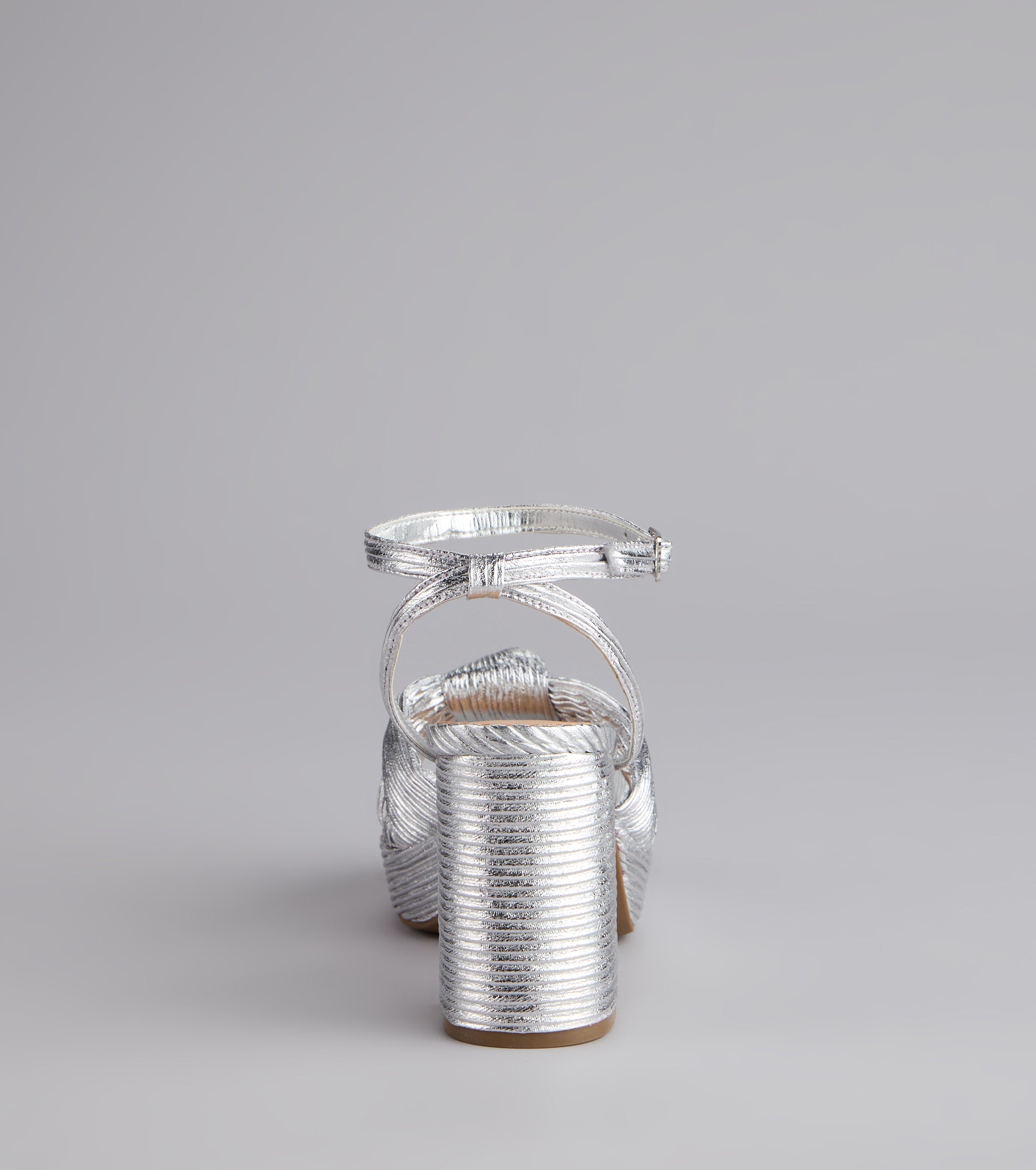 A little glam. a lot of shine??these metallic pleated block heels feature chic knot straps and a sleek square toe that make every step a statement.