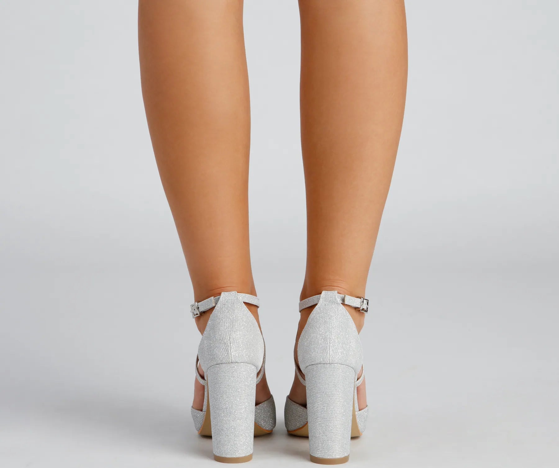 Sparkle under the dance floor lights in these glitter mesh heels! They feature an almond toe. block heel. and criss-cross ankle straps with buckle closure. Complete your look in a little