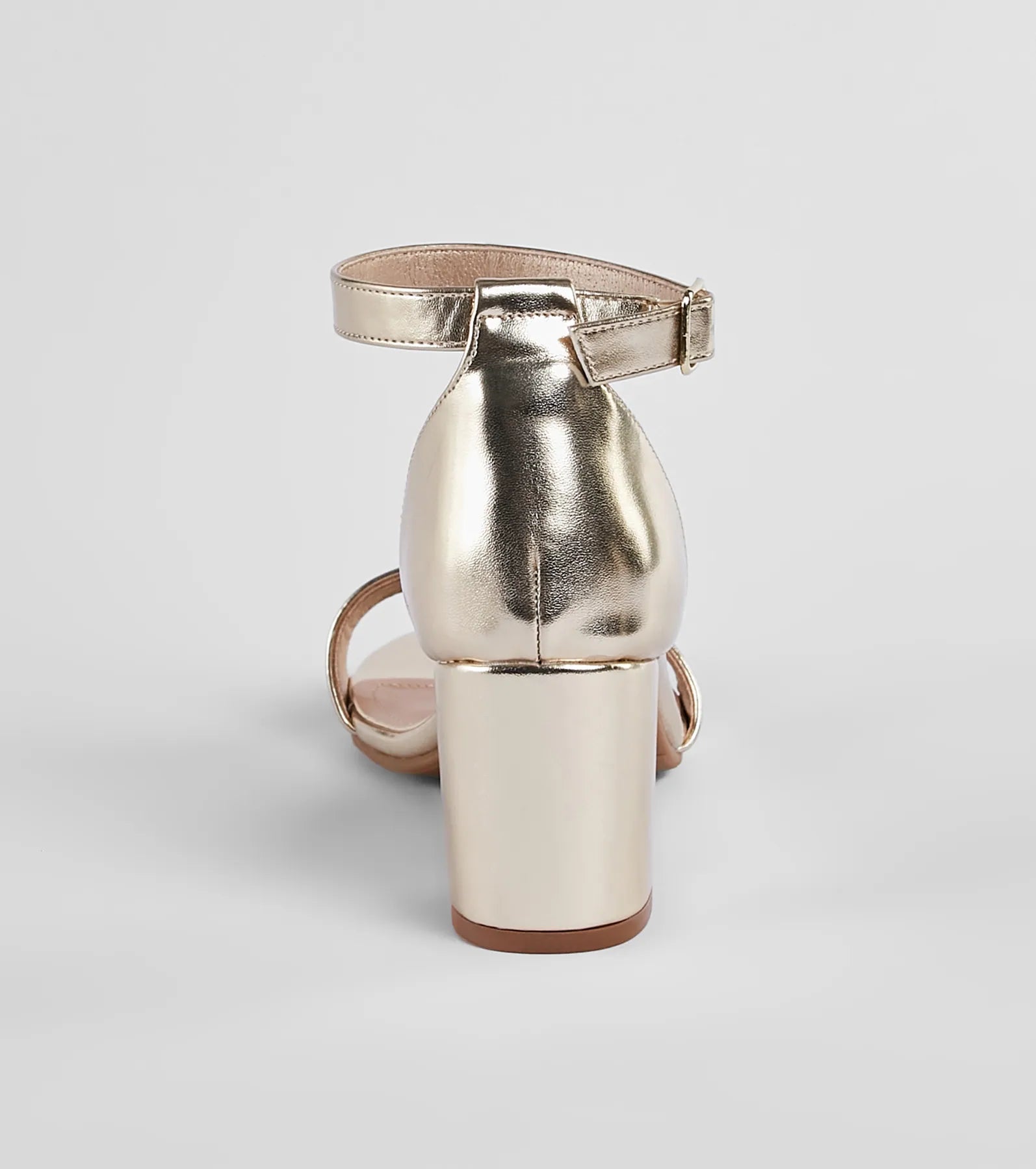 Level up the shine factor of your dressy look with these metallic low-block heels! They feature an open round toe with a strap. an adjustable ankle strap. a closed back. a low block heel for comfortable wear. and a glam metallic sheen on the faux leather material. Style with a sleek .