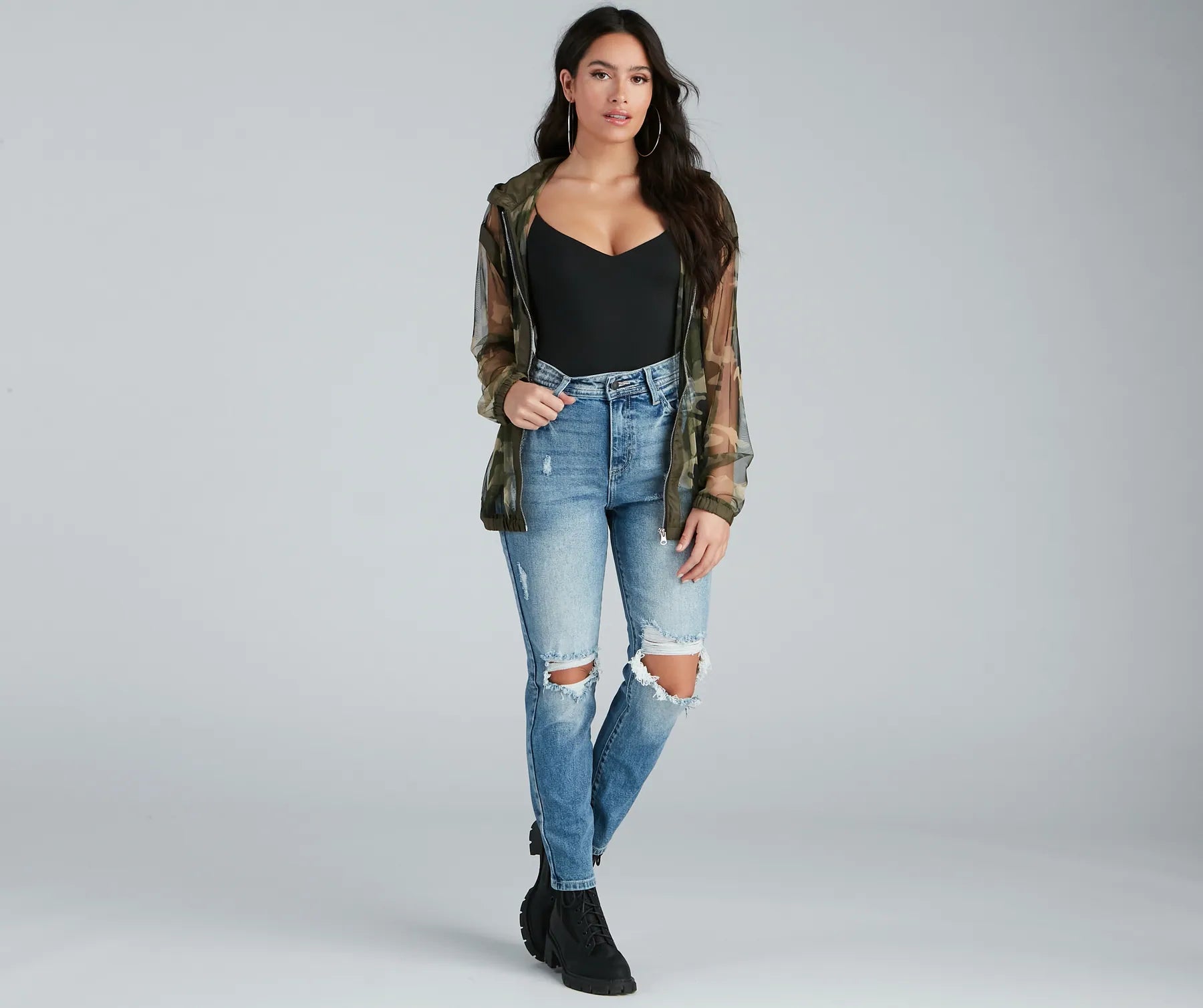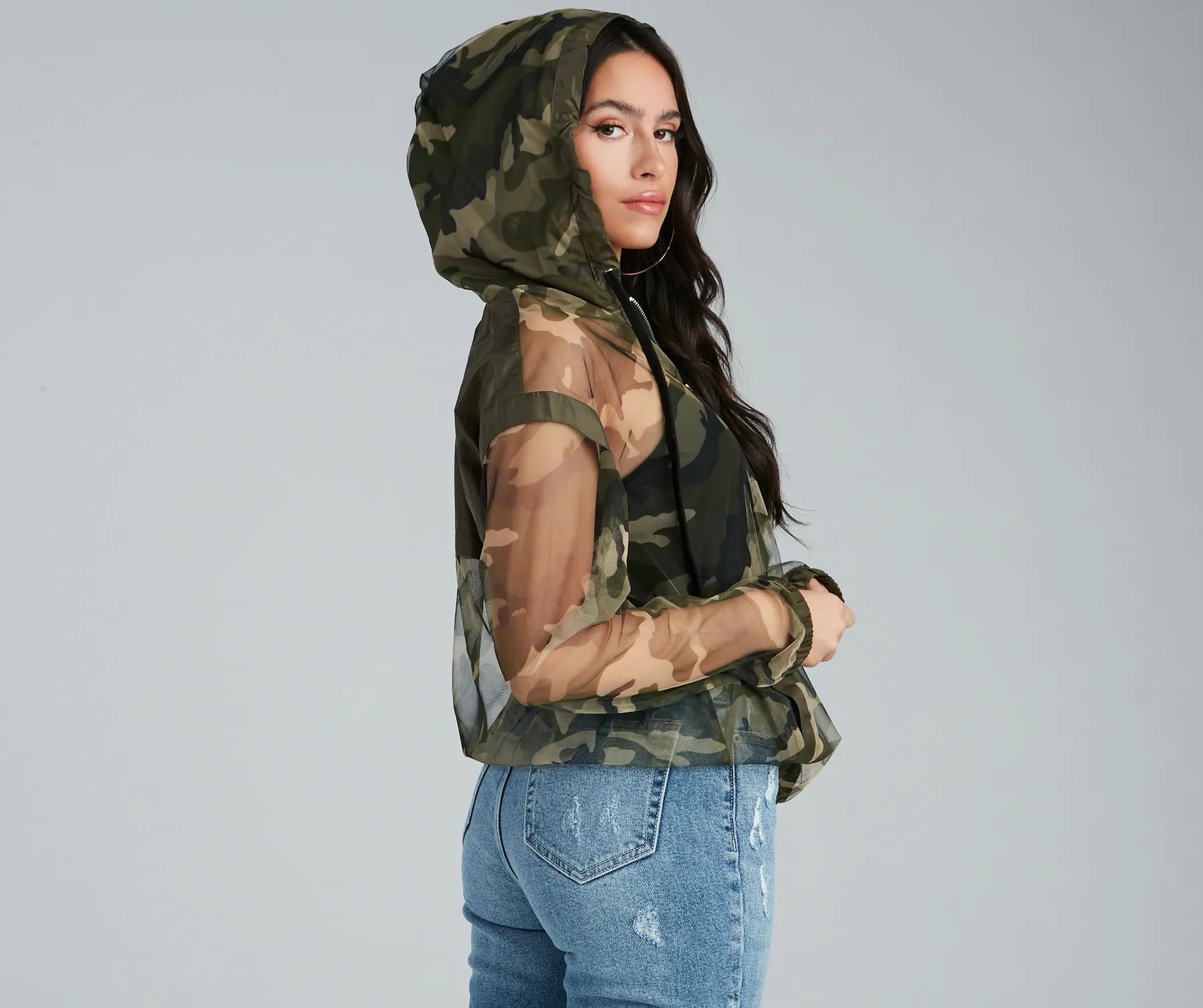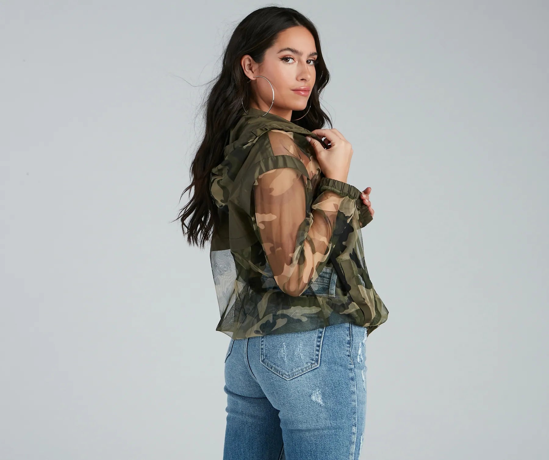 Show em’ who’s boss in this commanding camo bomber! The jacket features a drawstring hood. long sleeves with cinched cuffs. a complete zip front. front pockets. and an elastic banded hem. Pair this trendy jacket with a and for a casual-chic look.