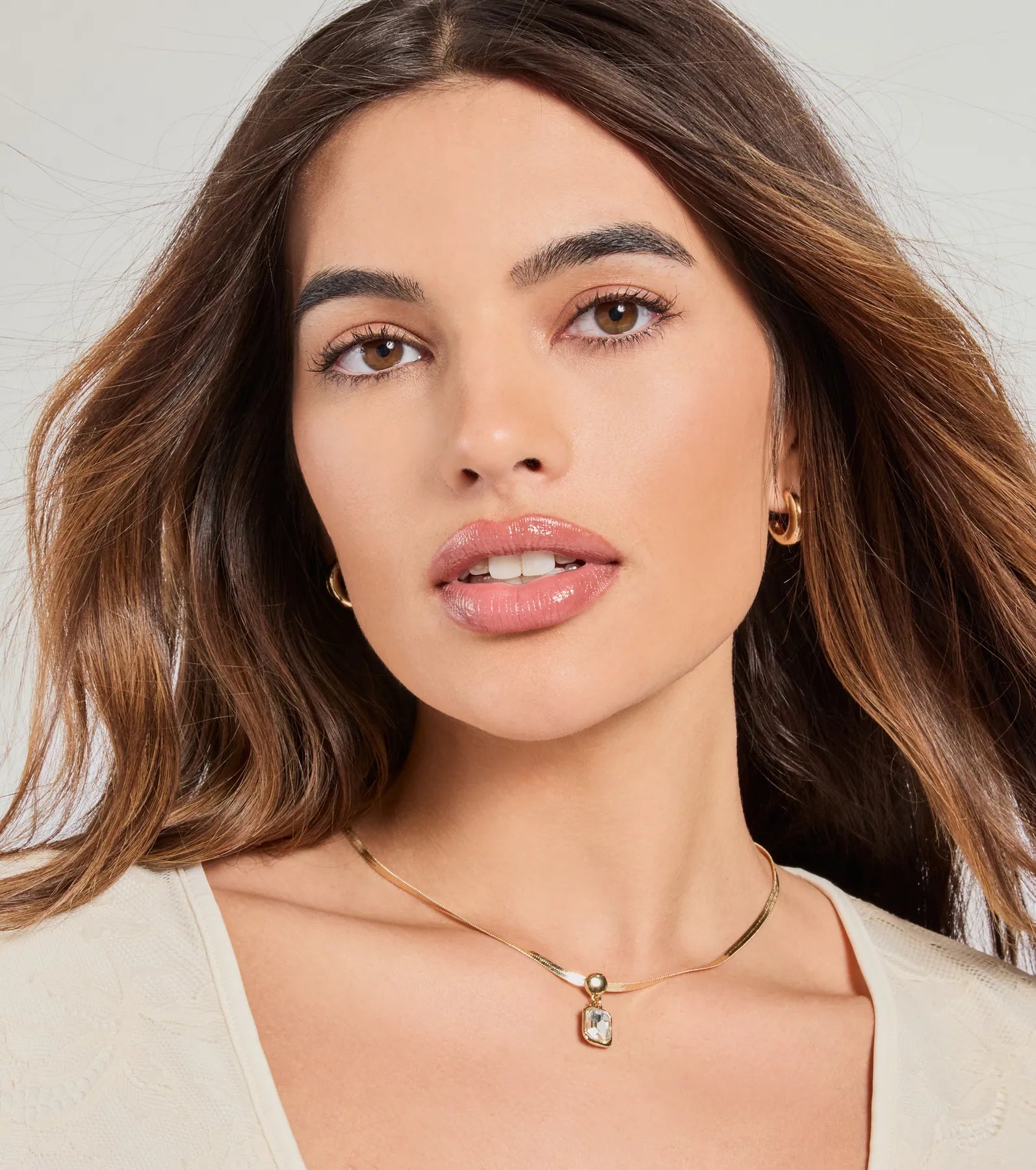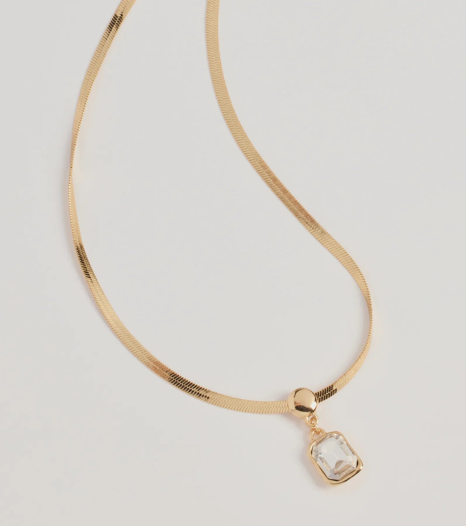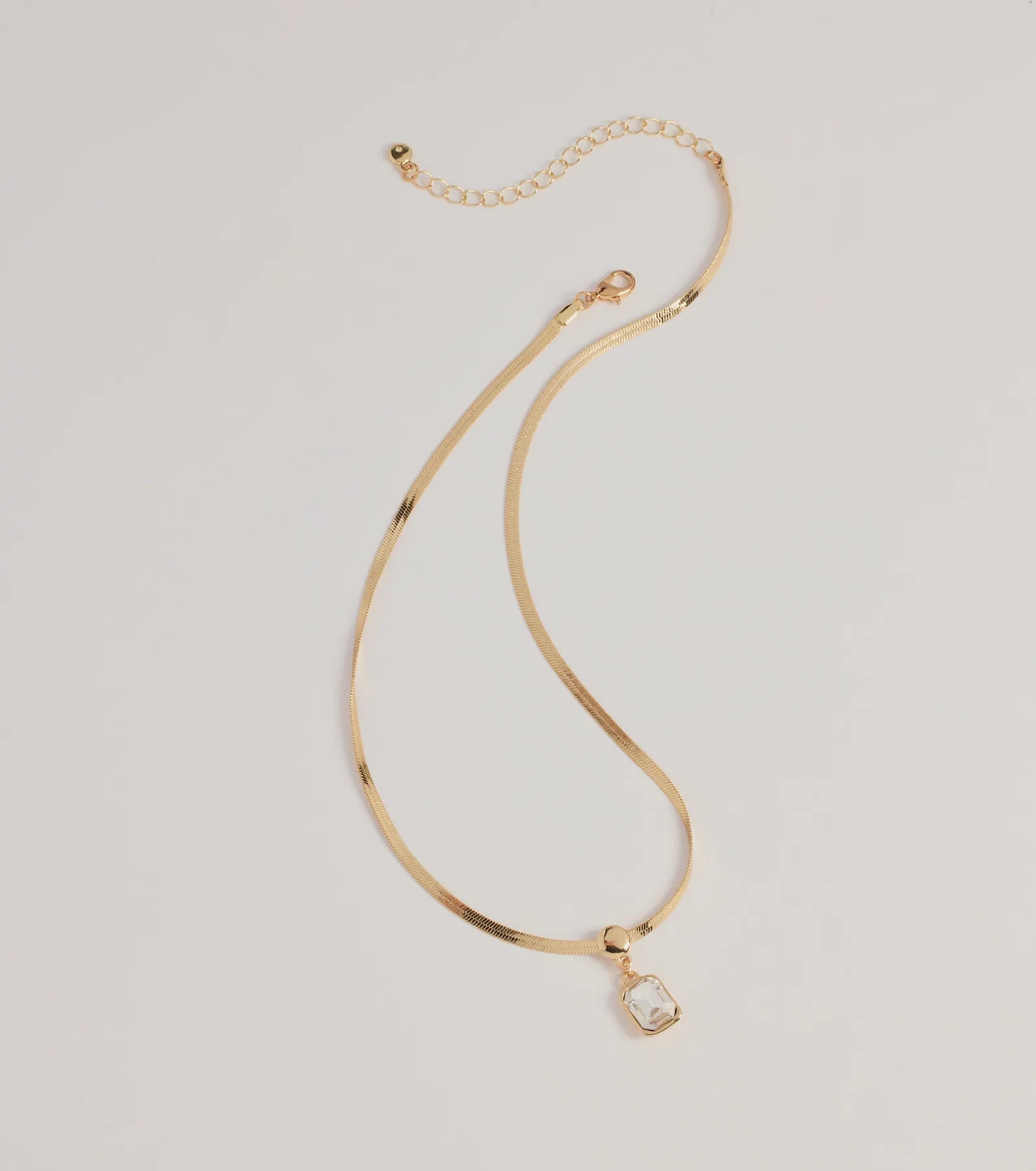 Nail your look with the simple glitz snake chain pendant necklace in gold. Its chic design and clear stone pendant make it perfect for meetings. happy hours. or dates.