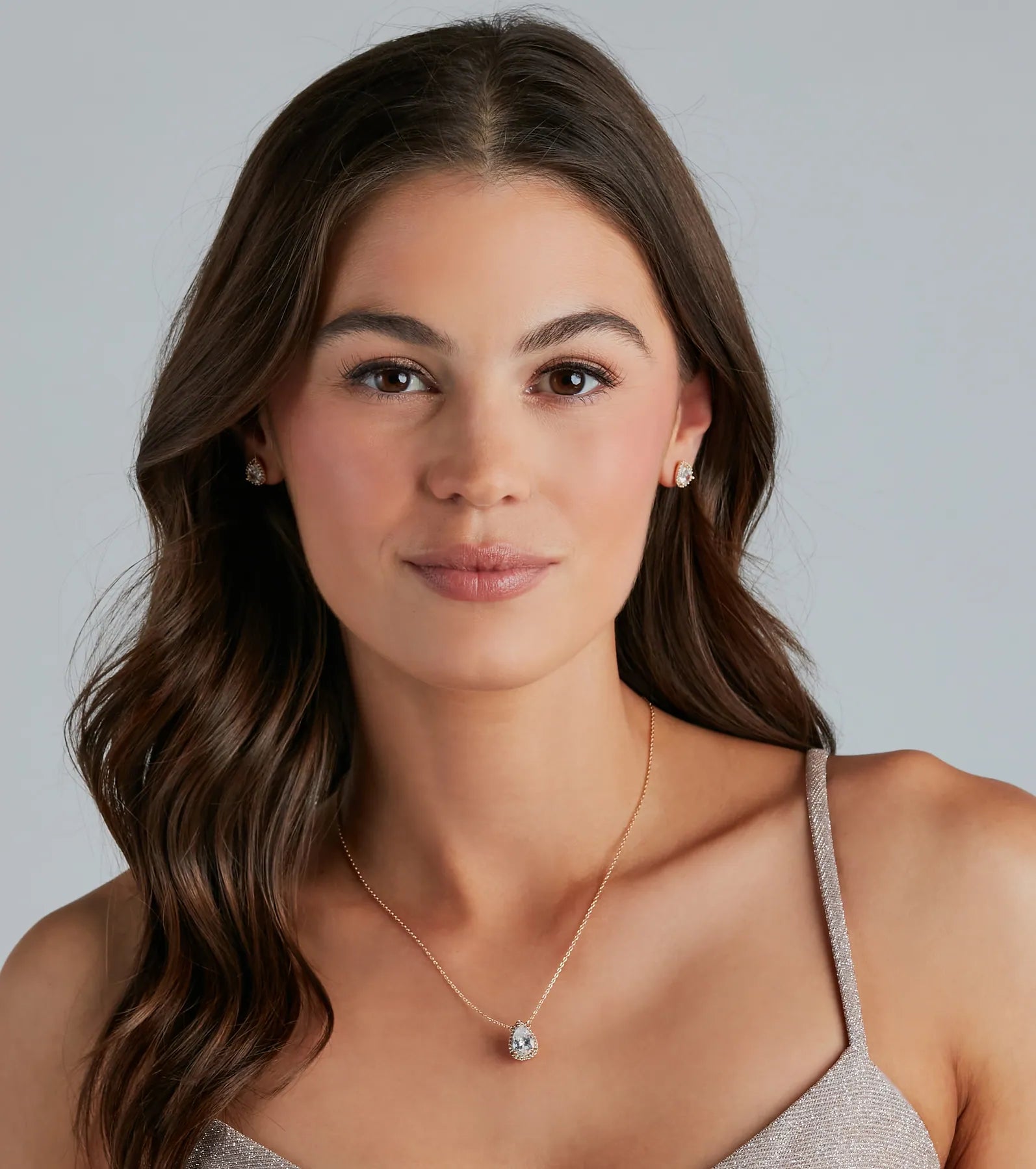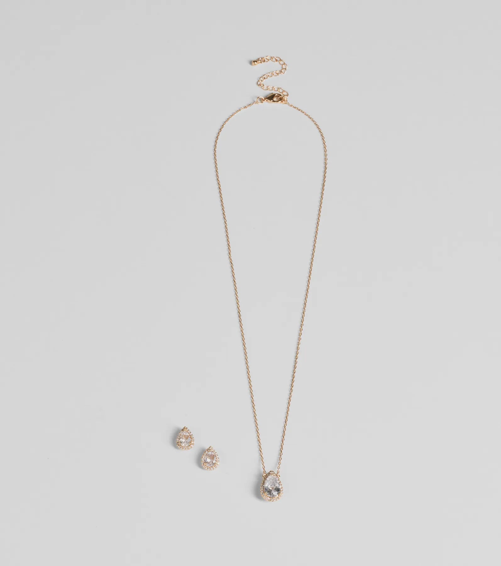 This pretty cubic zirconia necklace and earrings set will give your ‘fit those simple luxe vibes. The set?features a dainty chain necklace with a stunning center teardrop-shaped cubic zirconia stone with a mini cubic zirconia outline. The stud earrings feature a matching design. Style this jewelry set with a for a subtle glam look.
