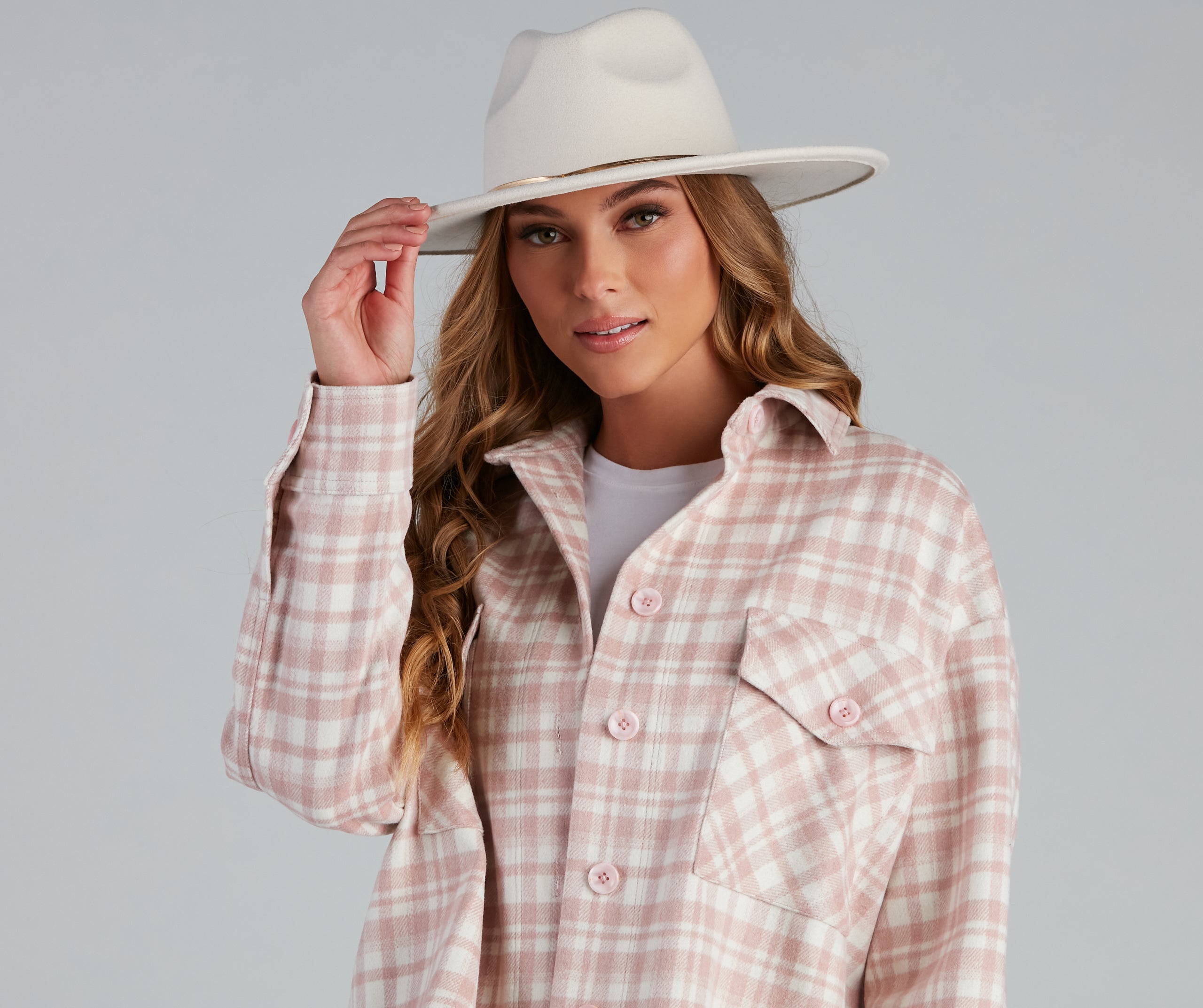 Simply chic. this faux wool Panama hat will complete your trendy look. It features a wide flat brim and a center sleek snake chain accent band. Style this hat with .