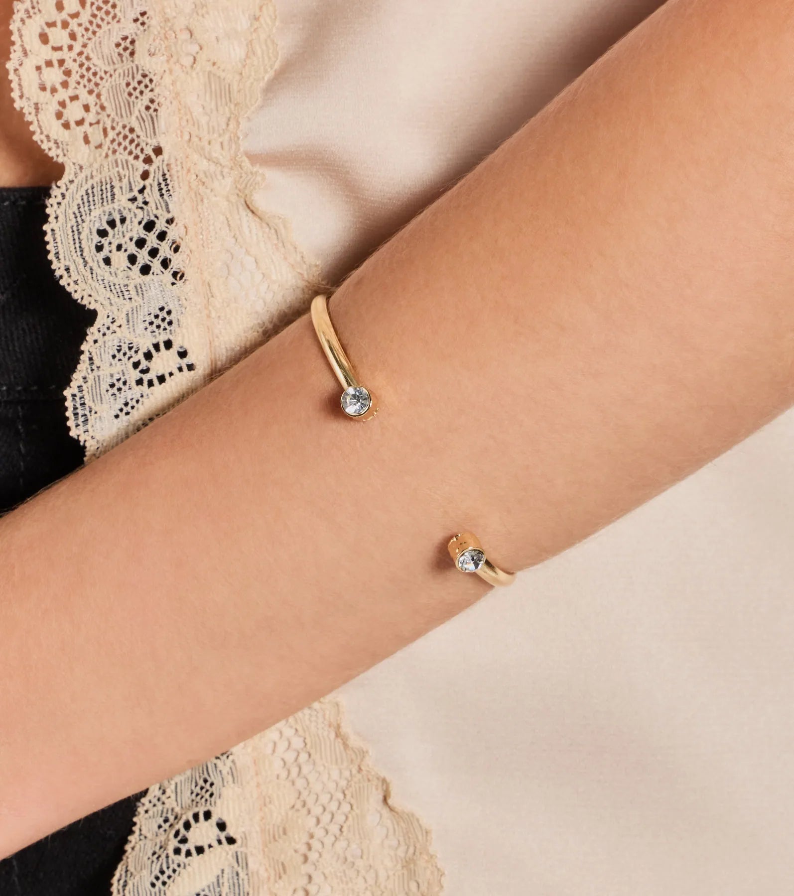 Give your ‘fits a sleek sparkle with this gorg rhinestone cuff bracelet! It features a thin open-ended bangle design with chic rhinestone accents at each end. Pair with .