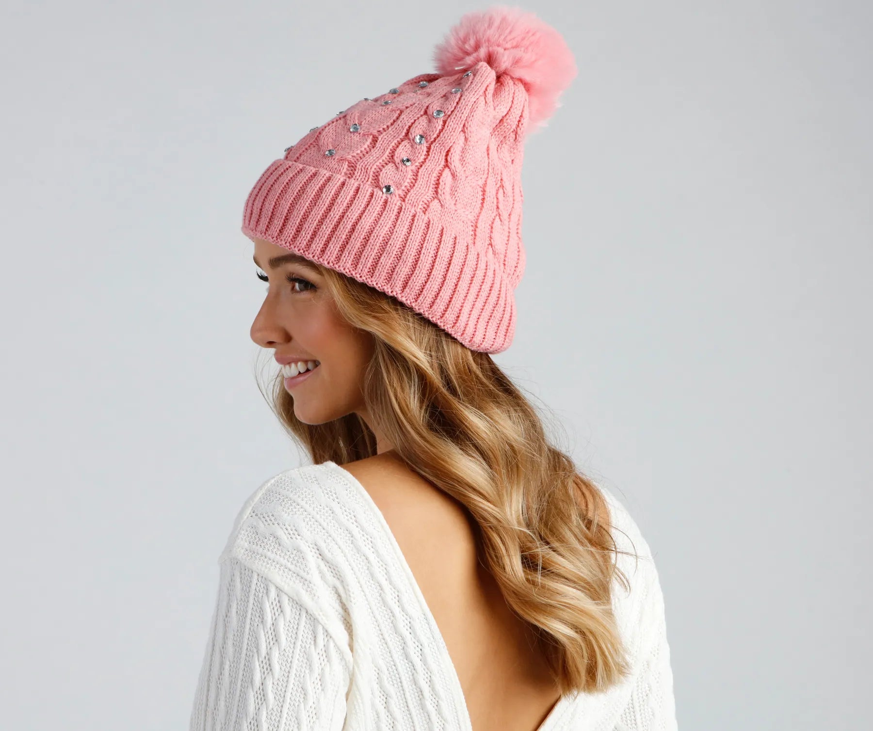 Sparkle a snowy day in this rhinestone beanie featuring a faux fur pom. cable knit design. and a sherpa lining for extra warmth. Complete your look with a cozy