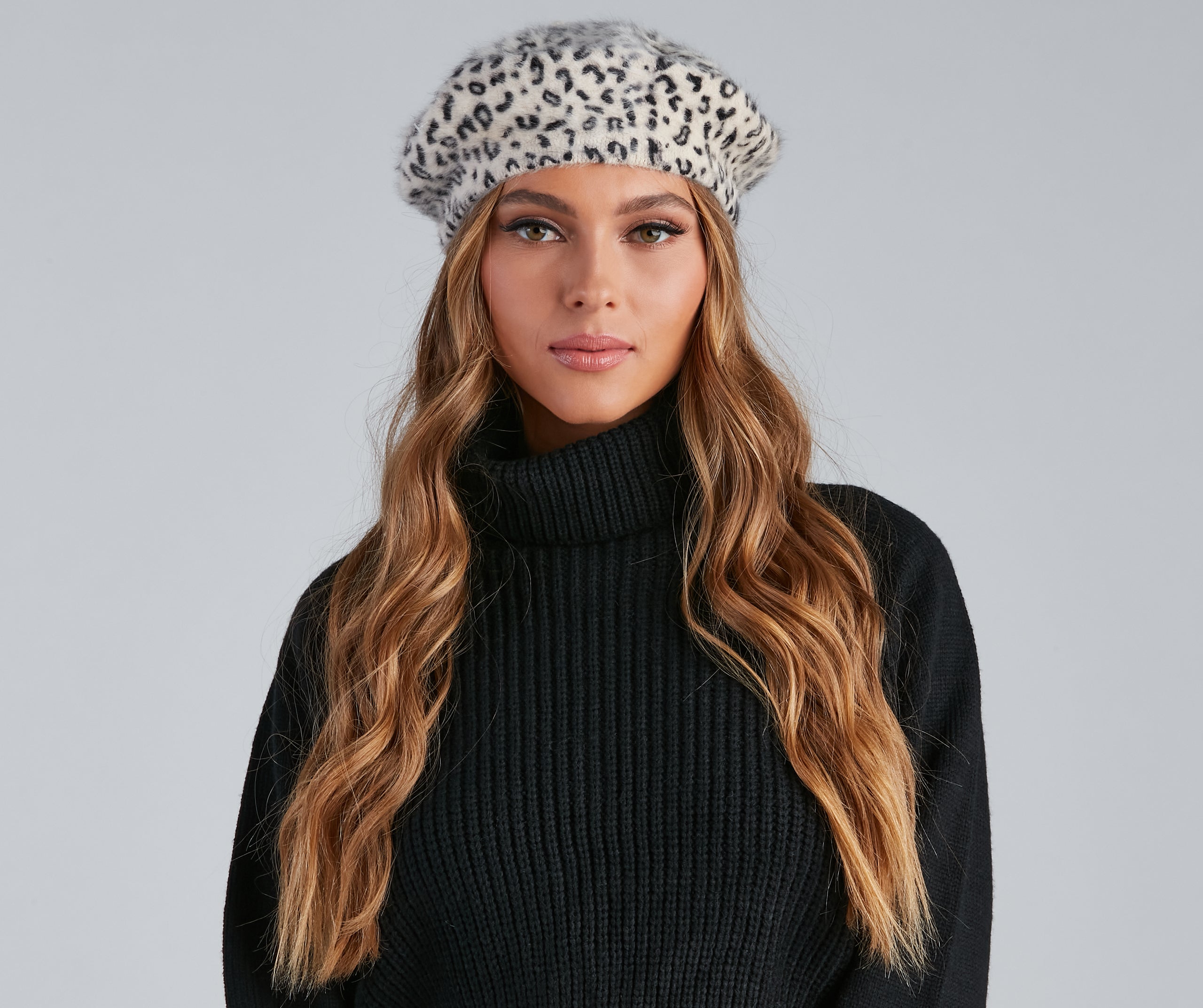 Look tr??s chic with a classic beret! The beret features a classic beret-styled brim. trendy leopard print. and is composed of a wool knit material. Complete look with a