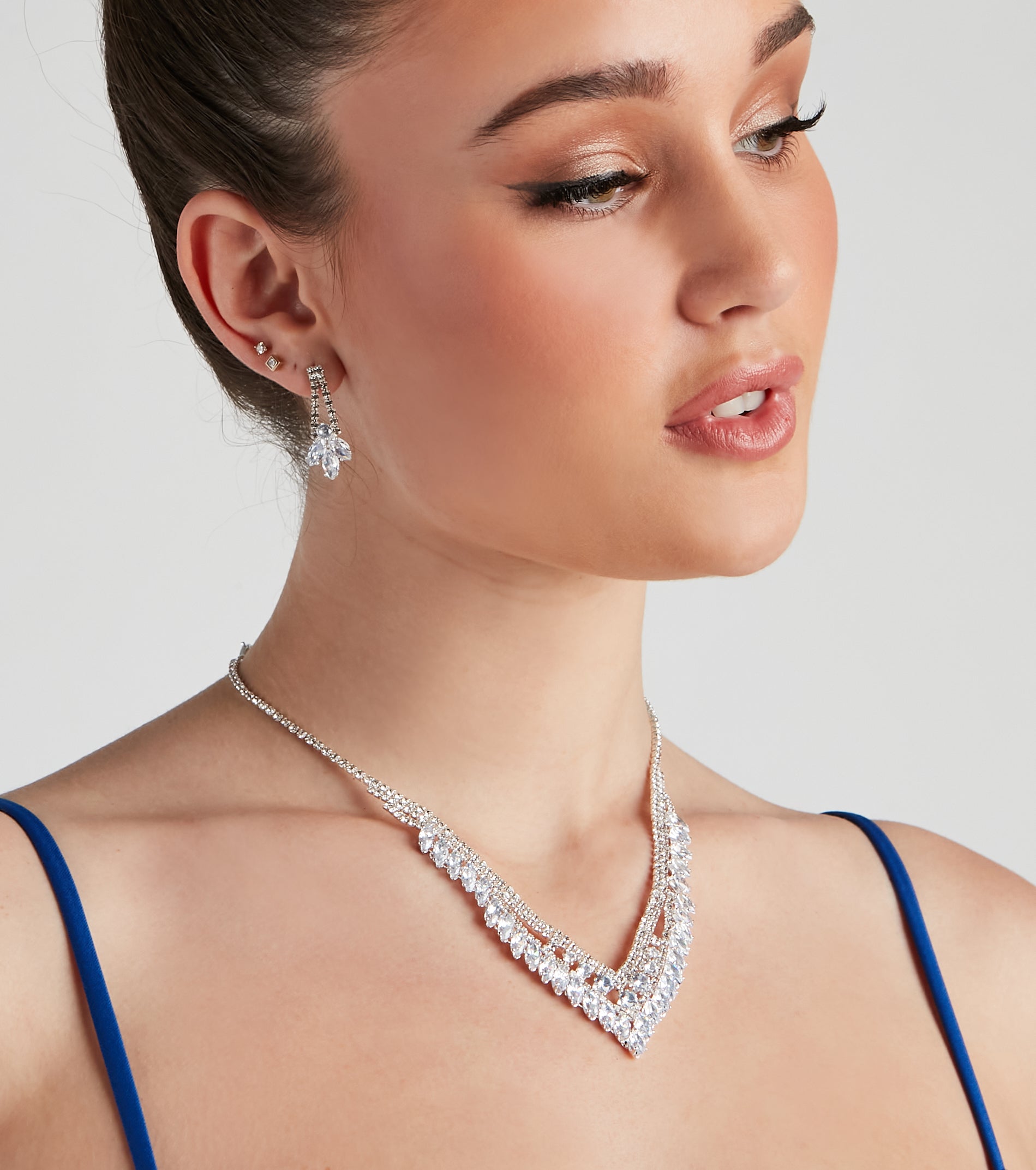Show off the perfect amount of sparkle with this elegant embellished jewelry set. It features a V-shaped collar necklace with a single row of stones leading to a multi-row design of round and marquise-cut cubic zirconia stones. The set also includes a matching pair of cubic zirconia embellished earrings. Pair with a .