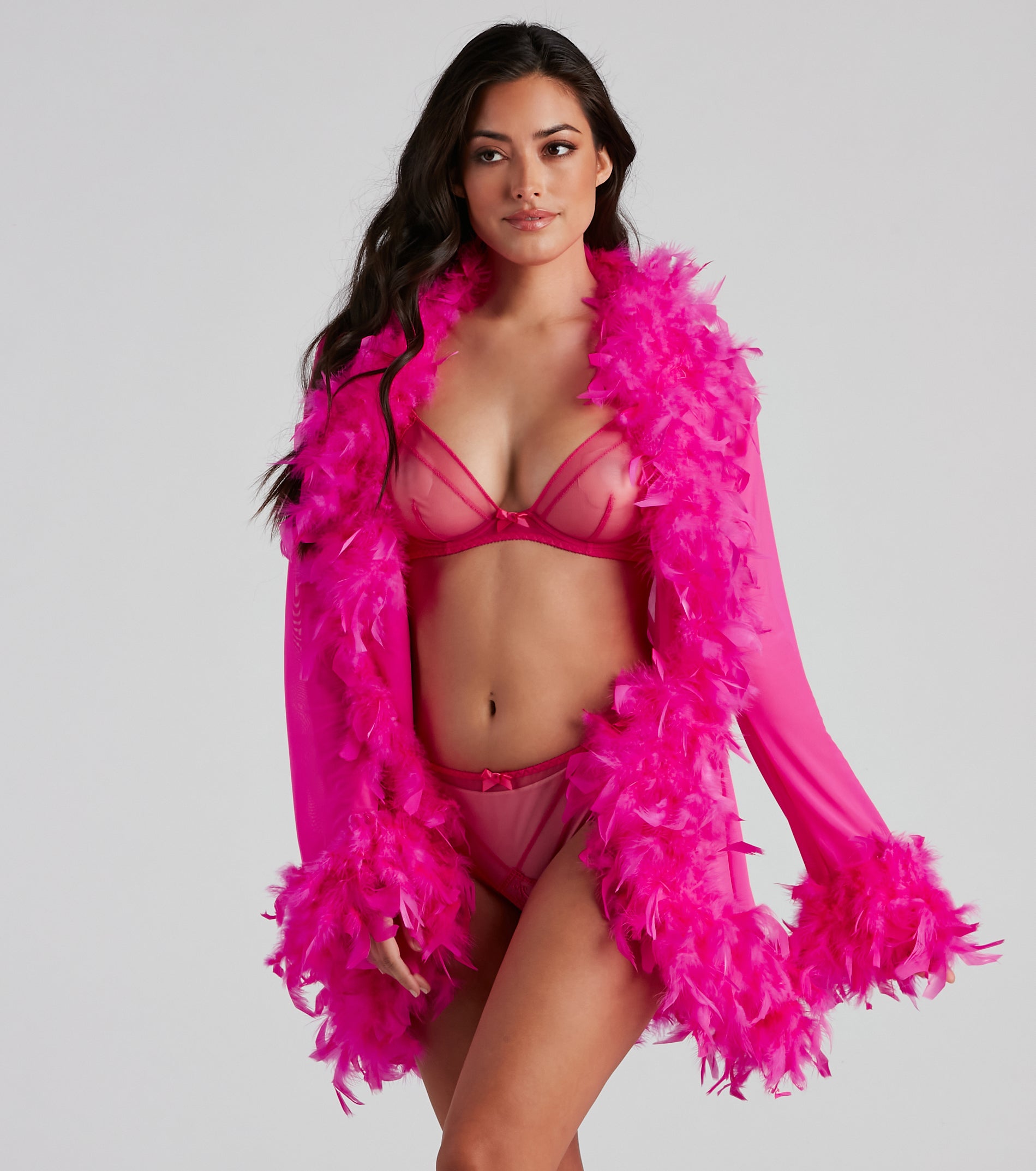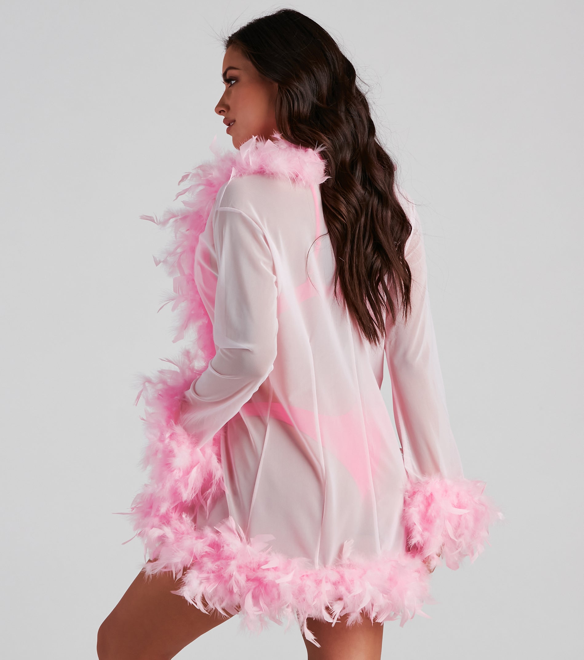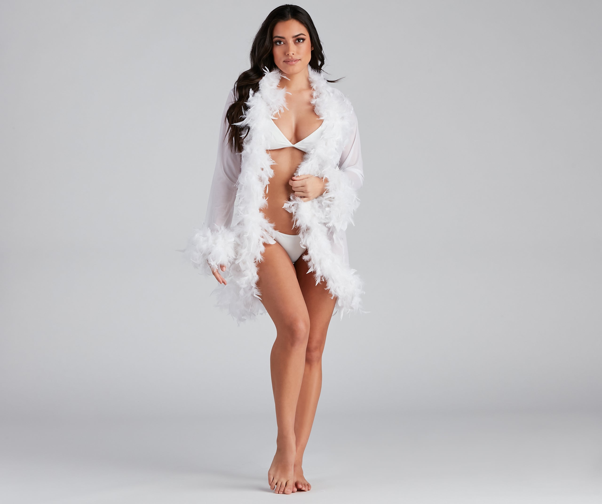 Take them to the candy shop in a robe that brings the sultriness! It features an open front with a ribbon tie. long bell sleeves. and a feathered maribou trim. The robe is composed of an unlined. sheer mesh fabric that offers a flowy fit and plenty of stretch. Whether you’re going for a sweet or naughty look. this robe is the perfect piece to pair with your favorite !