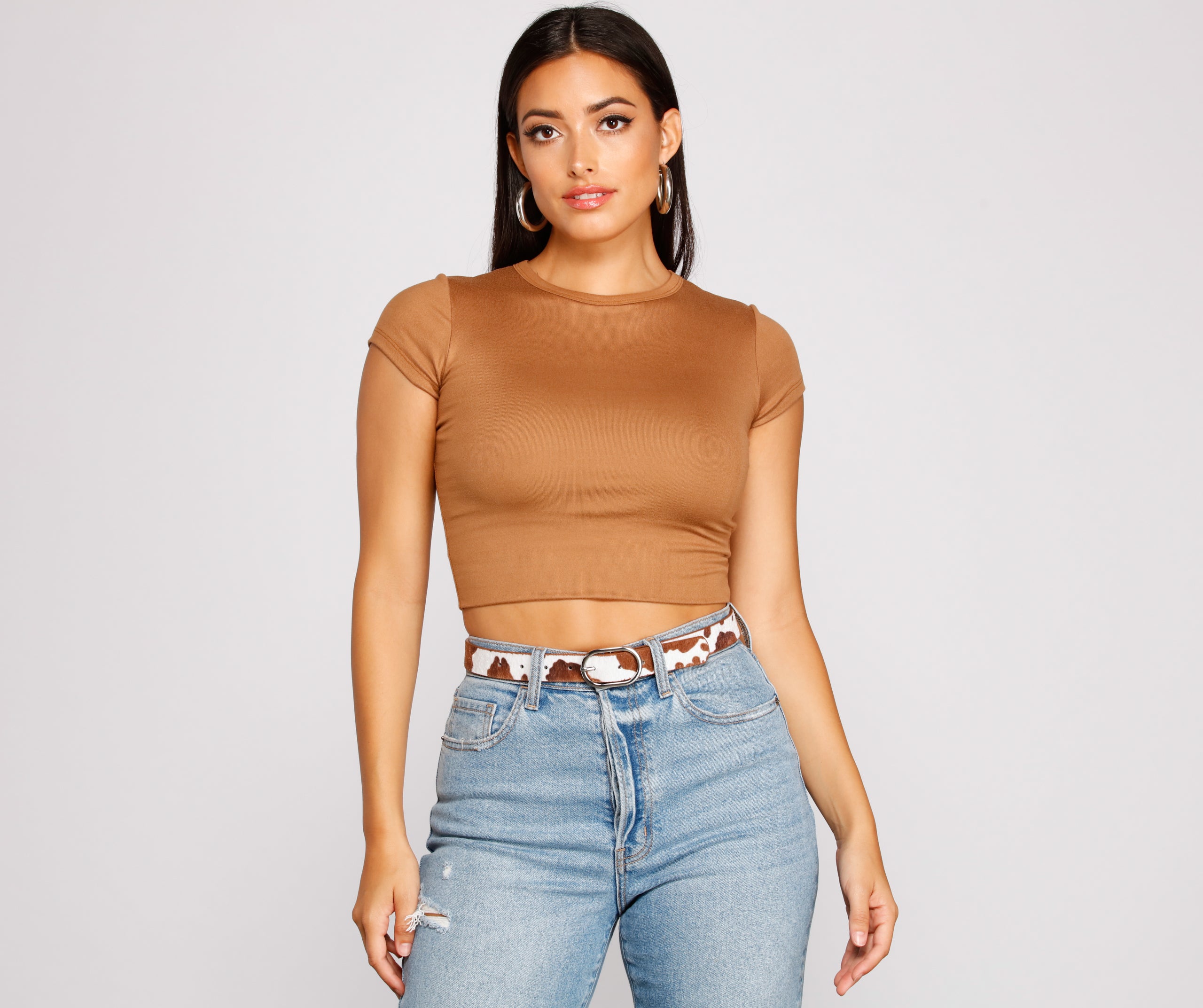 Keep it so sleek with a belt that keeps your look on-trend! The belt features a slim band. a cow print. and an adjustable metal buckle. The belt is composed of a faux leather material with a felt knit exterior. Complete look with high waist jeans.
