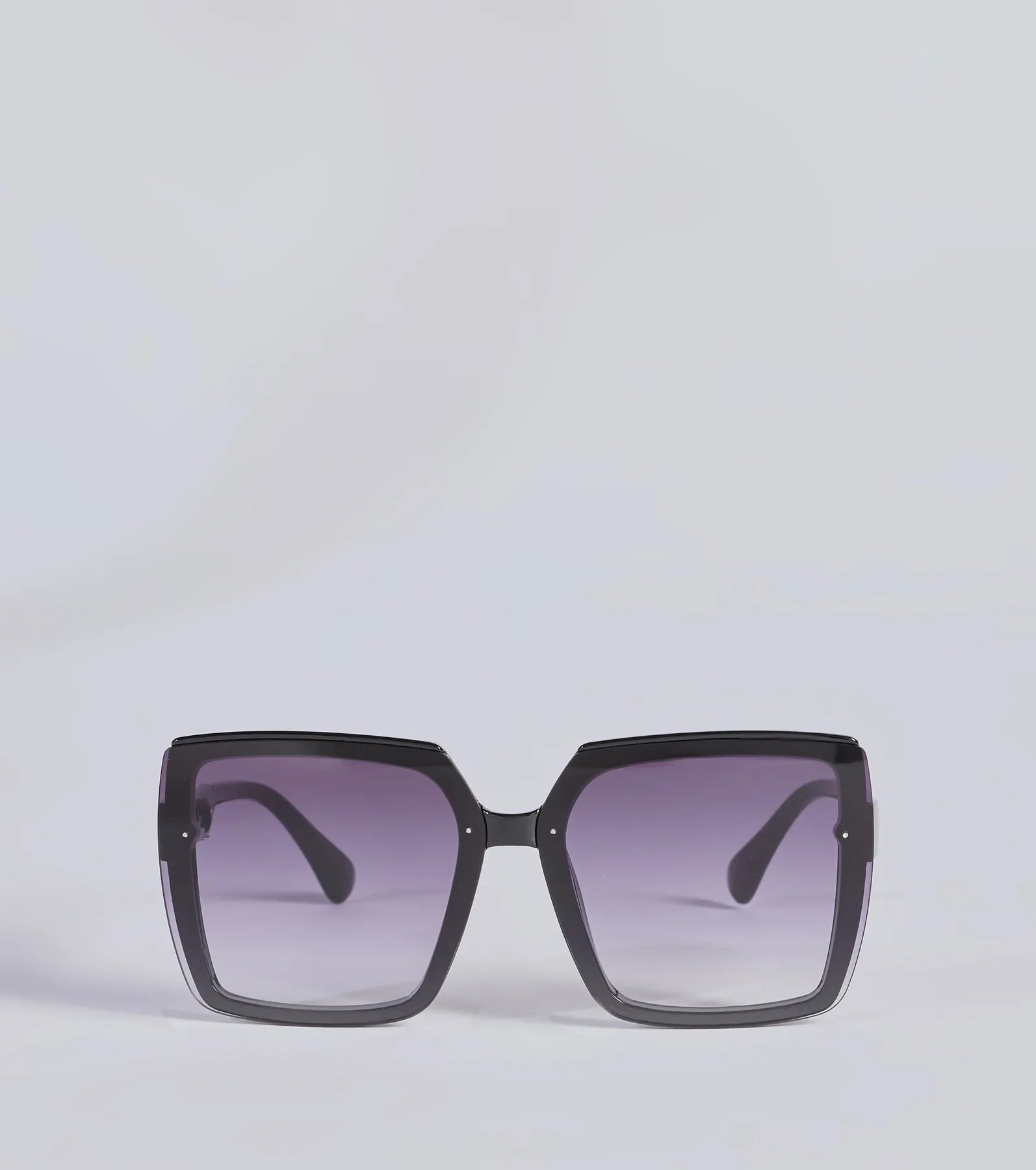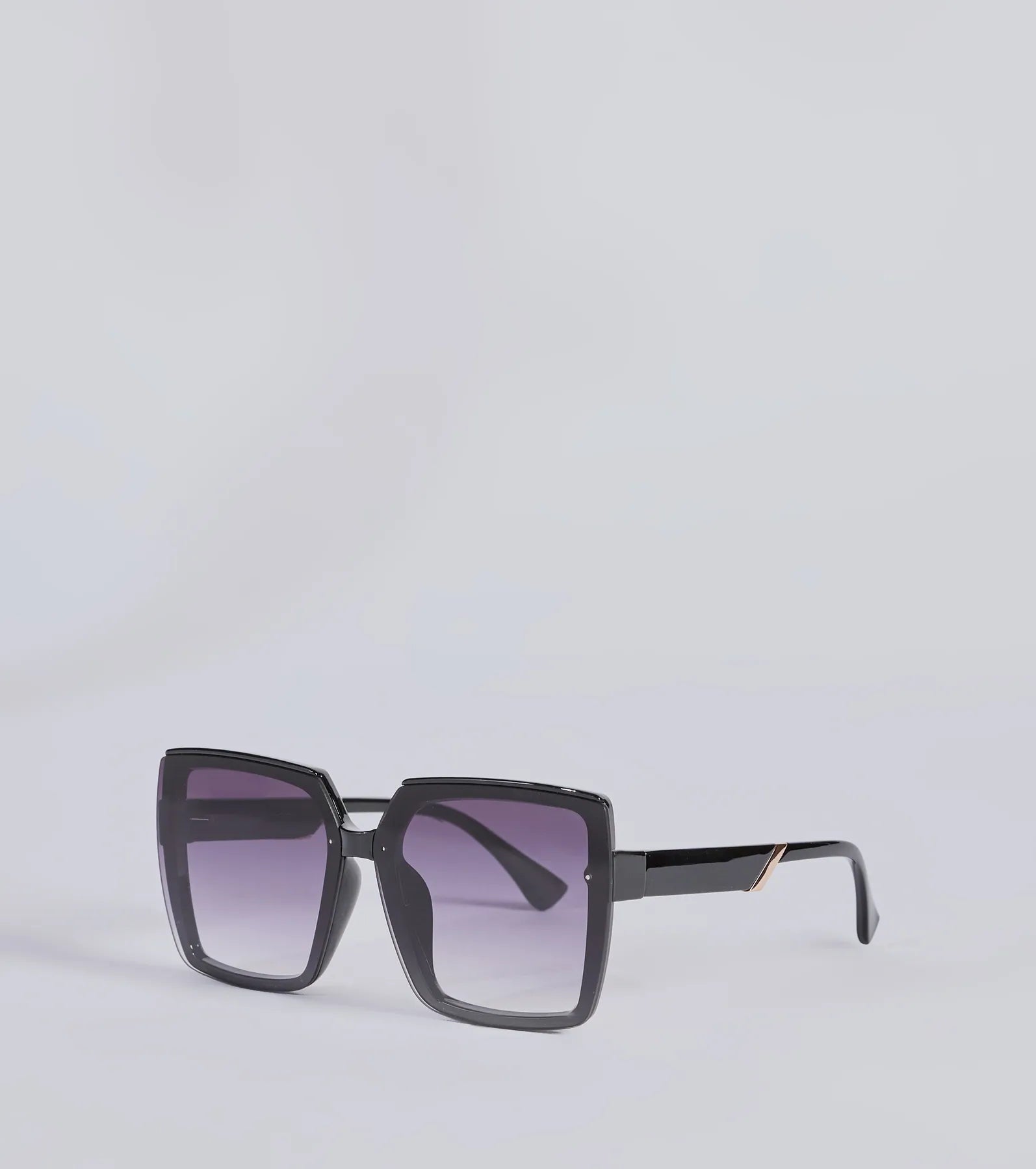 These sunglasses feature oversized and sleek rectangular lenses with UV protection. nose supports. and arm trim detailing. Perfect for everyday wear.