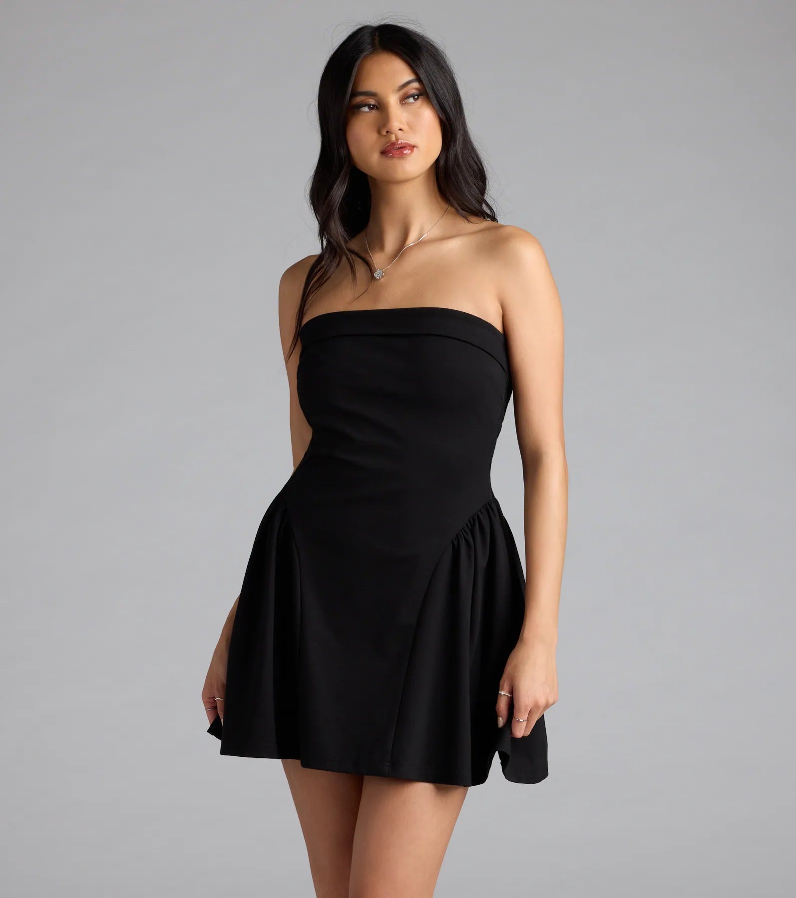 Short. sweet. and soiree-ready! Effortlessly chic and versatile. the strapless design and skater silhouette flatter your figure. while the mini-length hem adds a playful touch.