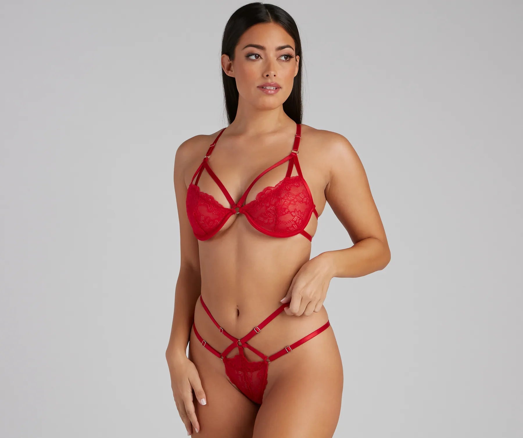 Bring the romantic sparks in this sultry sheer lace bra and panty set. The bra features sheer lace cups with a supportive underwire. a strappy caged front design. and adjustable spaghetti straps that lead to a back caged design. The matching panty features sheer lace fabric. high-cut adjustable straps. and a cheeky bottom. Style this set with a chic .