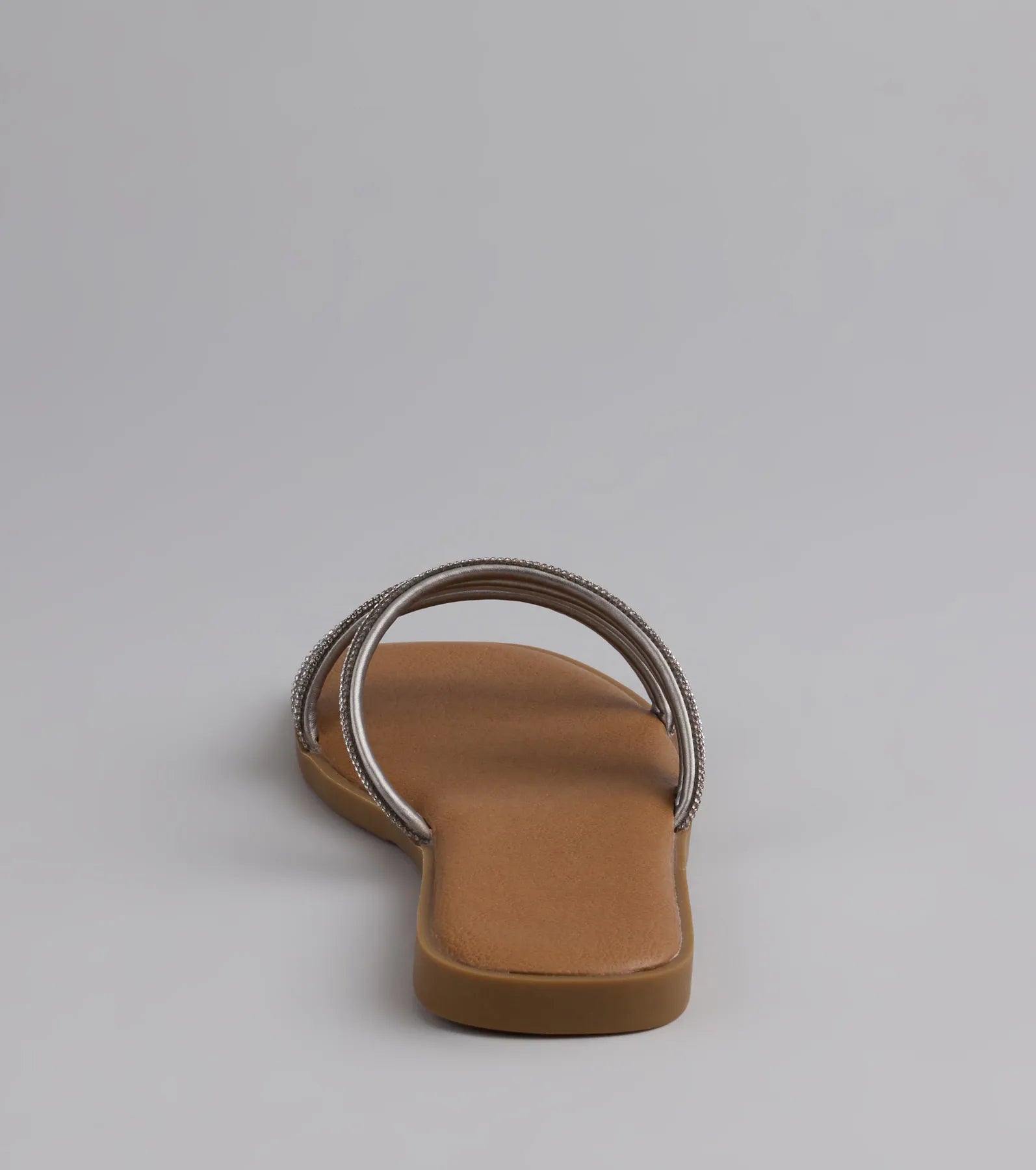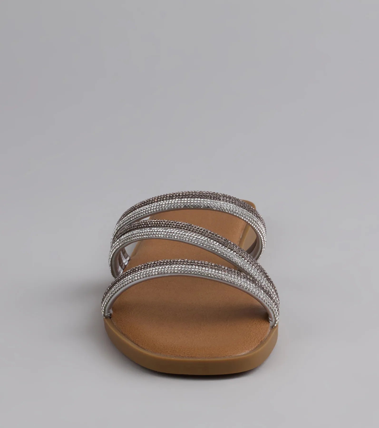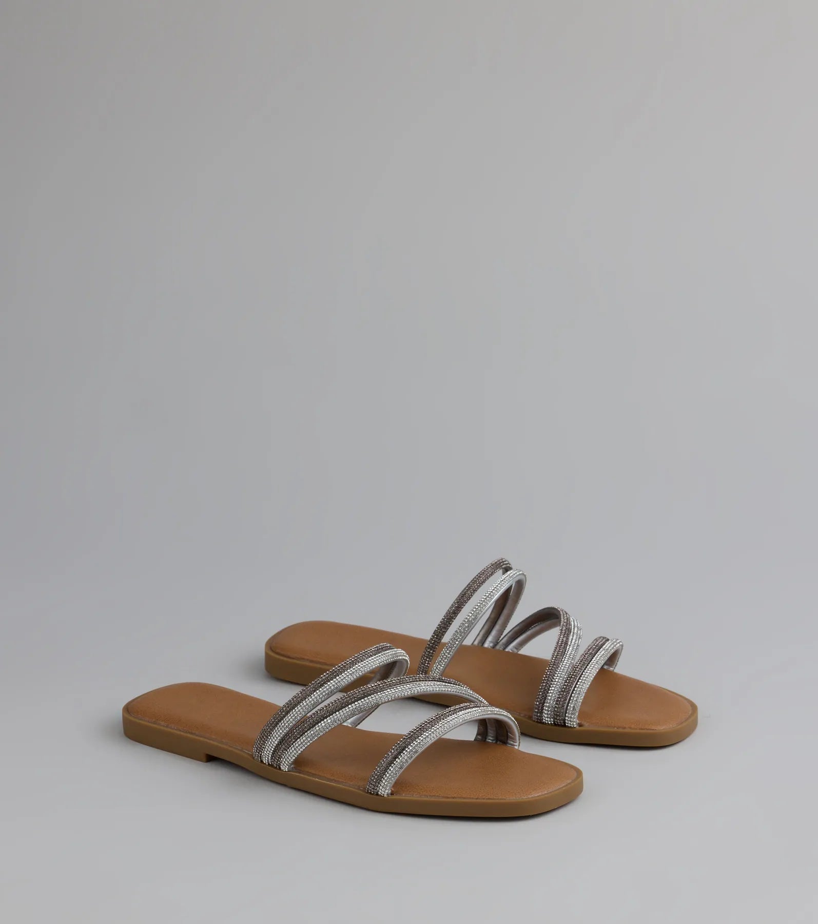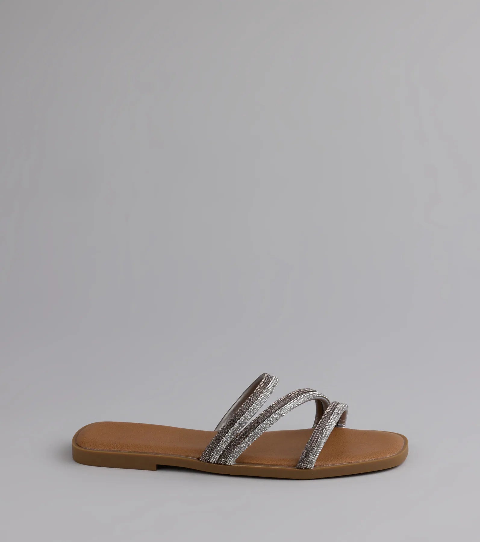 These sparkling sandals bring dazzling delight to any look! They’re designed in a rhinestone embellished strappy design and a flat sole for comfort.