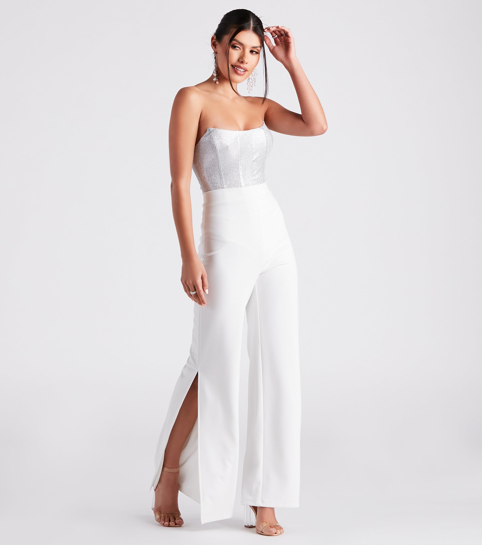 Hype up the night in this sparkly glitter bodysuit perfect for dance parties and celebrations! It features a strapless neckline. flexible boning inserts. a thong bottom. and dual snap-button closures. Pair with to complete the look!