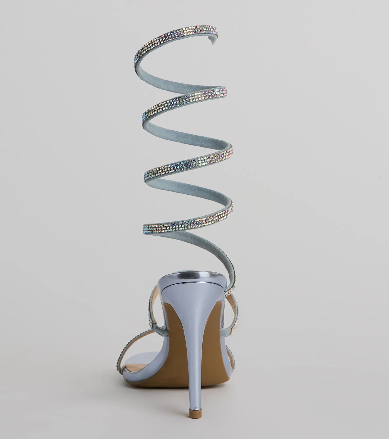 Step out to stand out in these rhinestone stiletto heels made to surprise everyone with your glamour! These stunning stiletto shoes feature an almond toe and rhinestone embellished straps for a touch of glamour. The unique spiral ankle design adds a modern twist. Complete the look with .