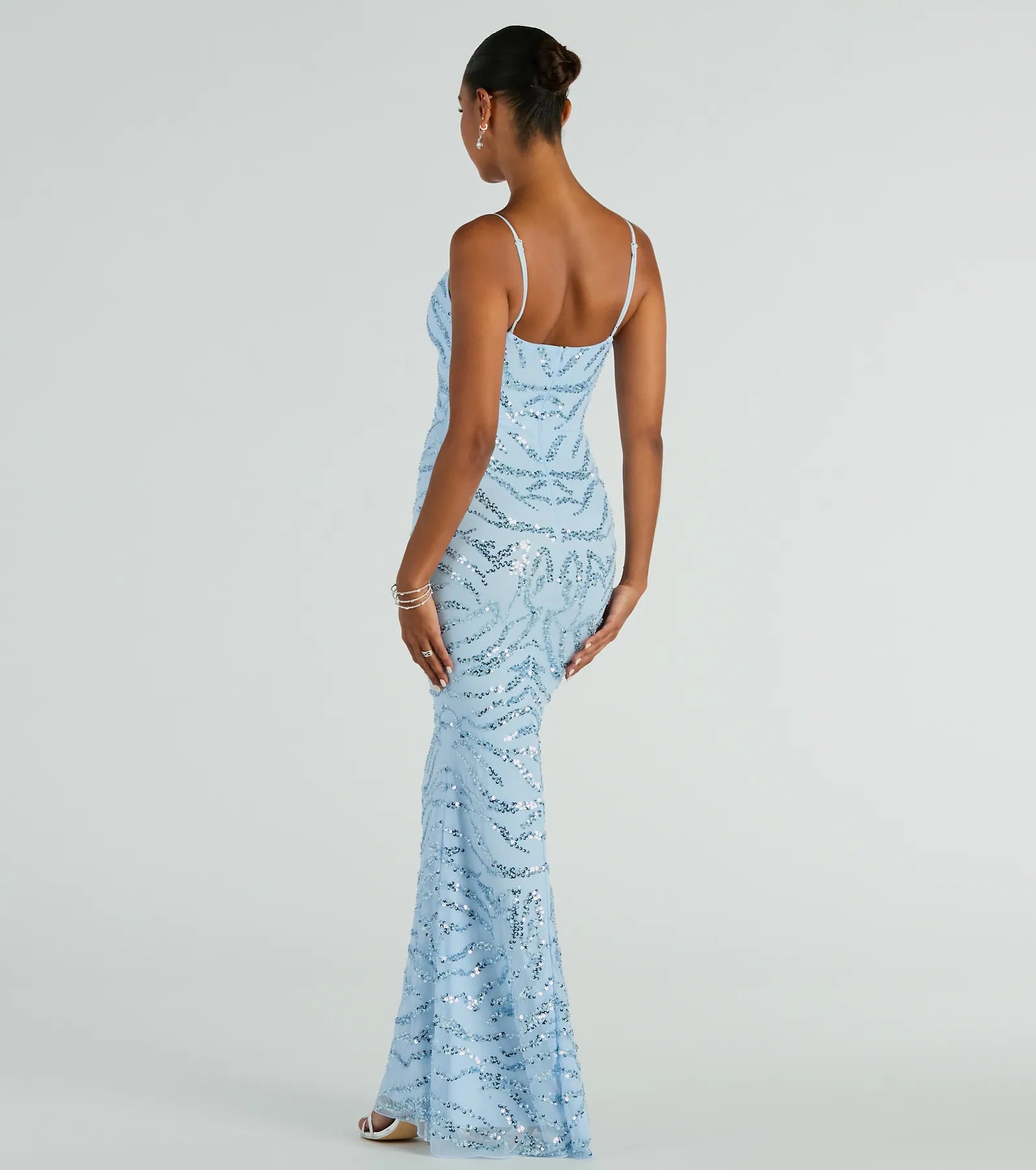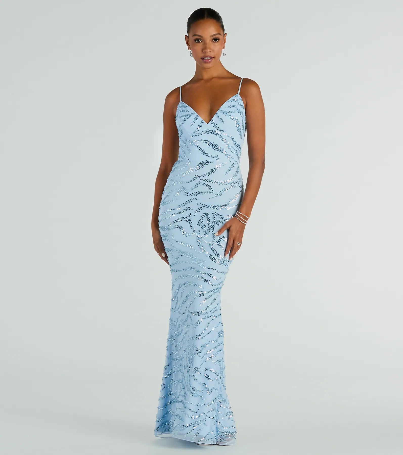 Embellished with sequins and delicate beading. the Stefannie mermaid formal dress is a stunning standout at school dances. banquets. and red carpet events! Adorned with sparkling sequins and a beaded striped pattern. crafted from luxurious mesh fabric. this dress is perfect for any formal occasion. The V-neckline and adjustable spaghetti straps highlight your figure while the mermaid silhouette and floor-length hem exude sophistication. Complete the look with a .