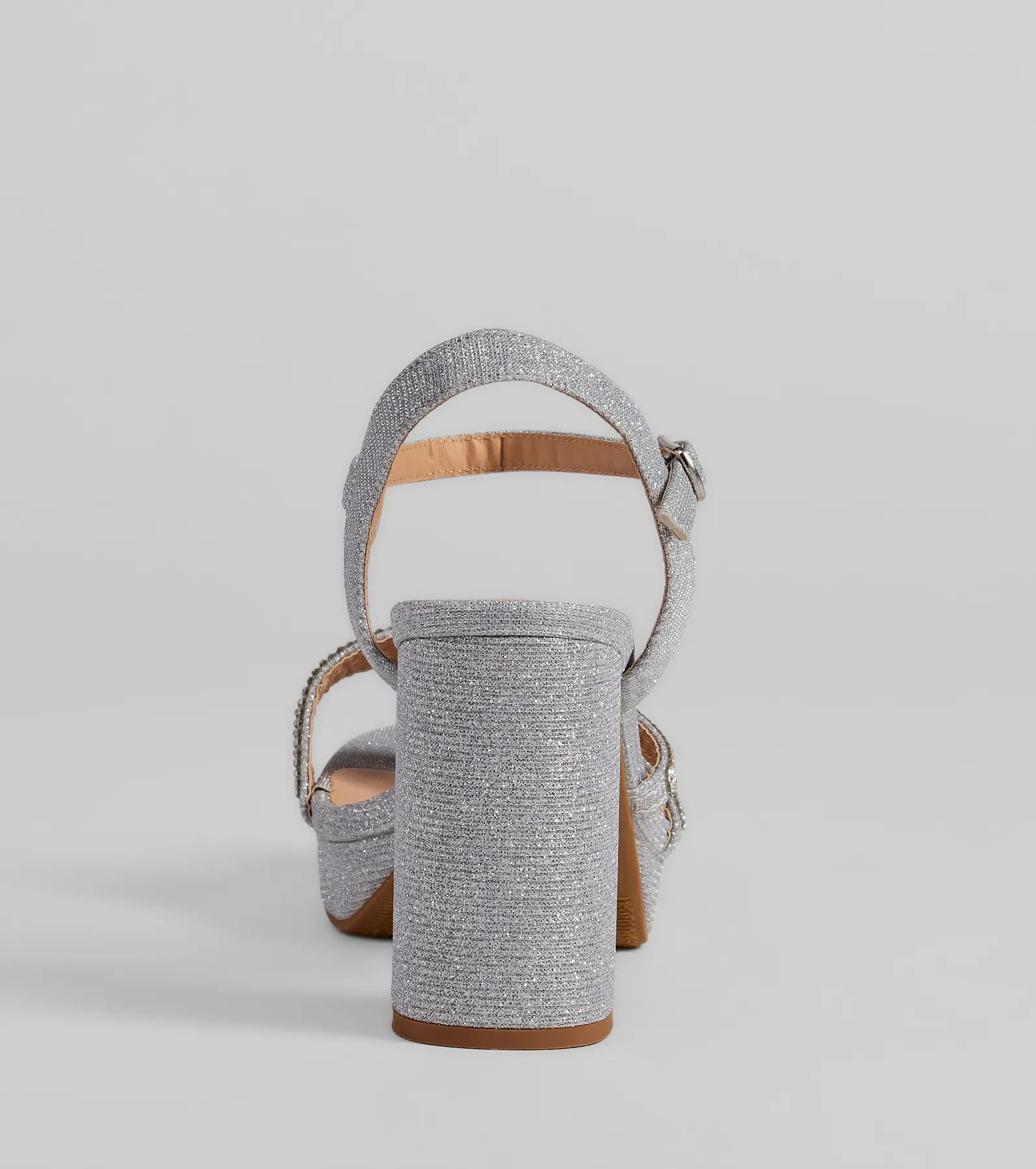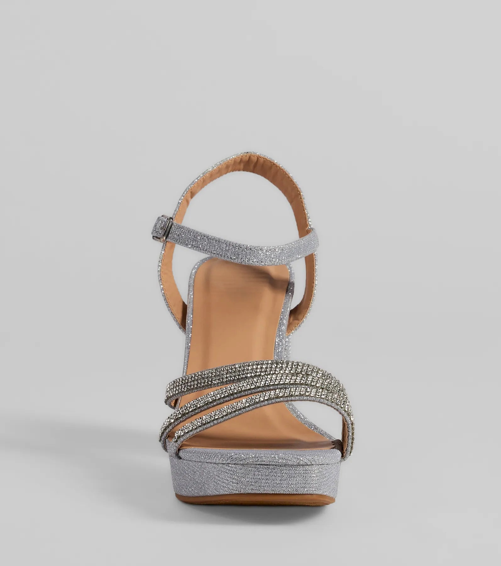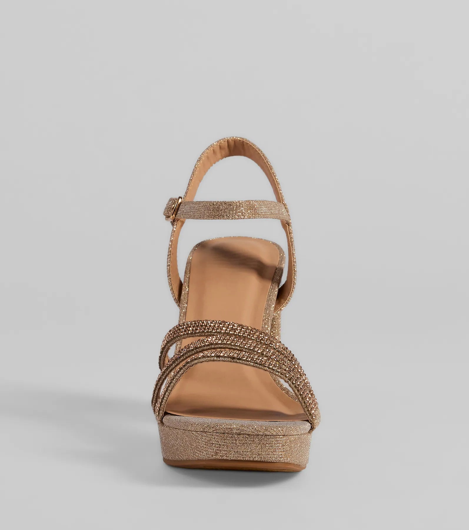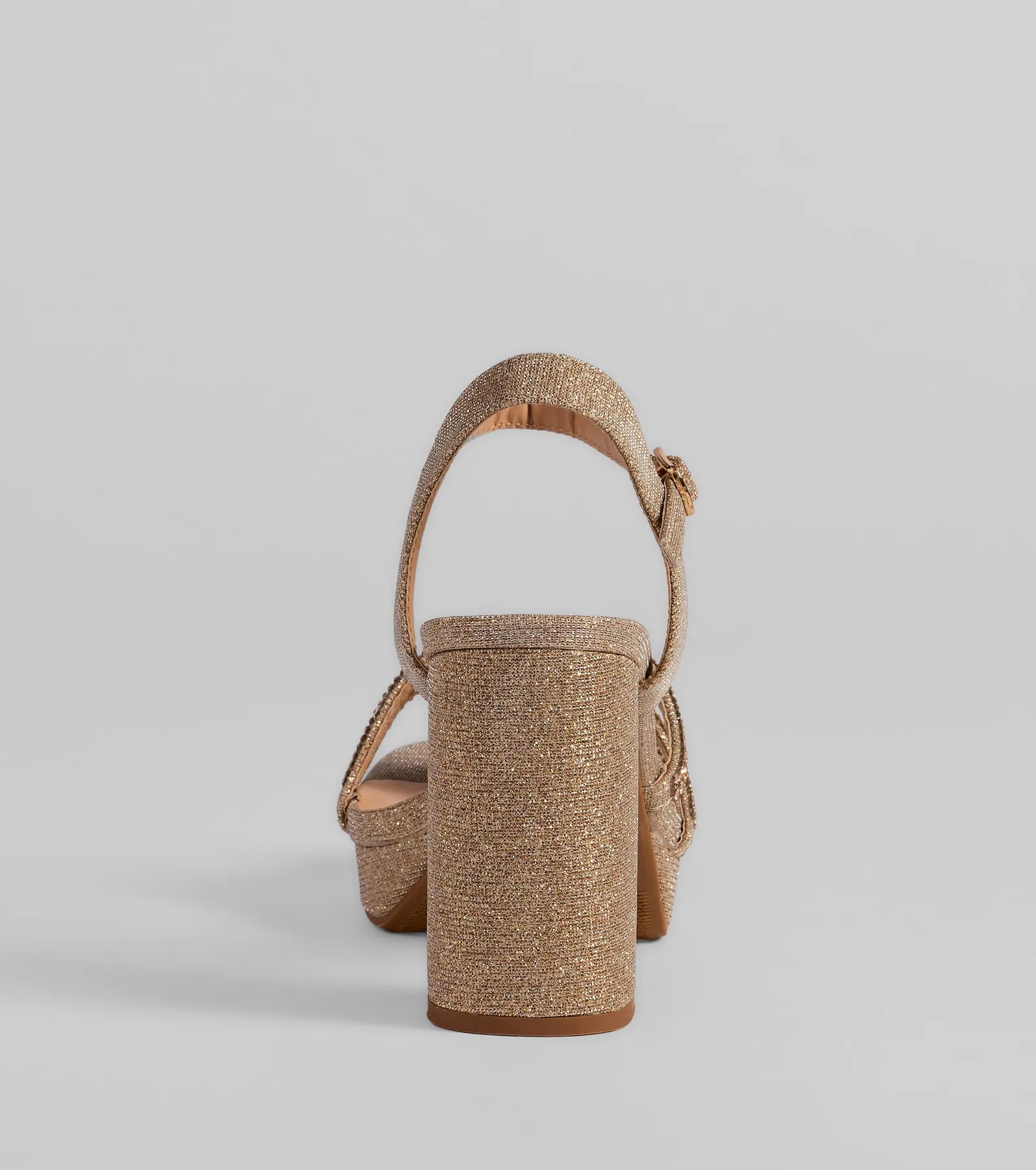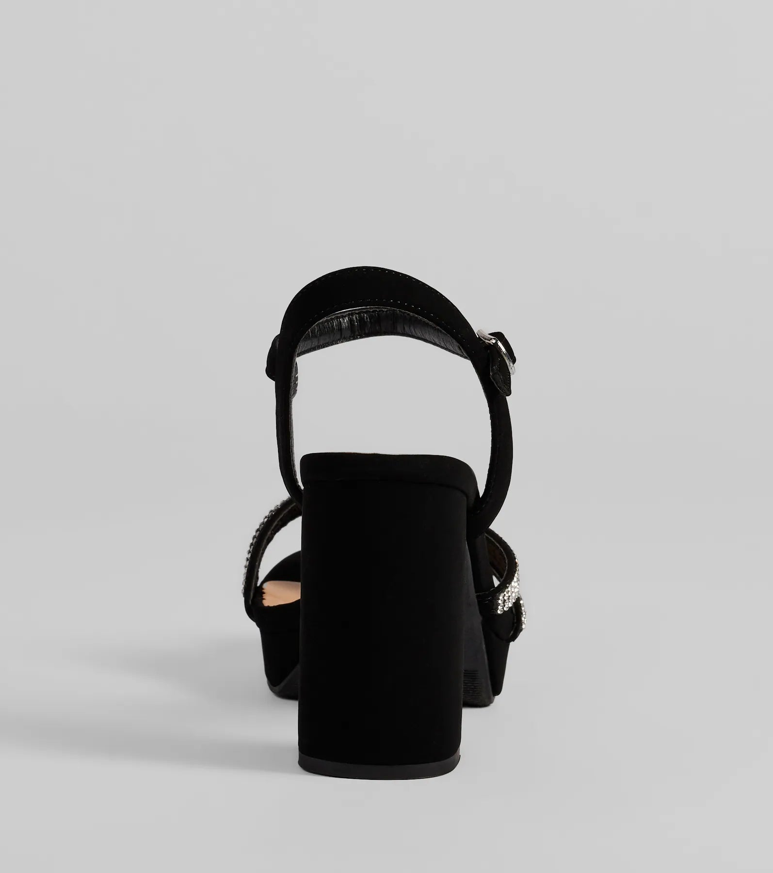 Step out for every dressy occasion in these block heels showcasing a glam rhinestone embellished strappy design and a platform sole that elevates the style. Pair with a handbag.