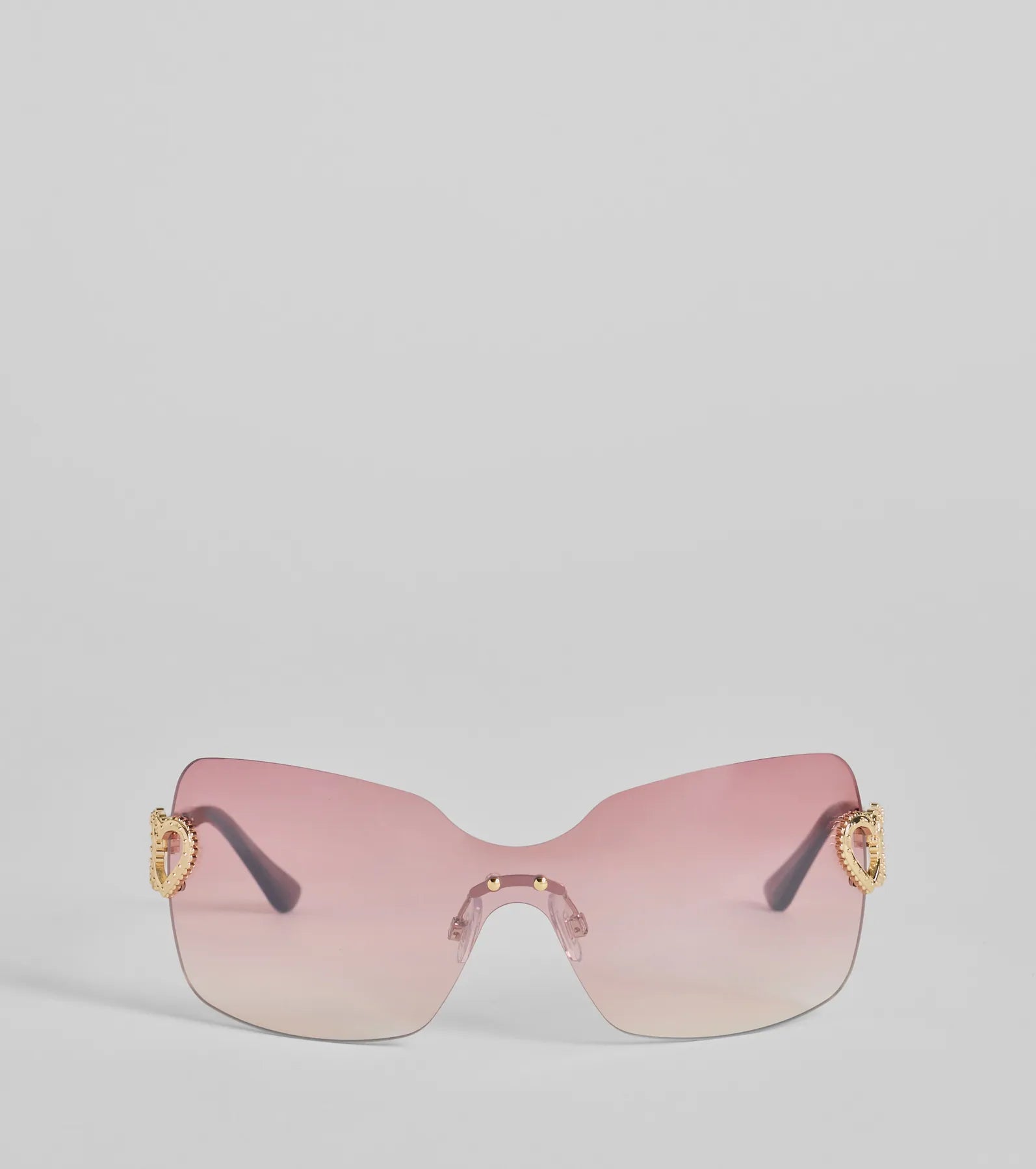 These shield sunglasses will steal your heart! They showcase side heart charms for a trendy vibe. oversized tinted lenses. rubber nose supports. and comfortable arms. Complete the look in a cute .