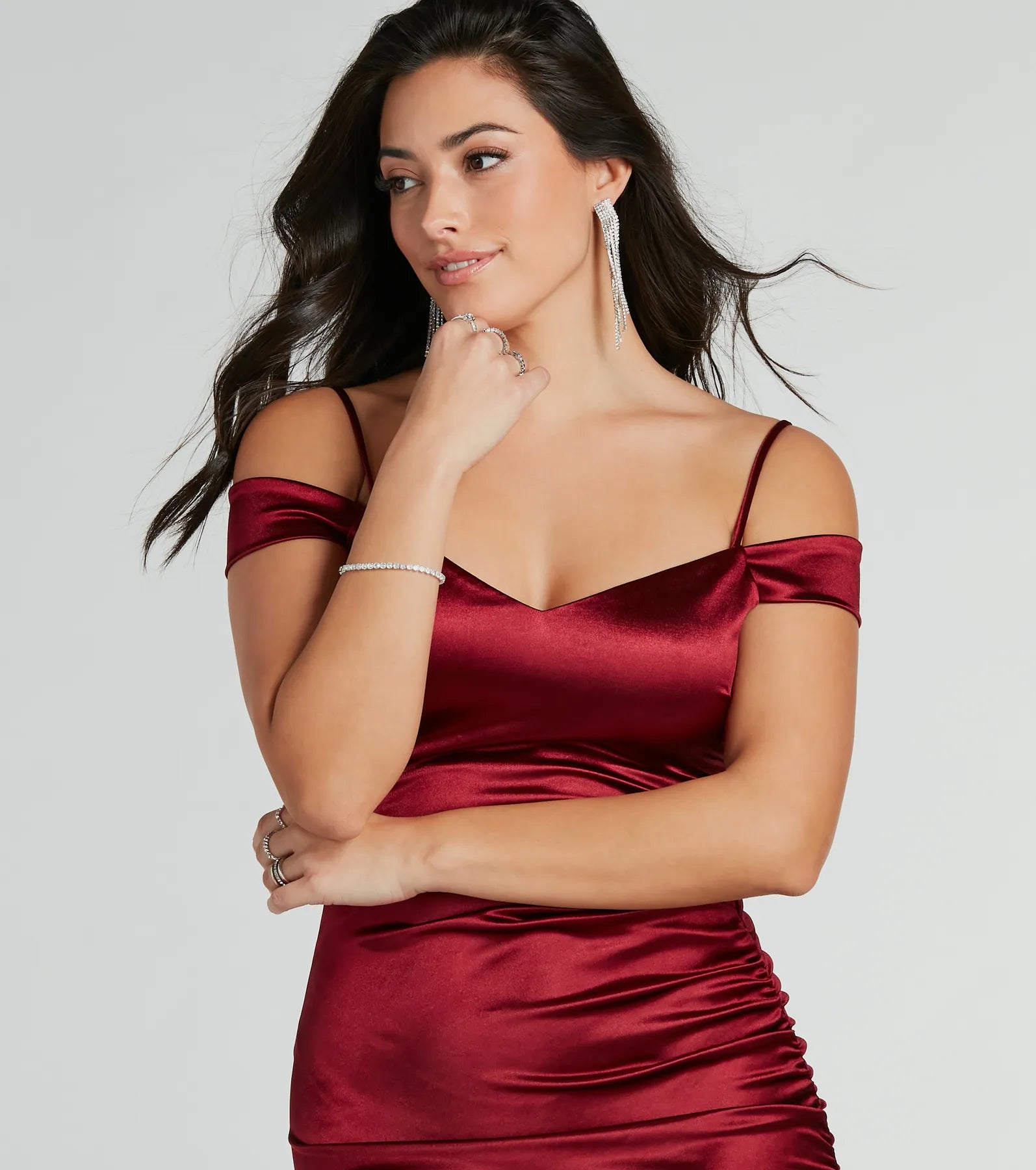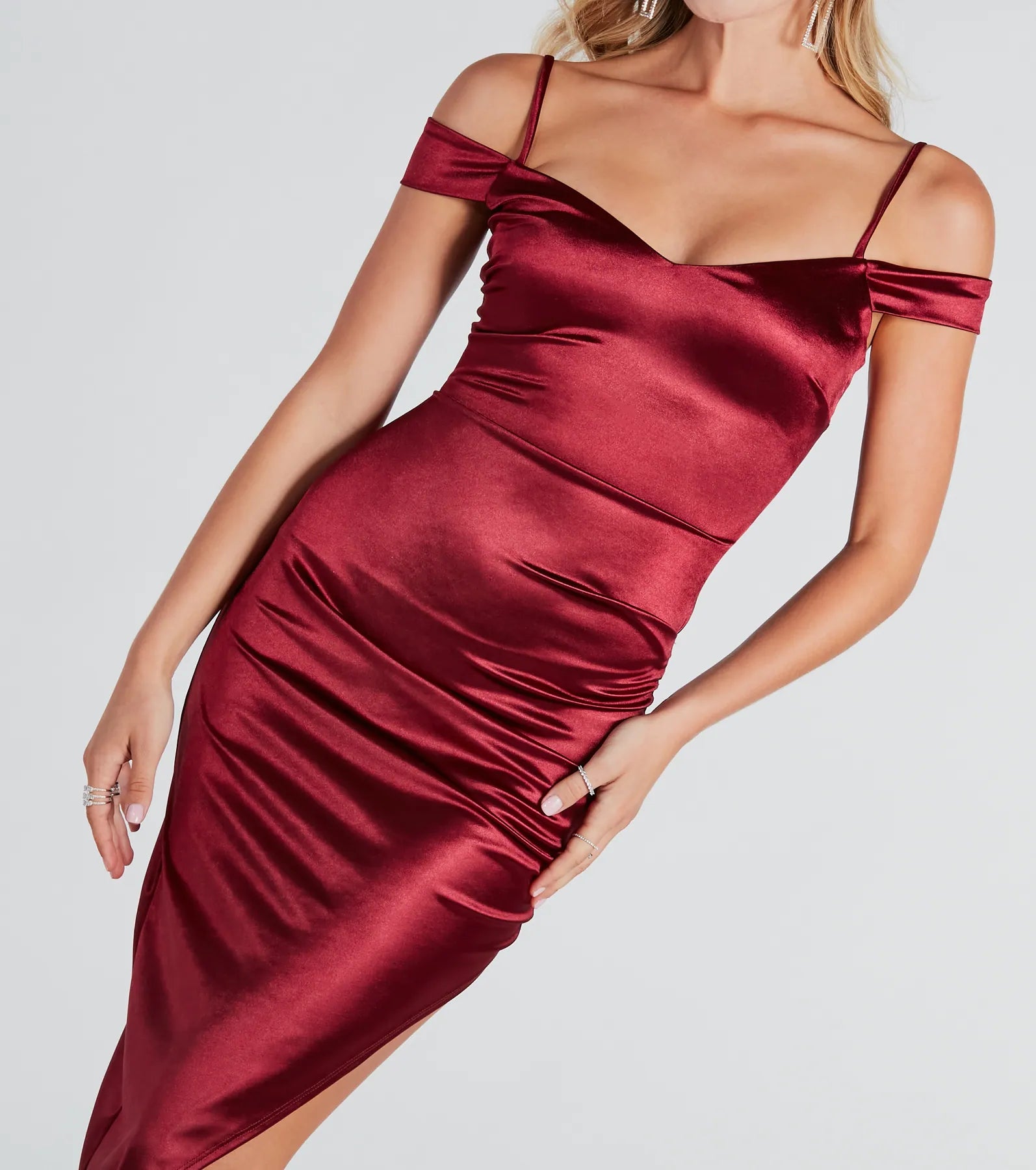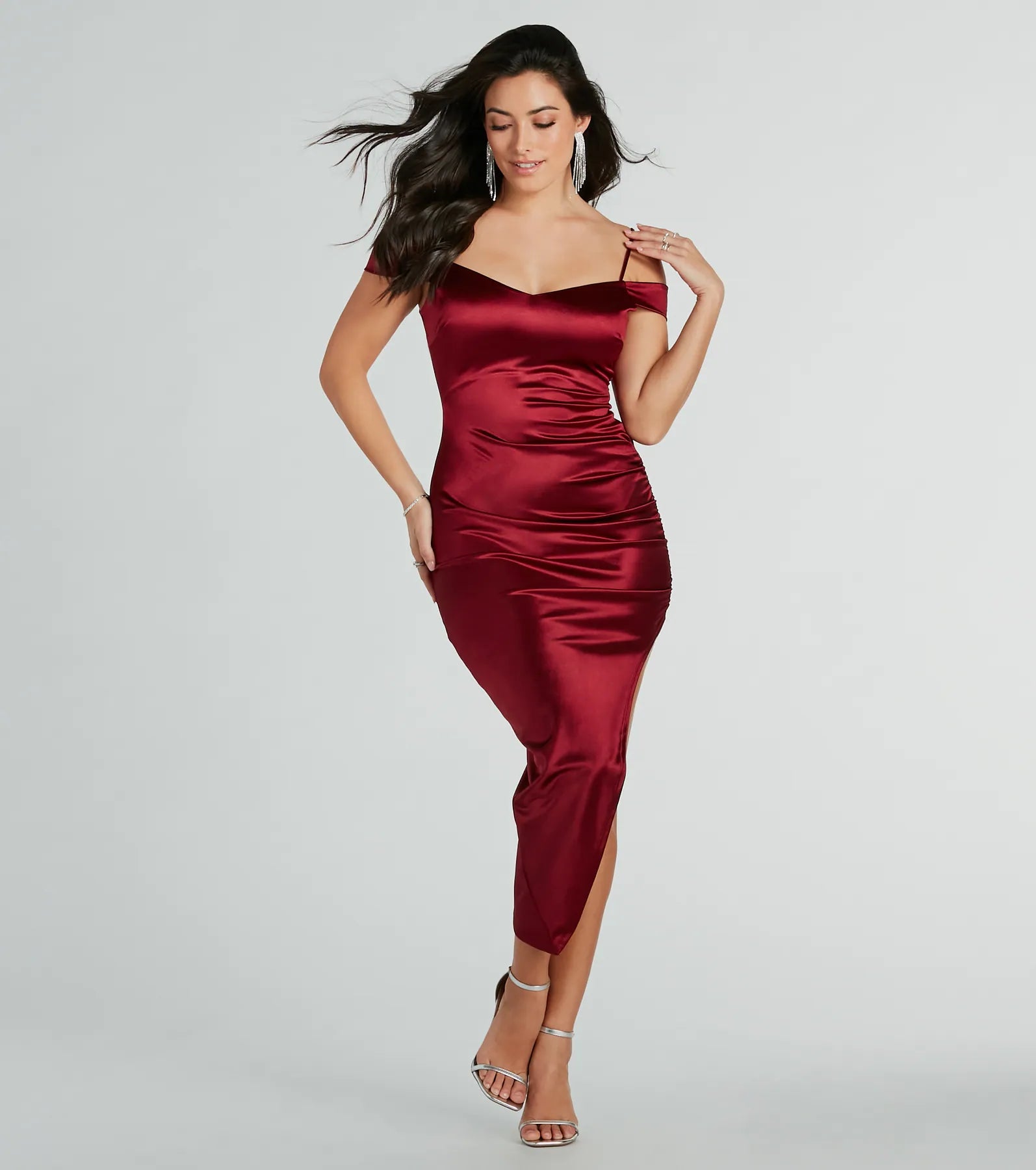 This satin midi dress ensures you’ll make a stunning arrival at parties and dressy occasions! Crafted from luxe satin fabric. the midi-length dress features an off-the-shoulder V-neckline. short-sleeve cuffs and spaghetti straps. a form-hugging silhouette. and a front ruched seam that leads to an asymmetrical cut hem. Complete the look in .