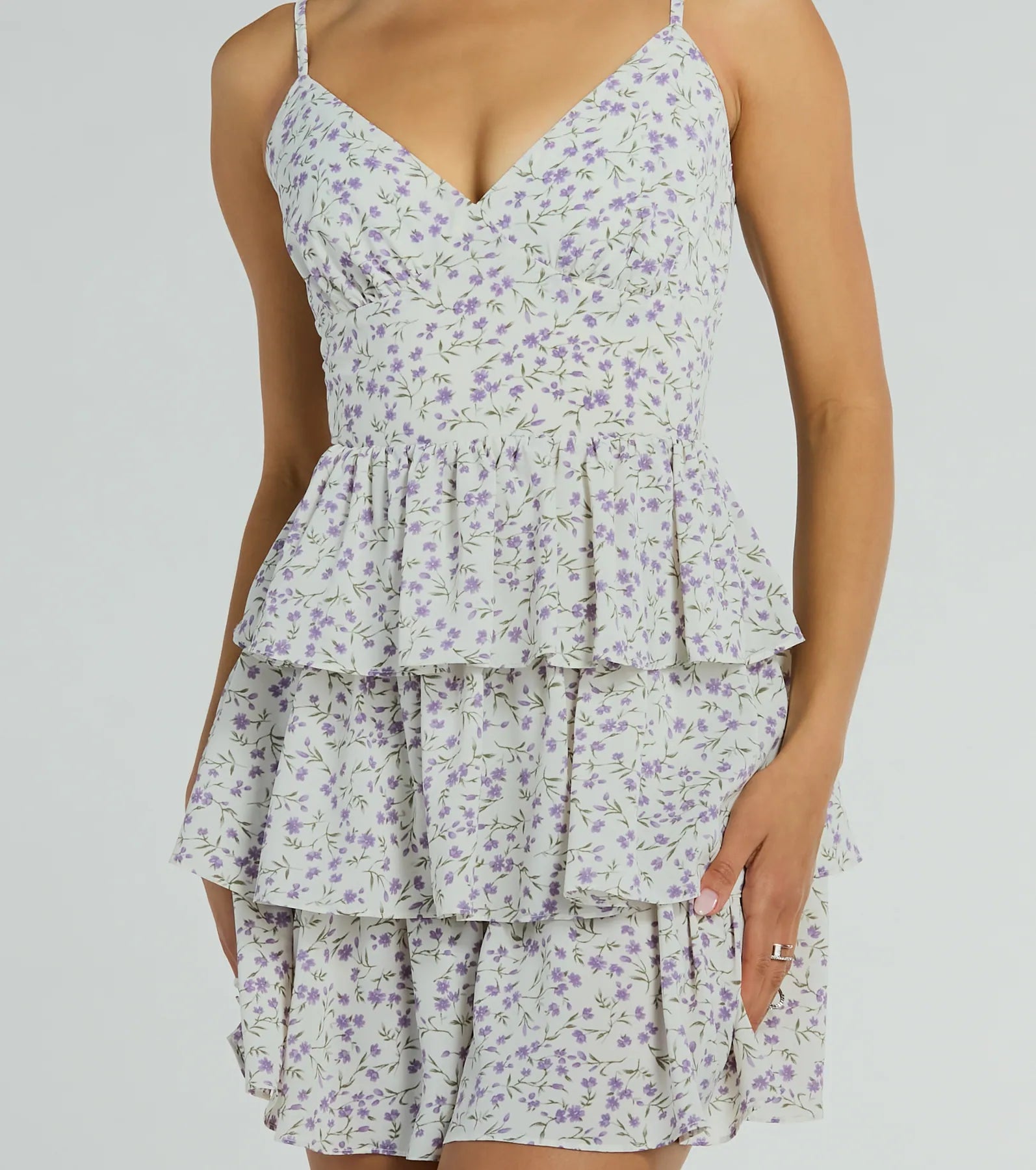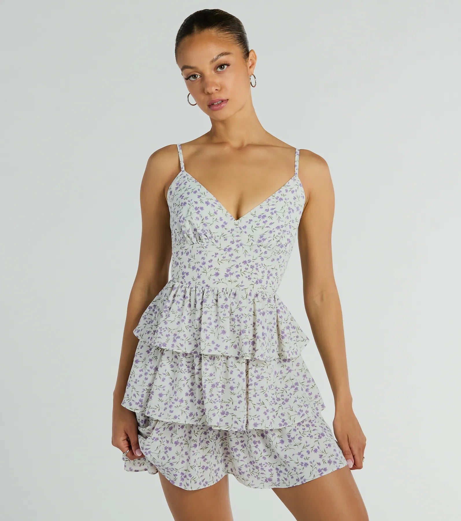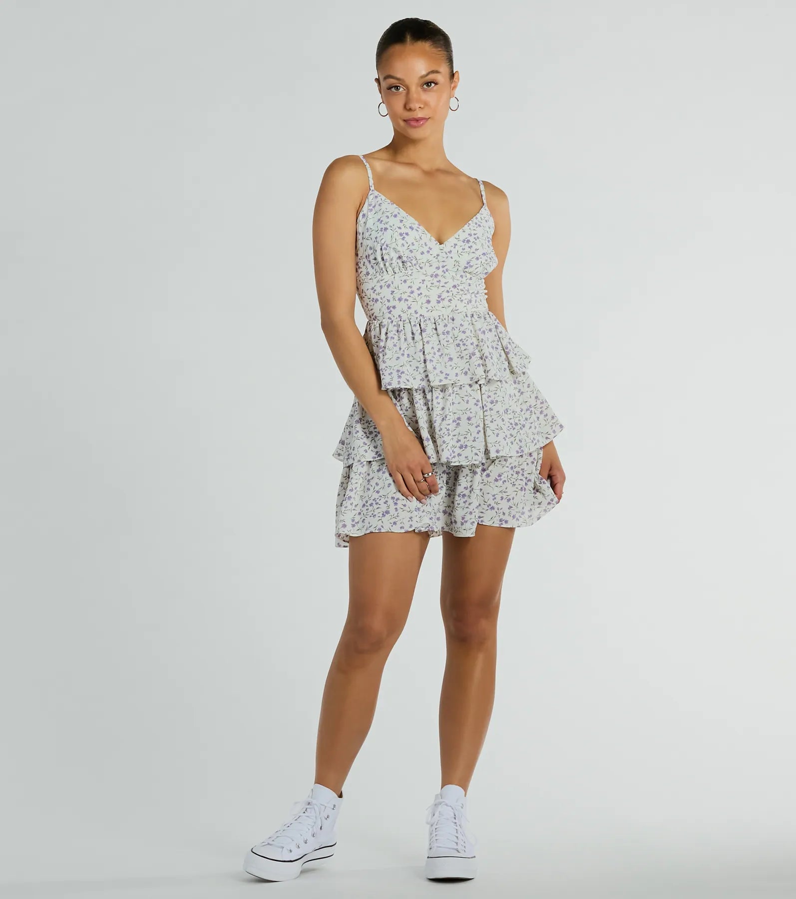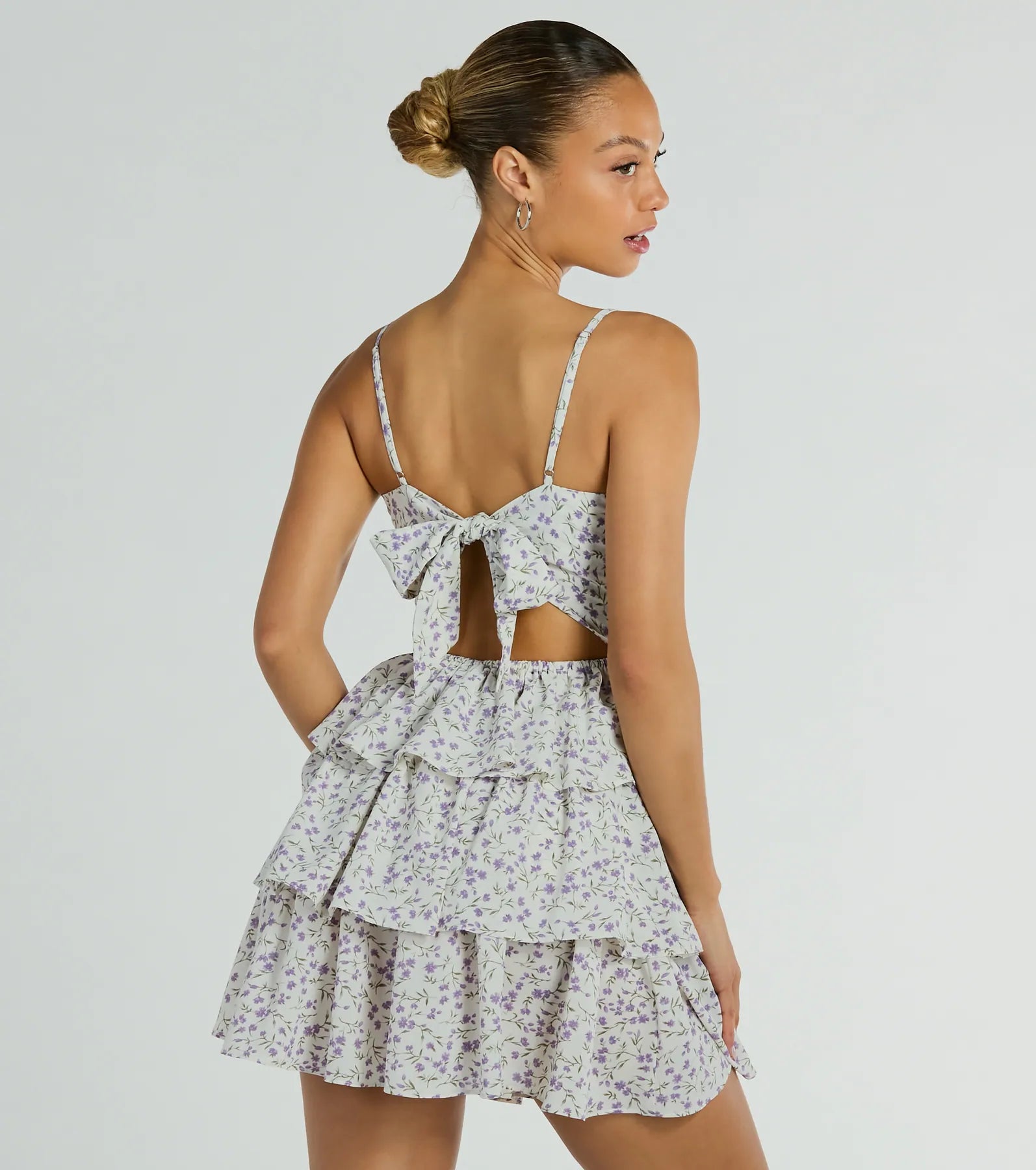 Embrace your inner charm in this floral skater dress at showers or birthdays! The flattering V-neckline and adjustable spaghetti straps provide a perfect fit. while the tiered ruffled skater silhouette adds a touch of feminine flair. With its tie-back design. short-length hem and beautiful floral print. this dress will make you feel effortlessly stylish. Complete the look in and earrings!