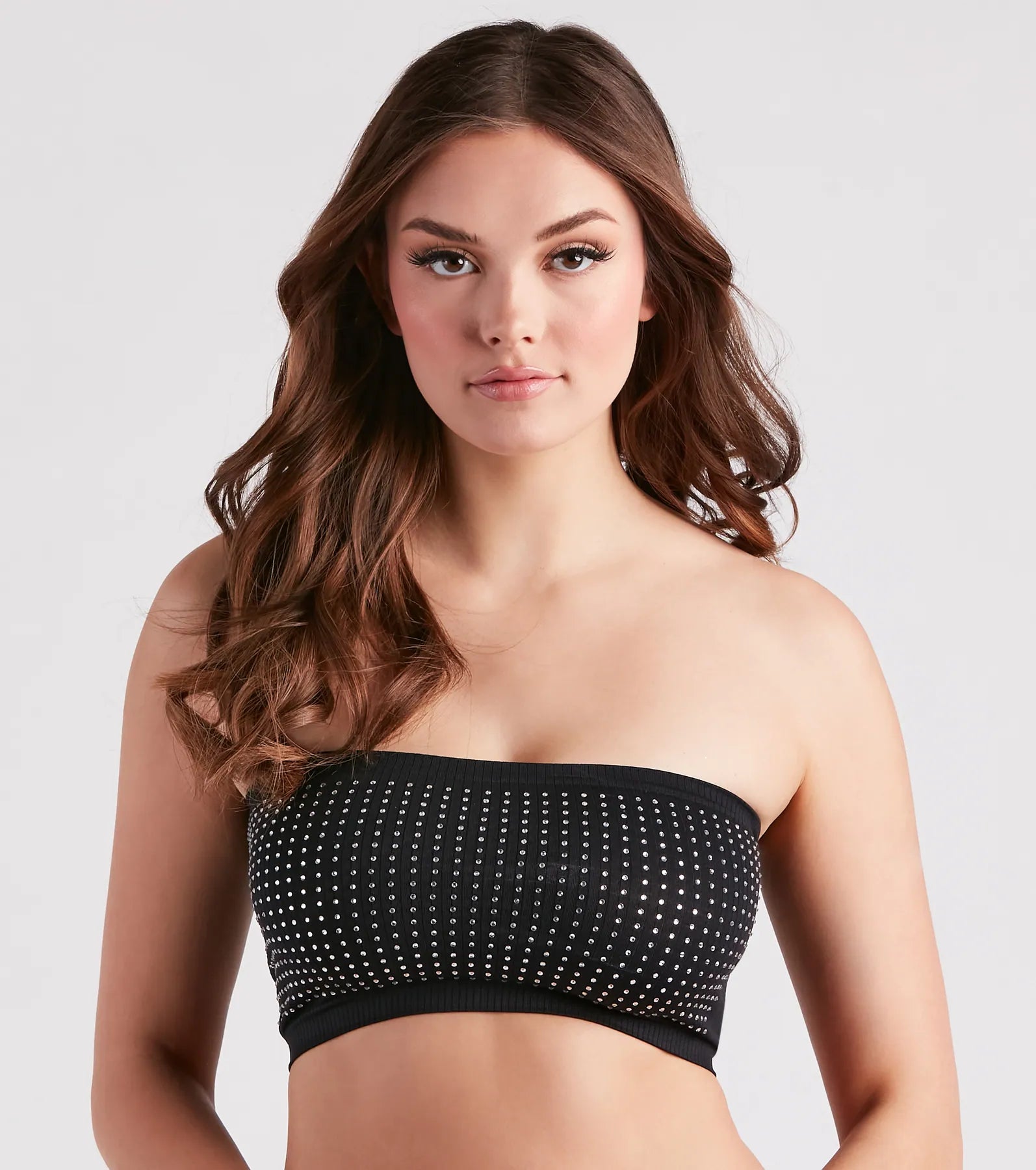 Elevate your outfit in this subtle glam bandeau featuring rhinestone embellishments. a seamless design. and a soft and comfortable fit. Complete the look in a semi-sheer and high-rise pants.?
