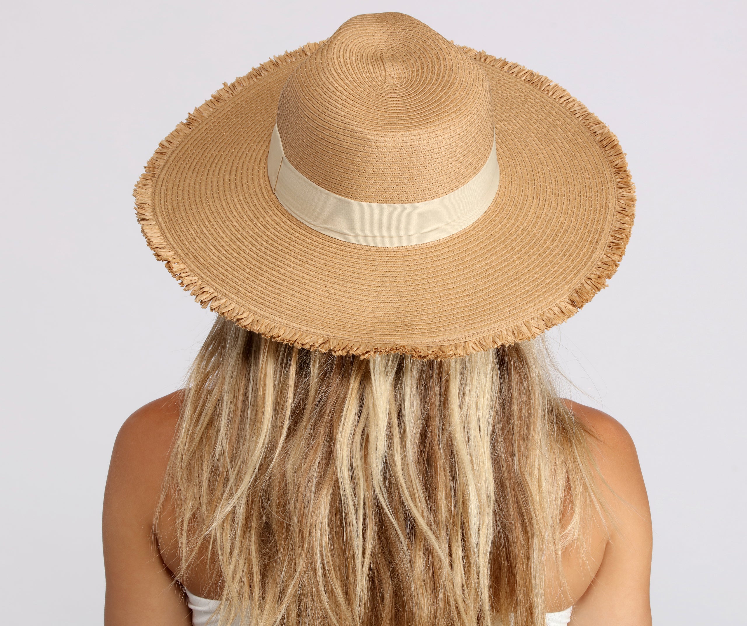 - Wide brim with fringe edges